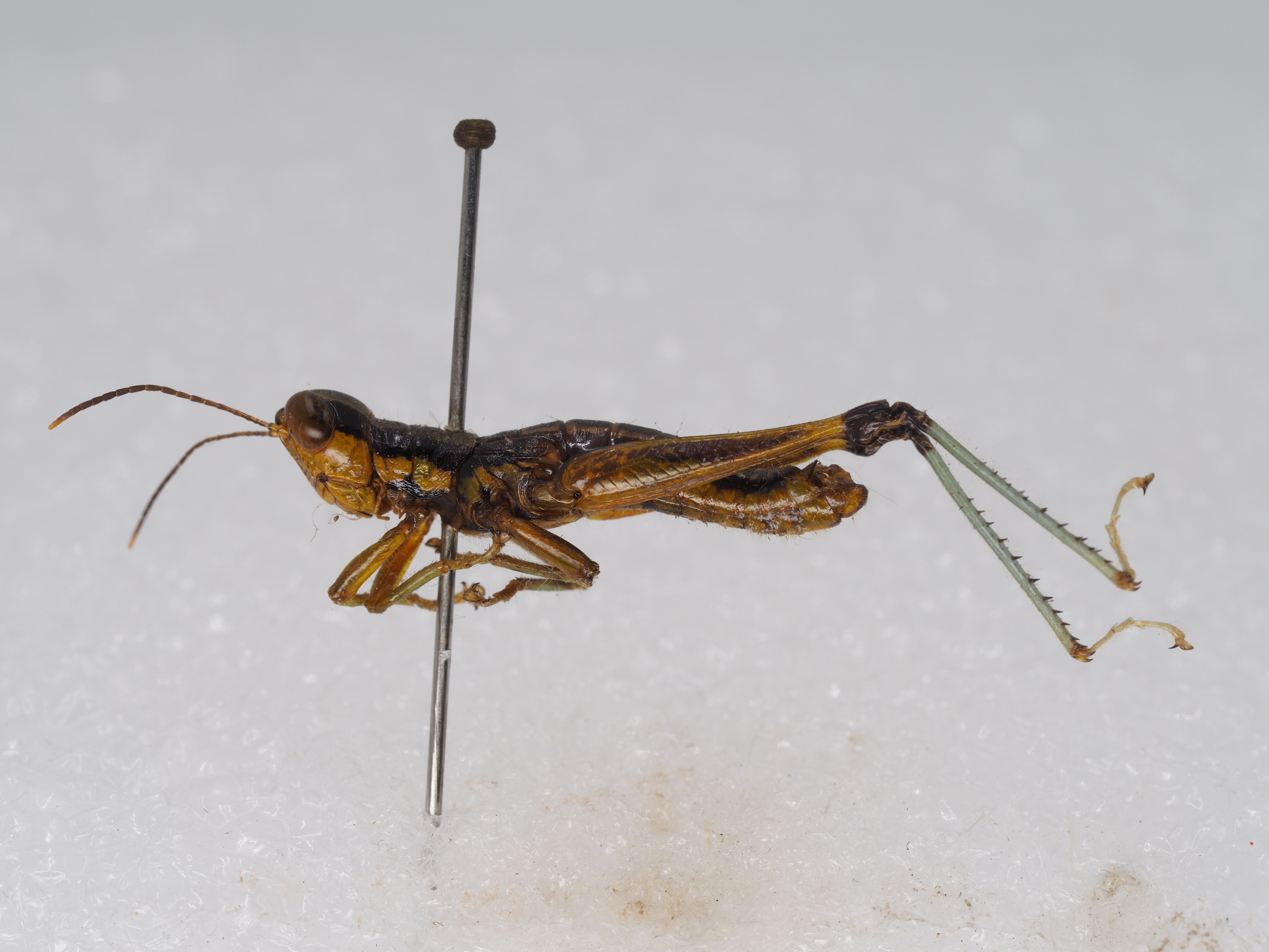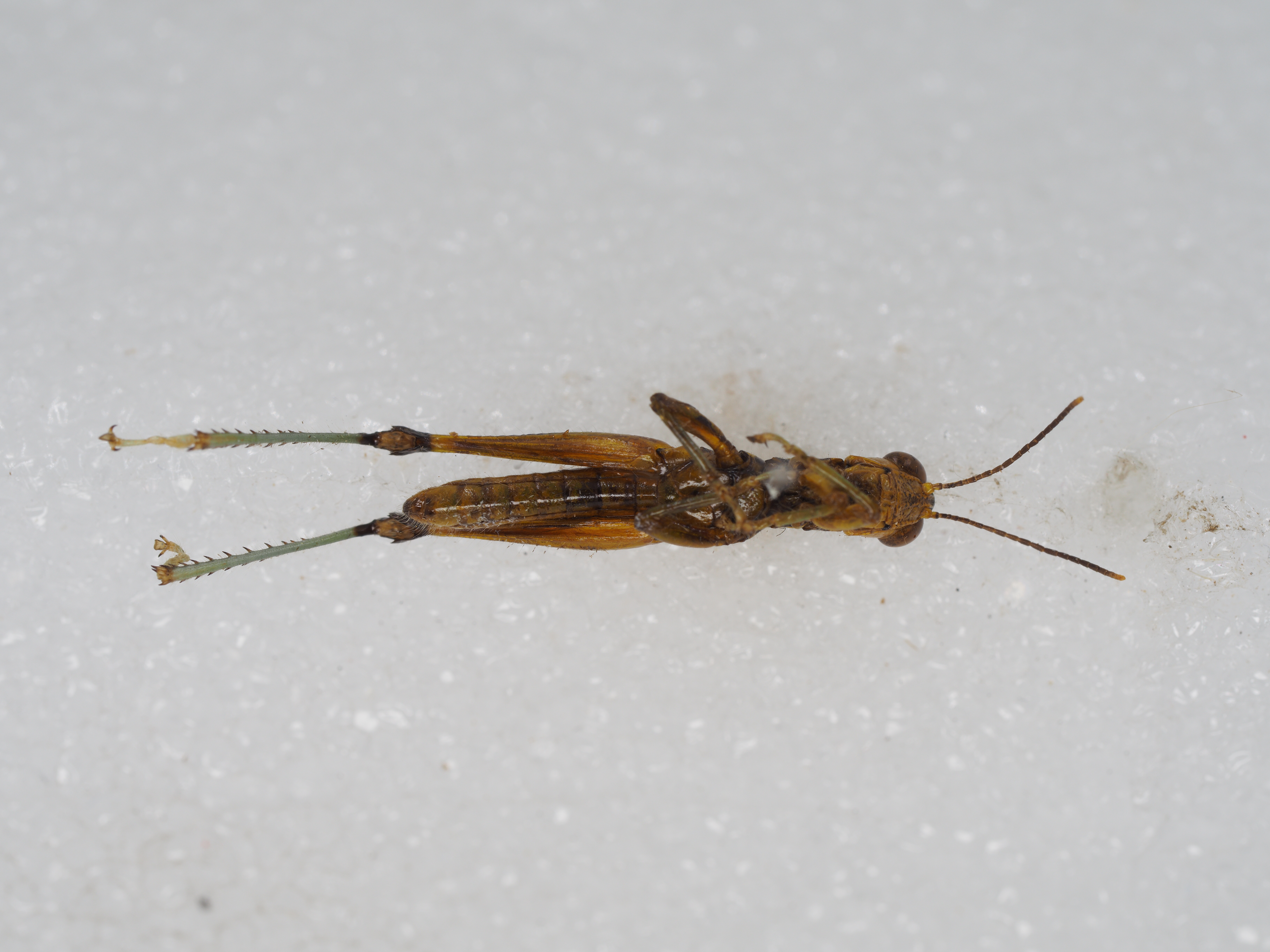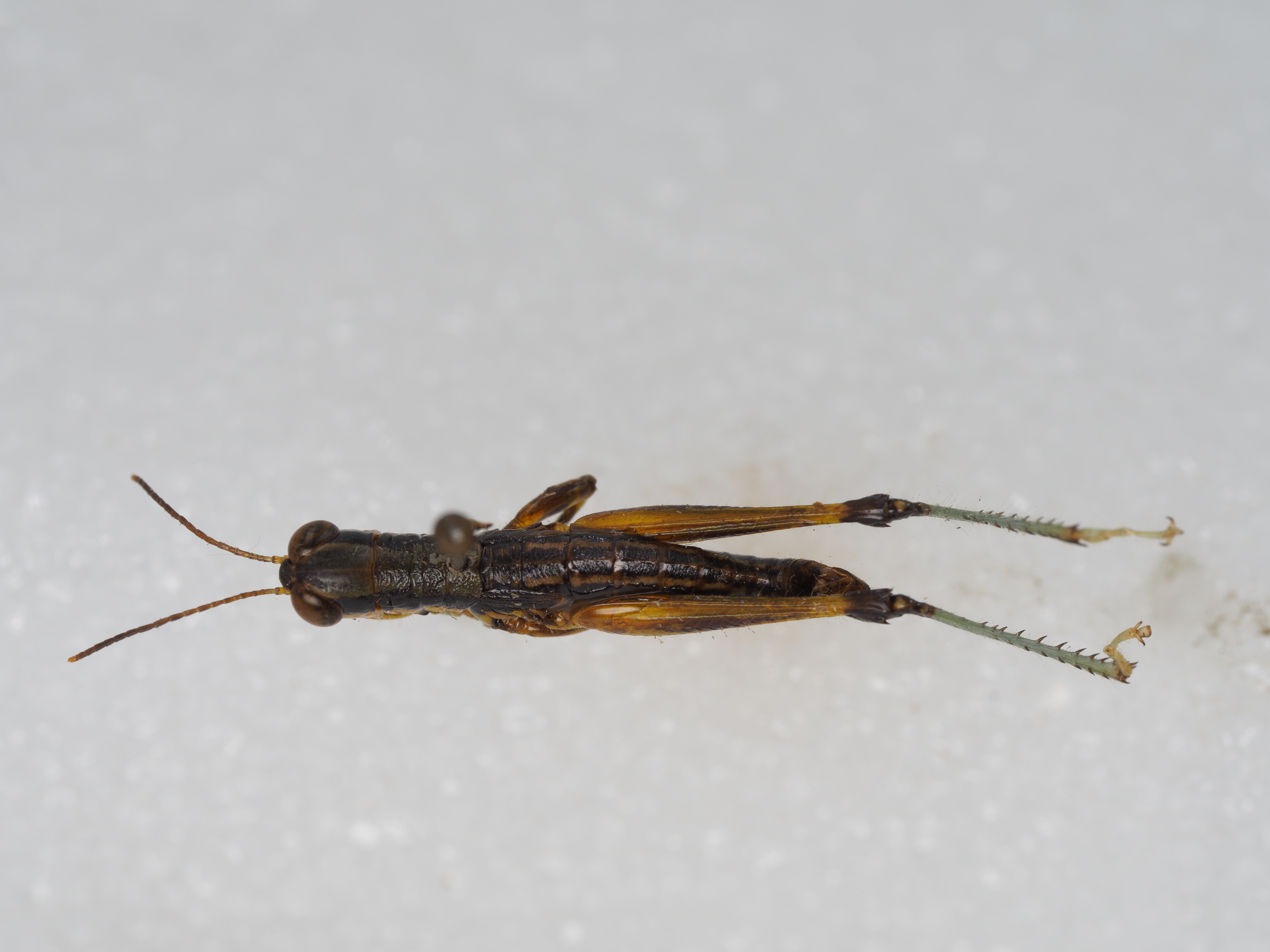 描述:雄性 体小型。头顶突出较短,在复眼前最宽处为其长度的2倍,眼间距的宽度大于颜面隆起在触角间宽度的1.7~1.85倍。颜面侧观向后倾斜,颜面隆起侧缘平行,全长具狭的纵沟。复眼卵圆形,复眼的垂直直径为横径的1.3倍,而为眼下沟长度的2.6倍。触角丝状,超过前胸背板的后缘,中段一节的长度为宽度的3~3.2倍。前胸背板圆柱形,前缘弧形,后缘中央凹陷;中隆线极细,较不明显,缺侧隆线;后横沟位于近后端,沟前区的长度为沟后区长的2.5倍。前胸腹板突圆锥形,顶端较尖。中胸腹板侧叶间中隔的长度为最狭处的2倍。后胸腹板侧叶在后端毗连。前翅狭长,鳞片状,侧置,到达第1腹节背板的后缘,其长度为宽度的3.13~3.5倍。后翅甚微。后足股节匀称,长为宽的5.5倍;上侧之中隆线平滑,顶端形成刺状;下膝侧片顶端尖锐。后足胫节外缘具刺10个,内缘具刺11~13个,具外端刺。鼓膜孔宽卵形。雄性腹部末节背板后缘具小尾片。肛上板盾形,基半中央具浅纵沟。尾须短锥形,略超过肛上板的顶端。下生殖板短锥形,端部钝圆。阳具基背片具二对冠突,内冠突极小,锥形。