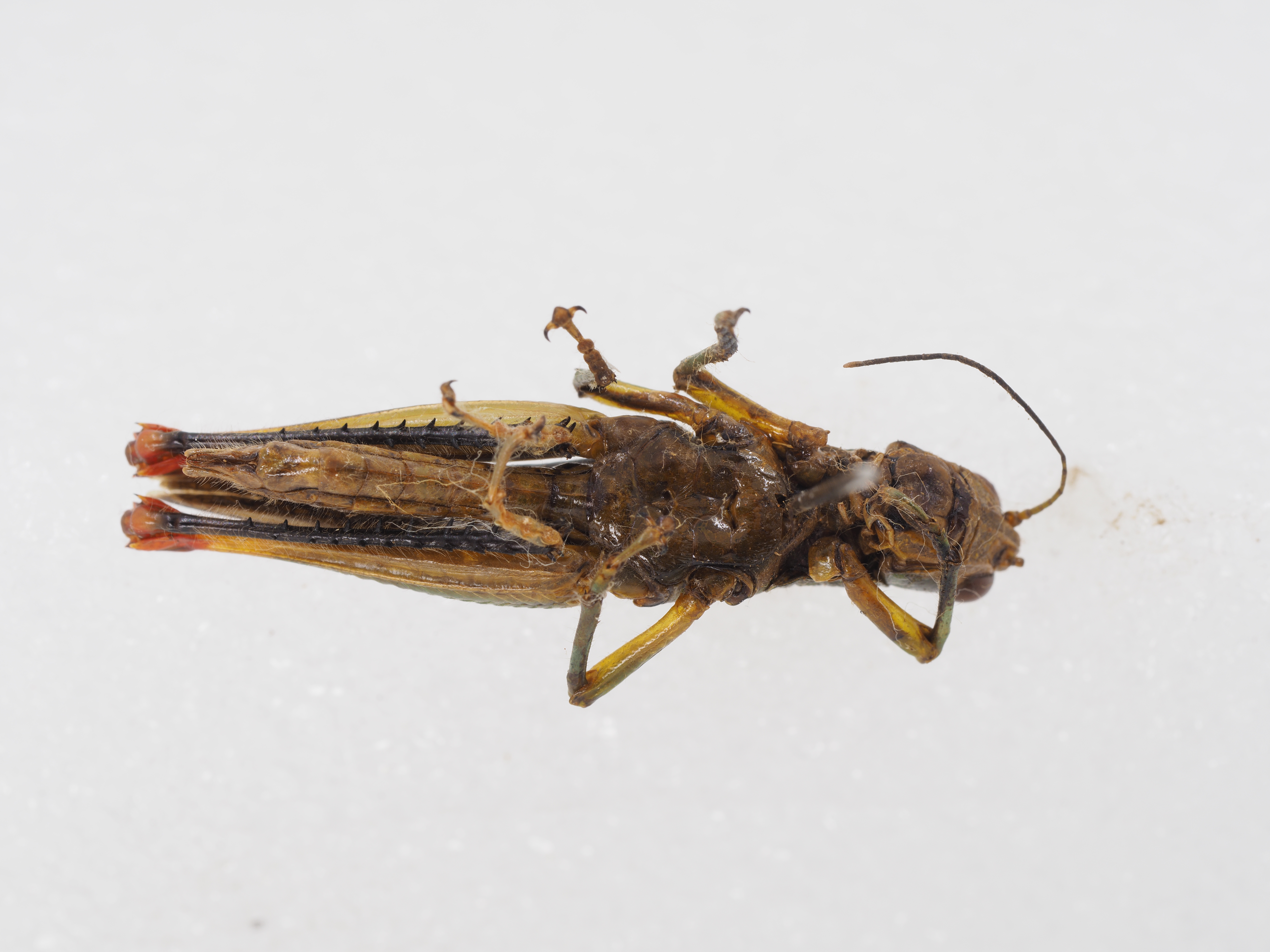 雌性 触角超过前胸背板后缘,略不到达后足股节基部。后胸腹板两侧叶后半部略分开。肛上板呈狭三角形,基部中央具短宽纵沟。产卵瓣较细长,上产卵瓣呈剑状,基部宽大,端部较细,平直,不向上弯曲,端部上缘具细齿;下产卵瓣刀状,狭长,下缘具粗齿。下生殖板后缘中央具三角形突出。