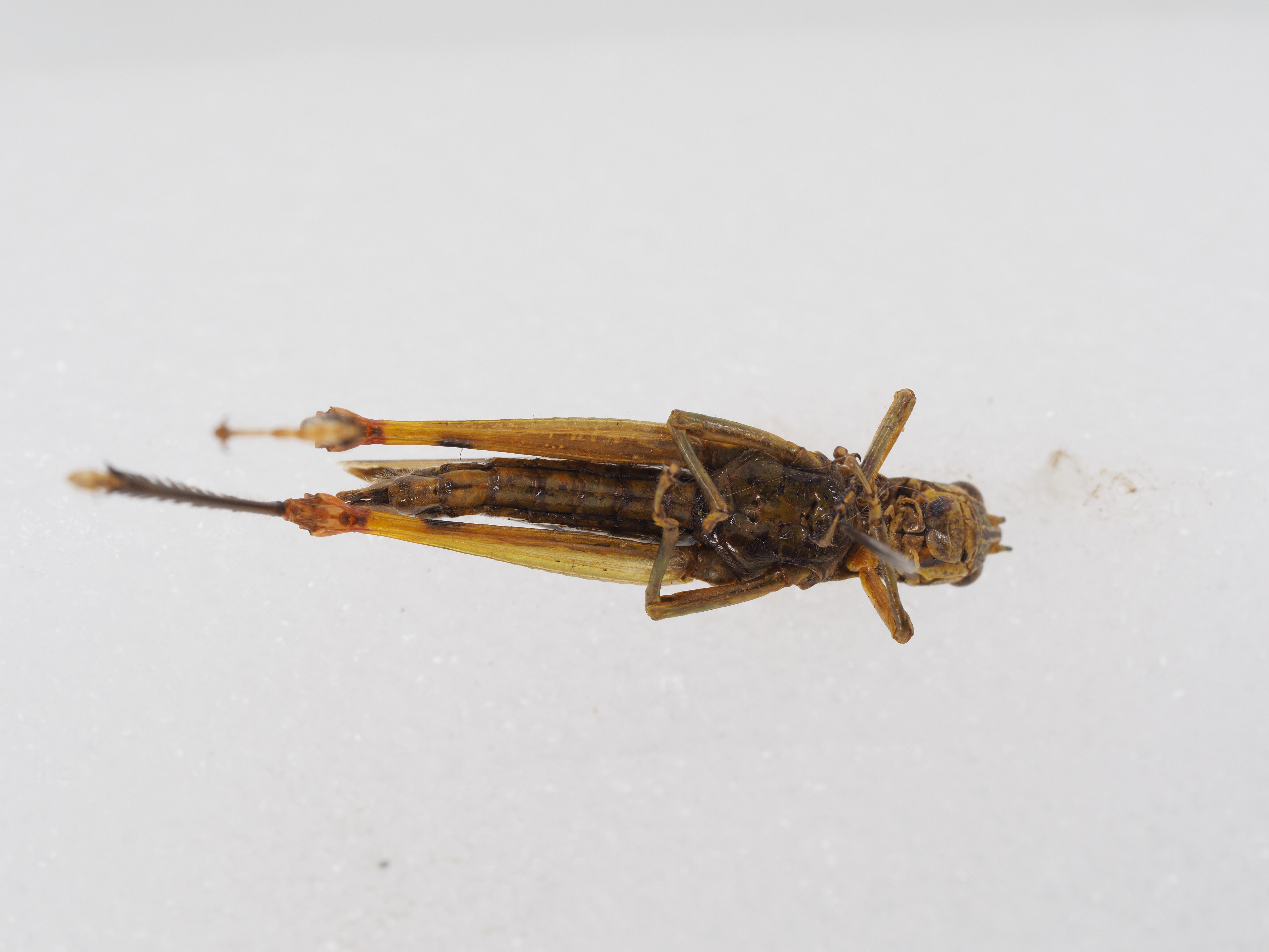 描述:雄性 体型中等,匀称。头大而短,短于前胸背板。头顶在复眼之前部分呈扇形,略向前倾斜,在两复眼之间具一低凹的横沟,后头较隆起。头侧窝缺如。颜面隆起明显,全长具纵沟。复眼为短卵圆形。触角细长,超过后足股节基部,几达中部;触角中段一节长为宽的4倍。前胸背板具细刻点,前、后缘均为弧形,中央无缺刻。中隆线在沟后区较清楚,在沟前区较不清楚。缺侧隆线。3条横沟均明显,沟前区长为沟后区长度的1.5倍。前胸腹板突锥形,端部尖锐。中胸腹板中隔较狭,其长明显地大于宽,为其最狭处的3倍。后胸腹板两侧叶在后半部毗连。前、后翅均发达,前翅超过腹部末端,不到达后足股节端部;后翅略短于前翅。前翅缘前脉和前缘脉较细,径脉与中脉在基部之半甚靠近,径脉域在基部之半甚狭;中脉域极宽,具许多不规则短脉,肘脉域很狭。后足股节细长,远超过腹部末端,其长为宽的5.3倍。鼓膜孔为宽卵形。腹部末节背板后缘具两个小尾片。肛上板三角形,中央具短纵沟。尾须锥形,其长超过肛上板端部。下生殖板短锥形,端部较钝。