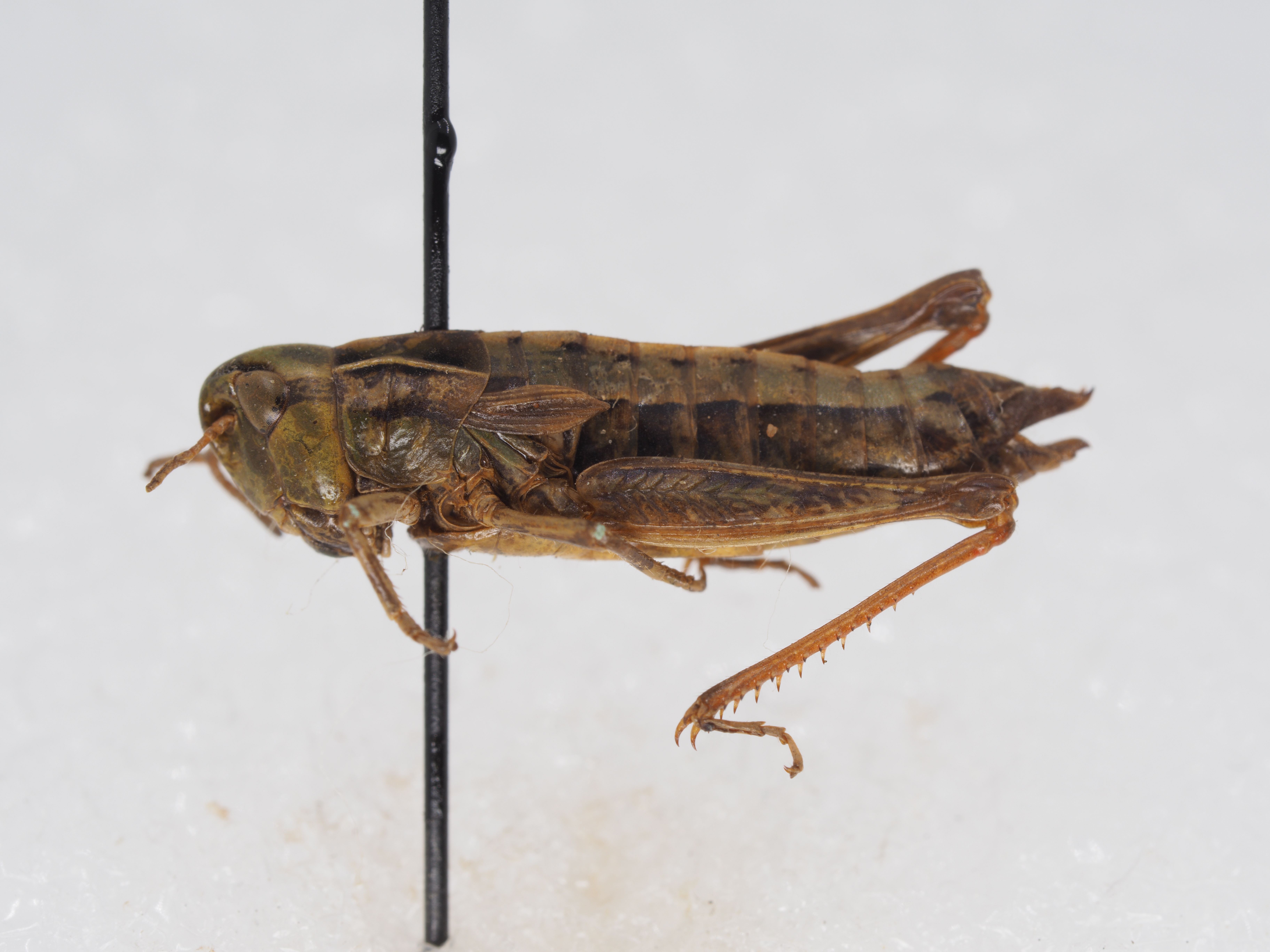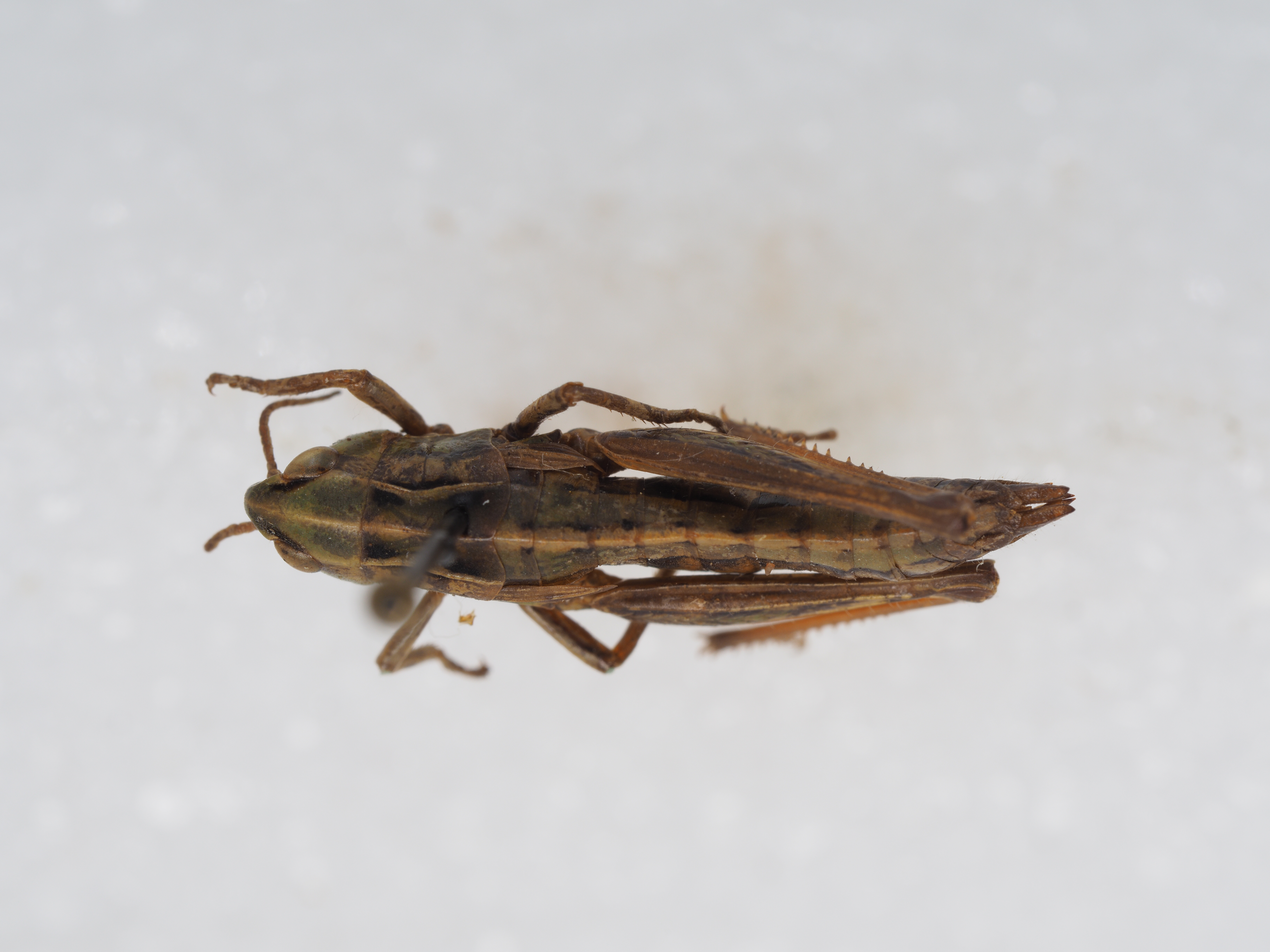 体色 多黑褐色,有时带绿色。腹部两侧具宽的黑色纵纹。后足股节黄褐色或黄绿色。后足胫节红色。