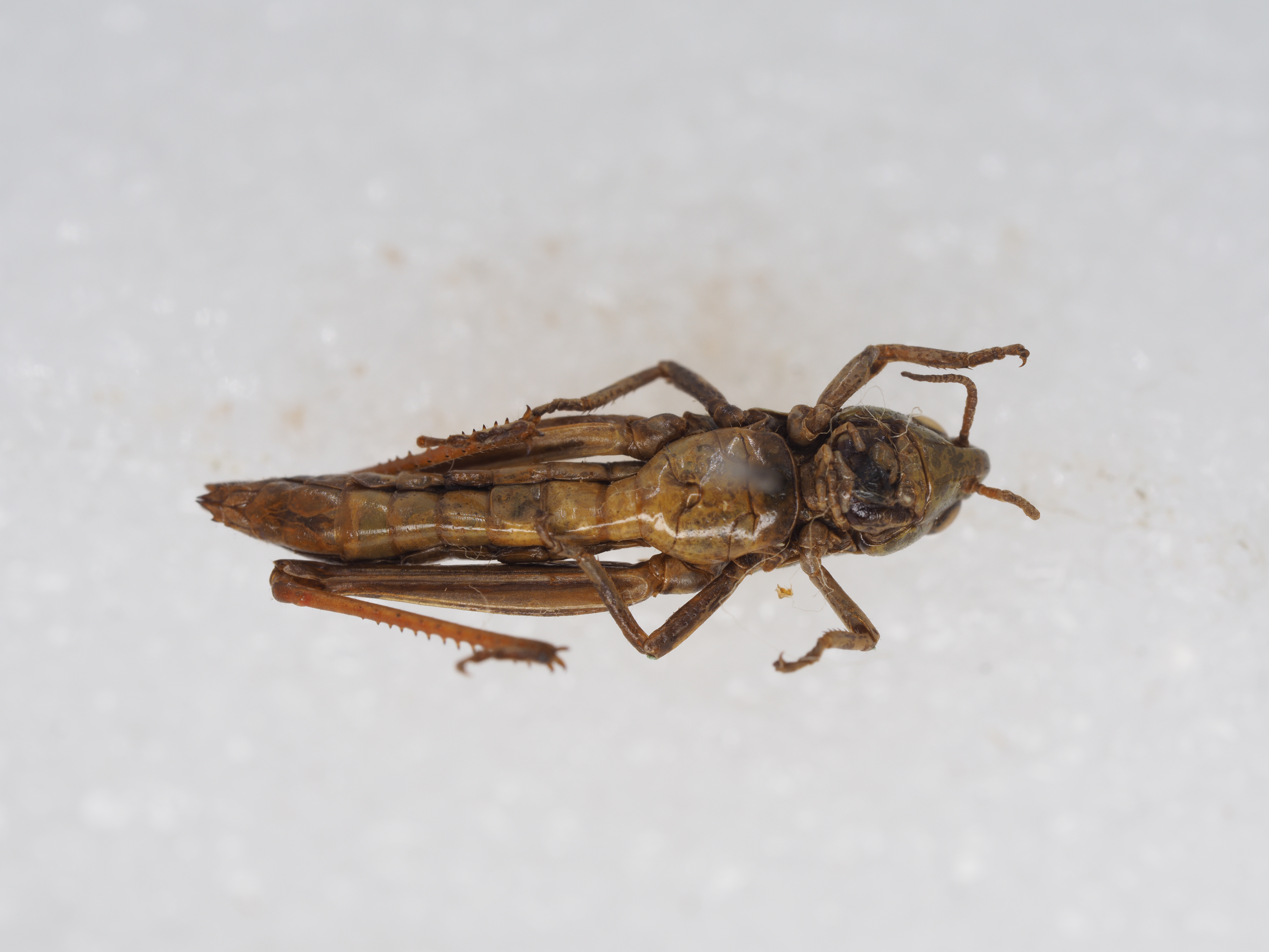 描述:雄性 体中小型。头部短于前胸背板。头顶较钝,宽短,自复眼的前缘到头顶顶端的距离小于复眼横径的1.2倍,同时小于眼间距的1.3倍;头顶具中隆线或不甚明显。缺头侧窝。颜面略倾斜,颜面隆起平坦,无颜面侧隆线。触角丝状,23节,到达或超过前胸背板后缘。复眼长卵形,位于头的中部。前胸背板前缘平直,后缘中央具三角形凹口;中、侧隆线全长明显,侧隆线在沟前区明显弯曲,在沟后区呈直形,明显地向外扩张;后横沟位于背板中后部,沟前区的长度为沟后区长的1.6—2倍。前胸腹板平坦。中胸腹板侧叶间中隔较宽,其最狭处为长度的2倍。后胸腹板侧叶明显地分开。前翅披针形,顶尖,侧置,其顶端刚超出第二腹节背板后缘,翅长为宽的3倍。后足股节长度为宽度的4.2—5倍。后足胫节内、外侧各具刺9—12个。跗节爪间中垫较长,超出爪长之一半。鼓膜器发达。腹部末节背板后缘具有尾片。尾须柱状,内侧扁平,超过肛上板顶端。肛上板宽,中部具一横隆线,顶端圆形突出。下生殖板圆锥形,顶尖圆形。