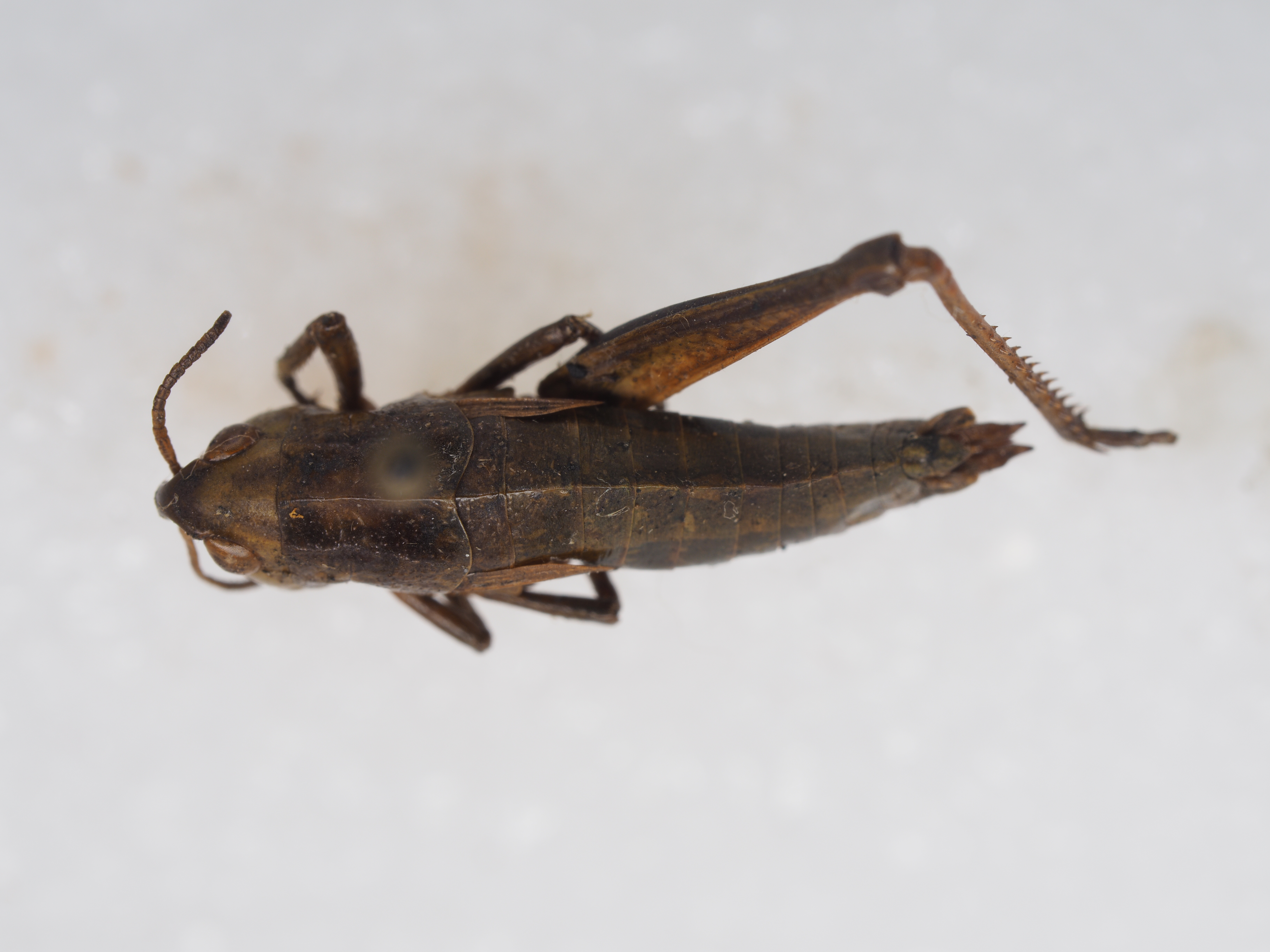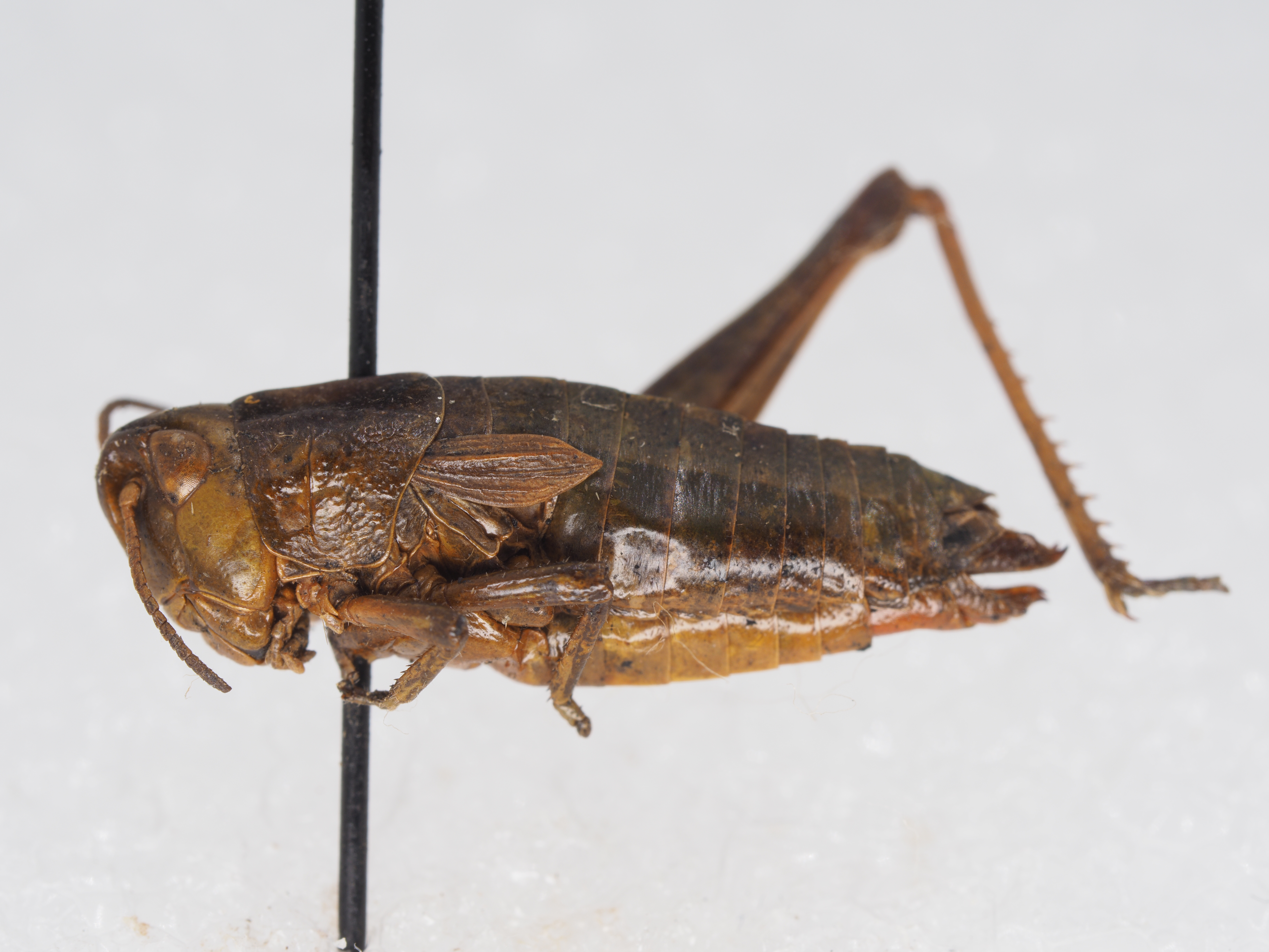描述:雄性 体中小型。头部短于前胸背板。头顶较钝,宽短,自复眼的前缘到头顶顶端的距离小于复眼横径的1.2倍,同时小于眼间距的1.3倍;头顶具中隆线或不甚明显。缺头侧窝。颜面略倾斜,颜面隆起平坦,无颜面侧隆线。触角丝状,23节,到达或超过前胸背板后缘。复眼长卵形,位于头的中部。前胸背板前缘平直,后缘中央具三角形凹口;中、侧隆线全长明显,侧隆线在沟前区明显弯曲,在沟后区呈直形,明显地向外扩张;后横沟位于背板中后部,沟前区的长度为沟后区长的1.6—2倍。前胸腹板平坦。中胸腹板侧叶间中隔较宽,其最狭处为长度的2倍。后胸腹板侧叶明显地分开。前翅披针形,顶尖,侧置,其顶端刚超出第二腹节背板后缘,翅长为宽的3倍。后足股节长度为宽度的4.2—5倍。后足胫节内、外侧各具刺9—12个。跗节爪间中垫较长,超出爪长之一半。鼓膜器发达。腹部末节背板后缘具有尾片。尾须柱状,内侧扁平,超过肛上板顶端。肛上板宽,中部具一横隆线,顶端圆形突出。下生殖板圆锥形,顶尖圆形。