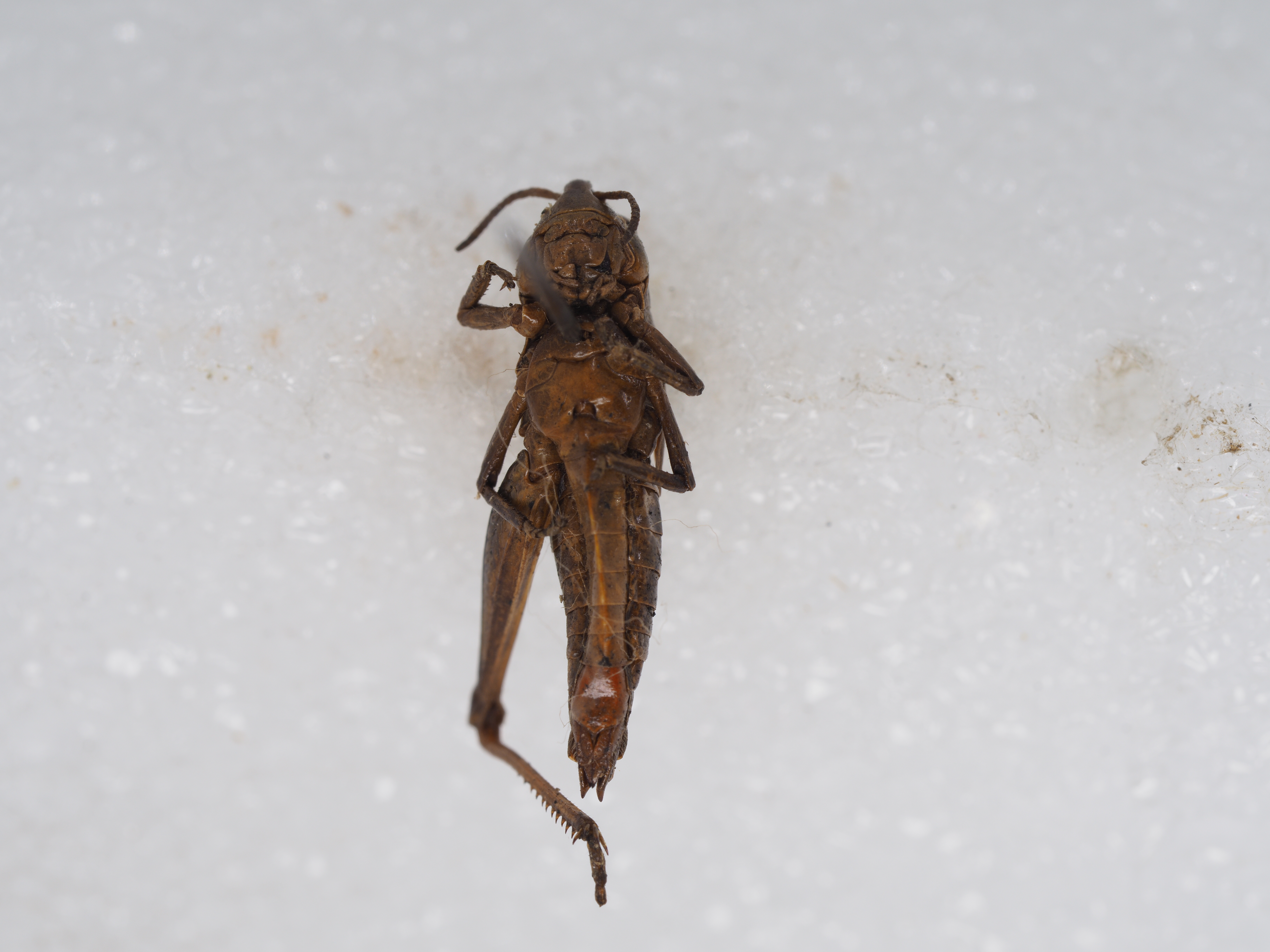 雌性 体较雄性大而粗壮。头顶中隆线不明显。颜面平坦。触角较短,仅达前胸背板后缘。前翅较短,仅到达或略超出腹部第二节背板的后缘。尾须短,不超出肛上板端部。产卵瓣粗短,上瓣之上外缘粗糙不平。