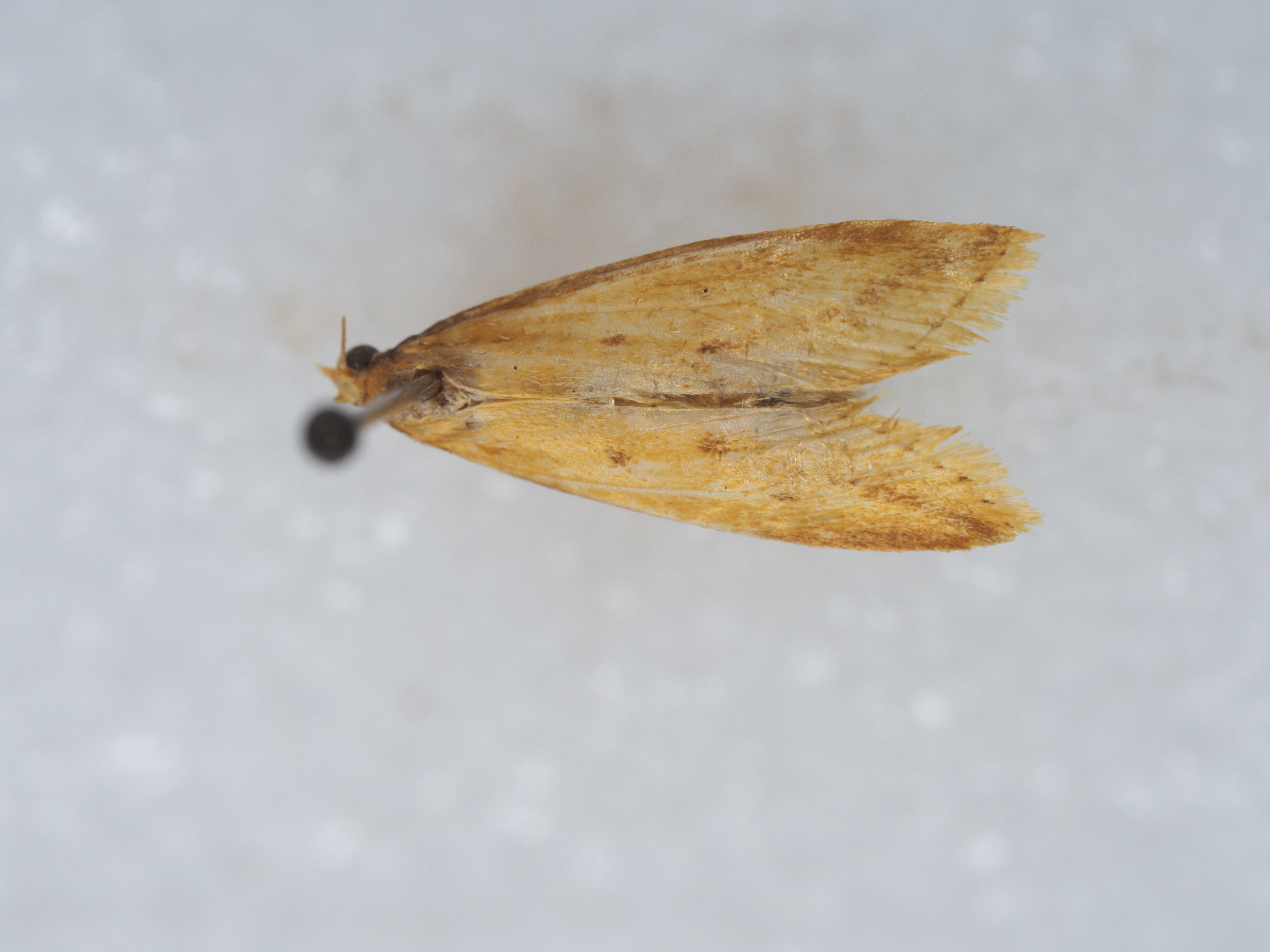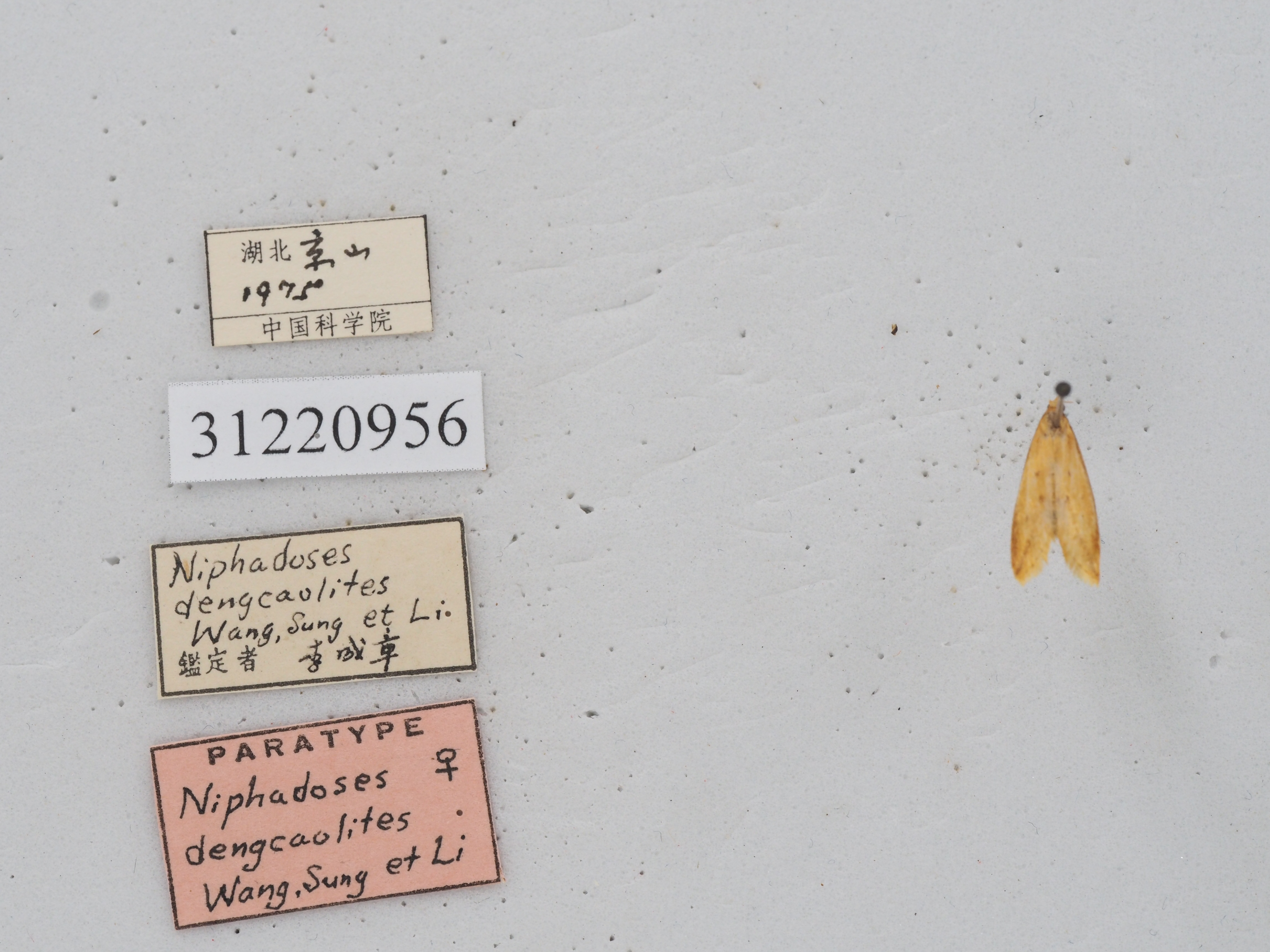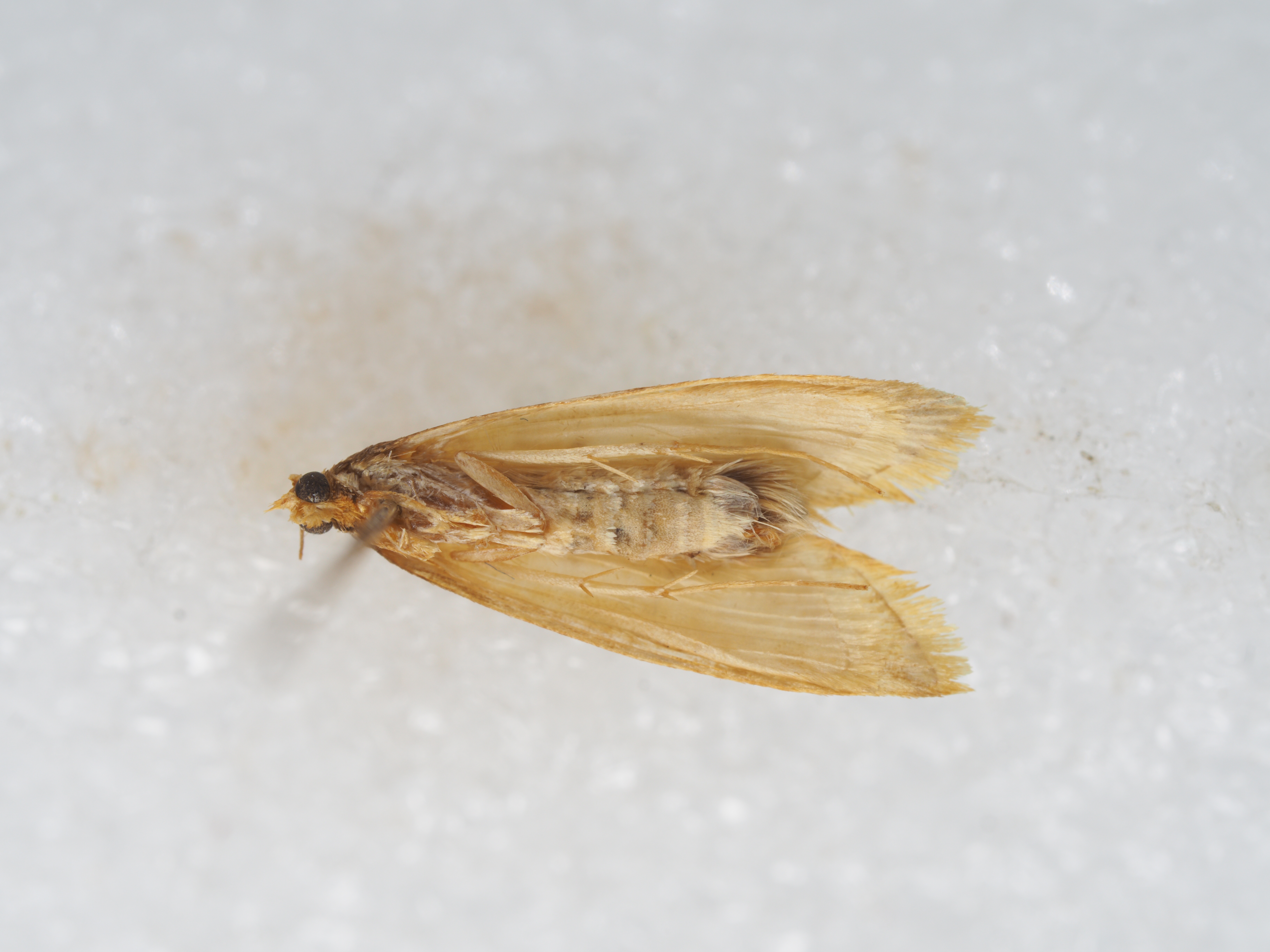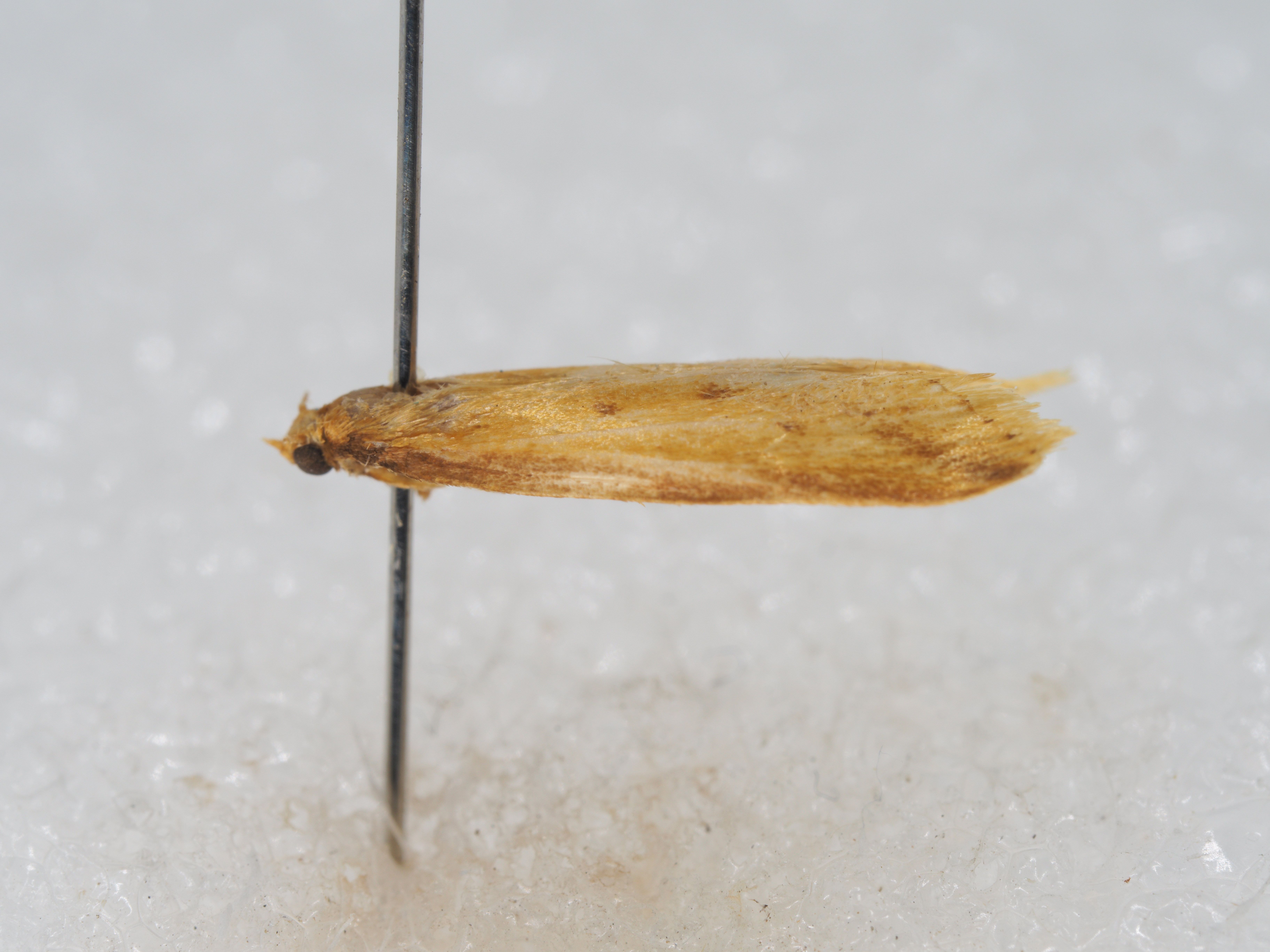 描述:雄性翅展13-19毫米。头部褐黄鳞片扩展,无单眼,触角鞭状、每小节腹面亚基部及近端部各生一横列深褐色纤毛、毛长略超过小节横径。下唇须淡黄向前平伸、第2节长度为复眼直径四倍,第3节短钝。下颚须扩展褐黄有深褐鳞片散布其间。口喙萎缩。胸部褐黄,足褐黄,前胸足胫节腿节深棕褐。腹部褐黄。前翅淡黄,沿前缘有深褐宽边,中室下角有一深褐斑,翅顶向下斜伸亚外缘线深褐带,中室以下沿臀脉有两个深褐色点,缘毛淡黄,基部均匀排列七个深褐小点。后翅白色,缘毛白色。外生殖器爪形突短三角形、末端钝圆、颈形突窄小,两臂向中央横伸,合拢突出短尖。背兜阔三角形、背兜背面斜十字形,上臂短下臂长。背兜下突两侧半圆镰刀状末端尖如鱼钩。抱器瓣三角形光滑有细毛,抱器背伸直、抱器腹向上斜伸末端圆形。基腹弧宽阔,一侧较厚,平直稍折曲。阳茎端基环片状,密布细尖刺,囊形突圆形,阳茎伸直、角状器有一对短钝刺,其后方有一枚矛形尖钩状硬骨化钝刺多四周环绕许多细尖短针。