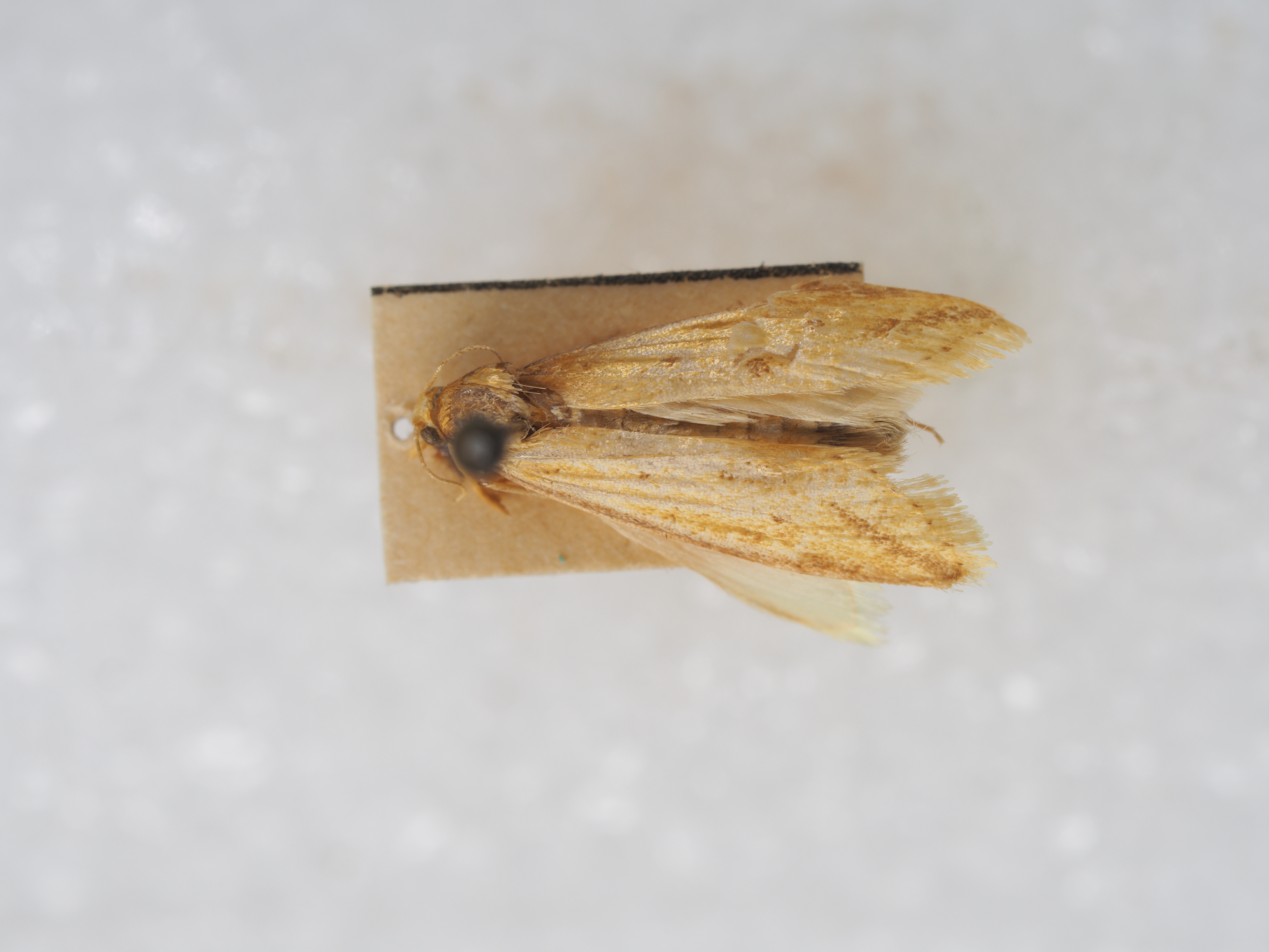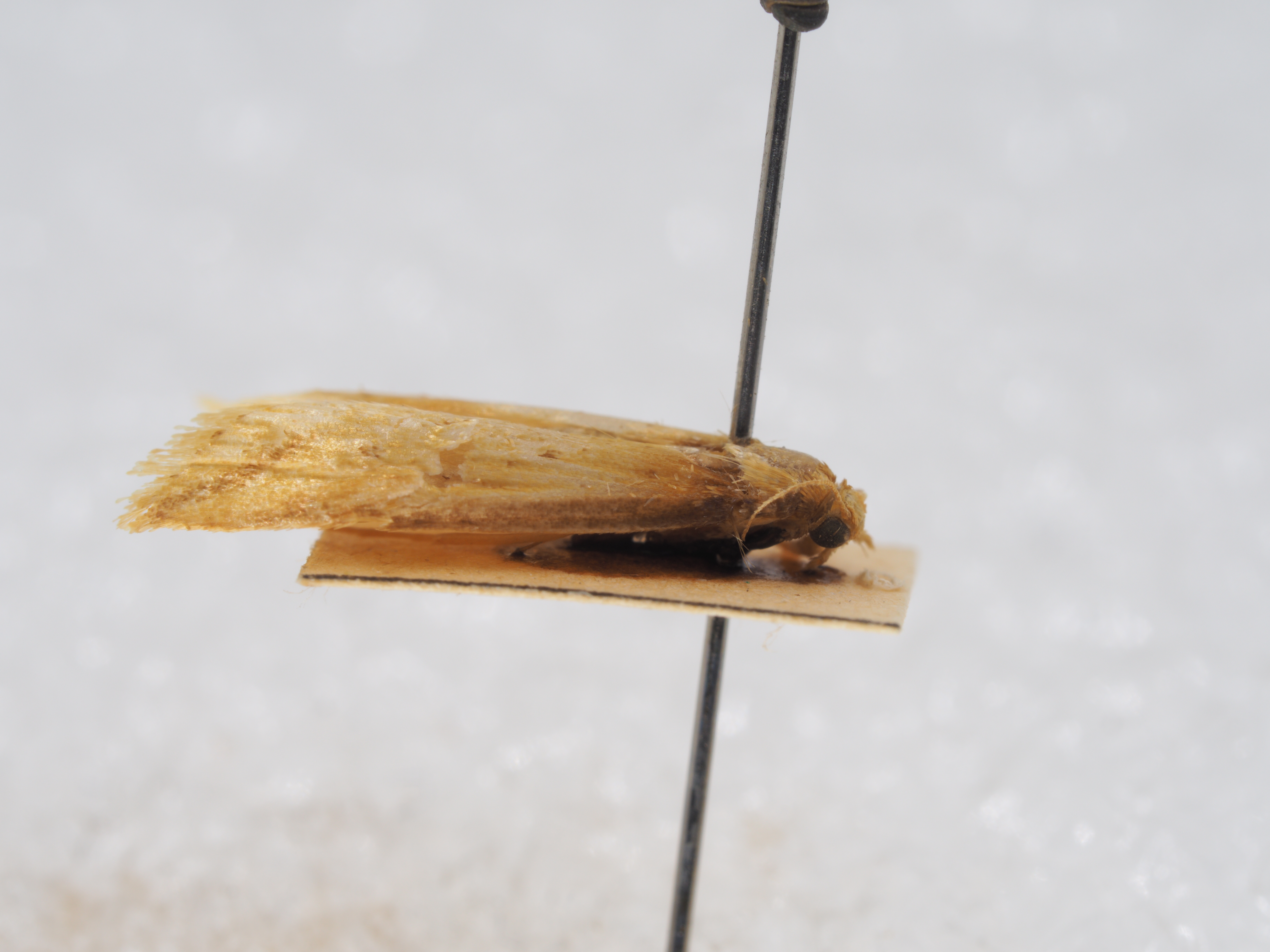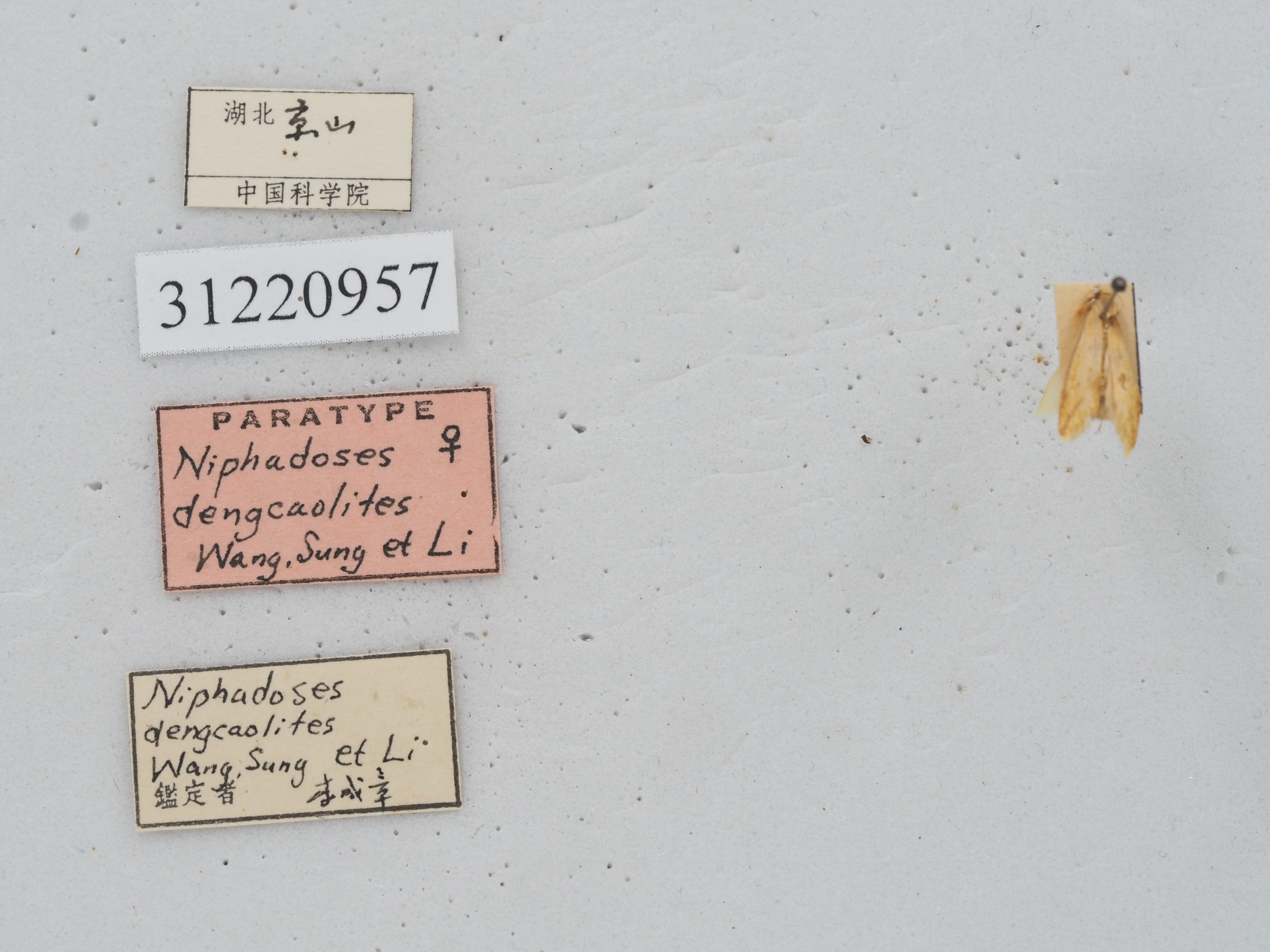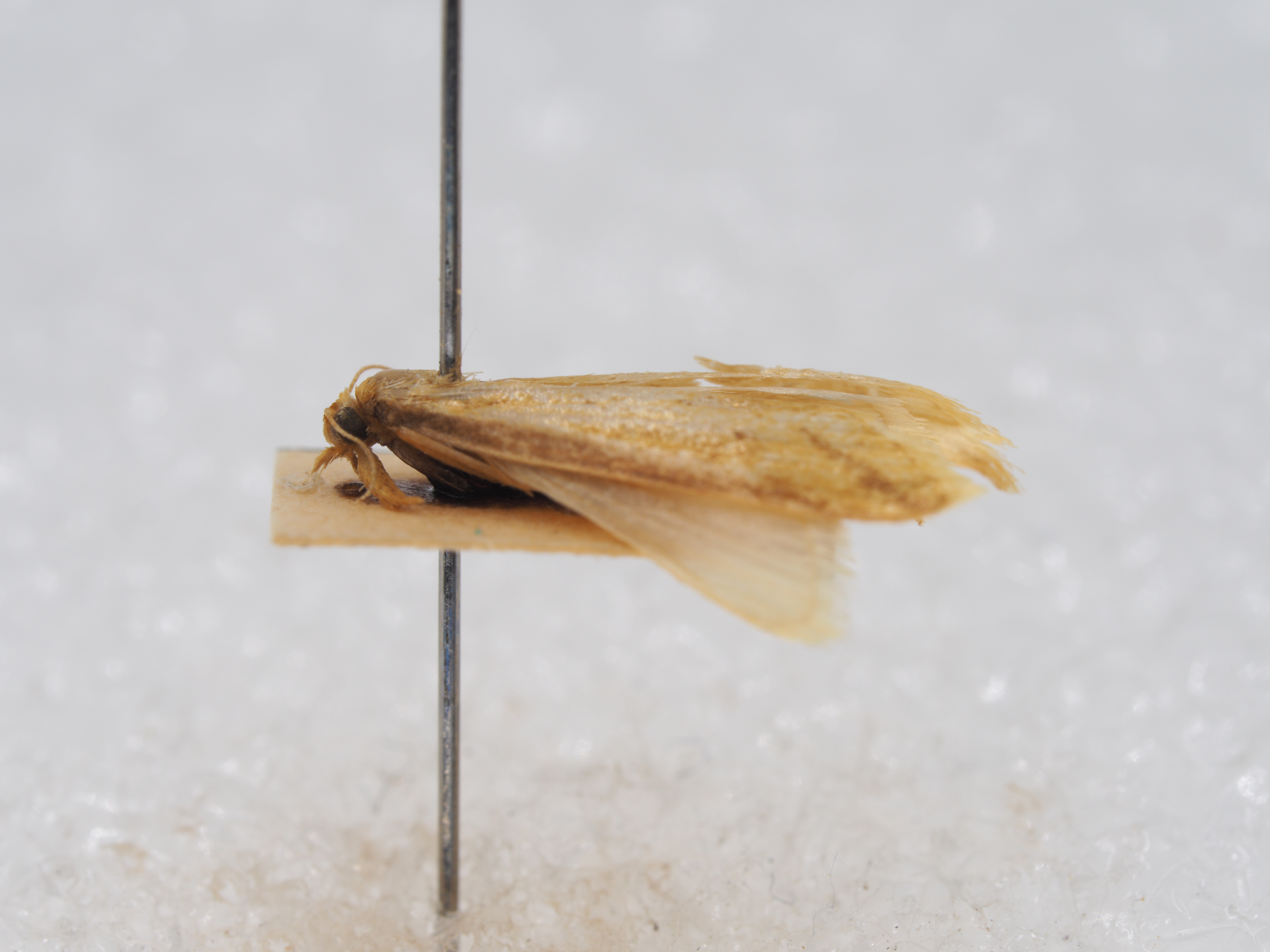 描述:雄性翅展13-19毫米。头部褐黄鳞片扩展,无单眼,触角鞭状、每小节腹面亚基部及近端部各生一横列深褐色纤毛、毛长略超过小节横径。下唇须淡黄向前平伸、第2节长度为复眼直径四倍,第3节短钝。下颚须扩展褐黄有深褐鳞片散布其间。口喙萎缩。胸部褐黄,足褐黄,前胸足胫节腿节深棕褐。腹部褐黄。前翅淡黄,沿前缘有深褐宽边,中室下角有一深褐斑,翅顶向下斜伸亚外缘线深褐带,中室以下沿臀脉有两个深褐色点,缘毛淡黄,基部均匀排列七个深褐小点。后翅白色,缘毛白色。外生殖器爪形突短三角形、末端钝圆、颈形突窄小,两臂向中央横伸,合拢突出短尖。背兜阔三角形、背兜背面斜十字形,上臂短下臂长。背兜下突两侧半圆镰刀状末端尖如鱼钩。抱器瓣三角形光滑有细毛,抱器背伸直、抱器腹向上斜伸末端圆形。基腹弧宽阔,一侧较厚,平直稍折曲。阳茎端基环片状,密布细尖刺,囊形突圆形,阳茎伸直、角状器有一对短钝刺,其后方有一枚矛形尖钩状硬骨化钝刺多四周环绕许多细尖短针。