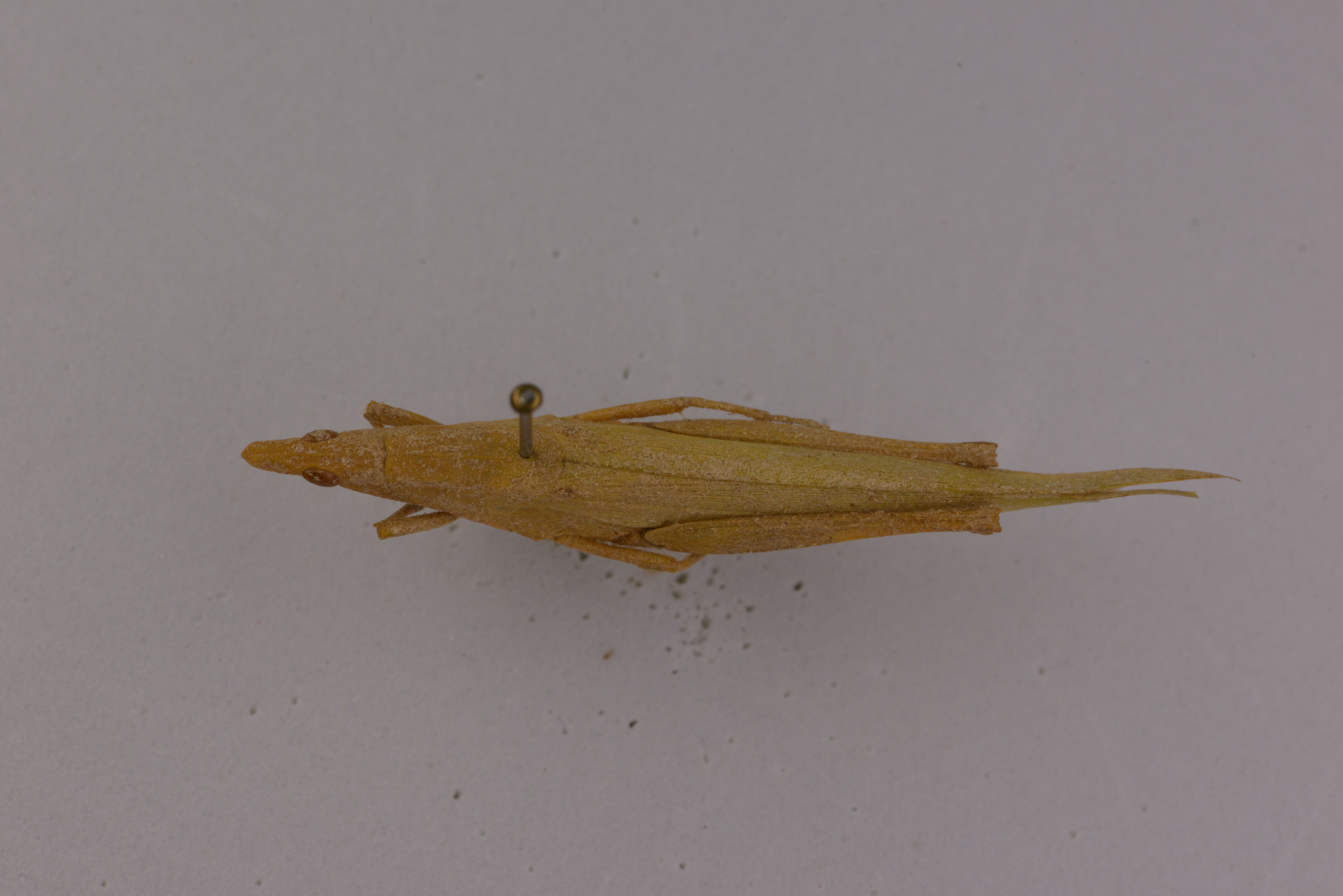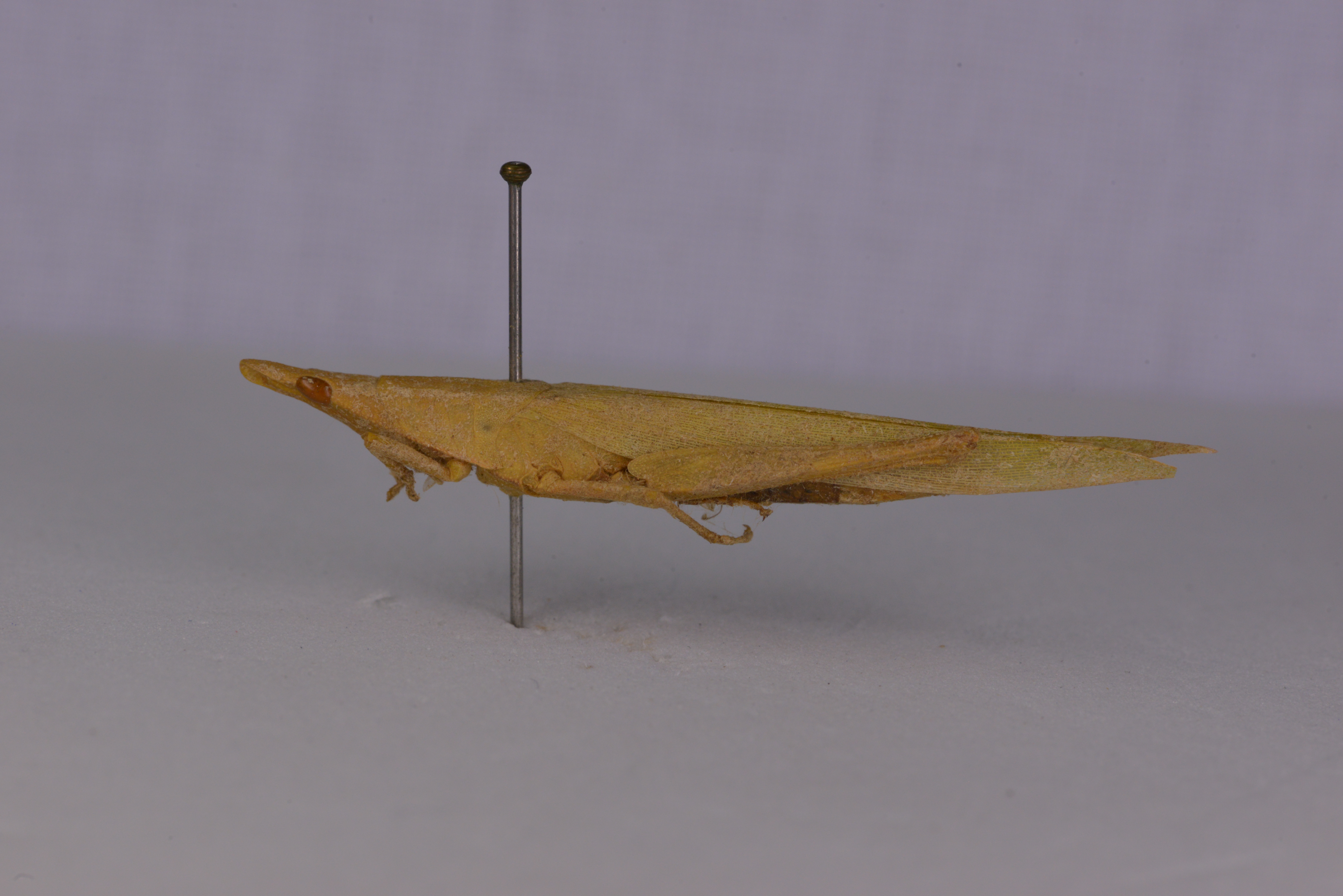 描述:雄性 体较长大,体长为体宽的约7-8倍。头顶较长,其长约为复眼最长直径的1.5倍,顶端近乎直角形。复眼为长卵形,其最长直径约为其宽的1.4-1.6倍,眼后一列颗粒整齐。触角较长,到达上唇端部,16节,其基部距侧单眼的距离略宽于触角的柄节。前胸背板具有少数颗粒,前缘为宽圆形,中央略凹人,后缘为钝角形突出,沿中隆线处具小三角形凹口;中隆线和侧隆线均明显,后横沟位于后端。前胸背板侧片后缘域缺膜区,有时略具痕迹,后缘为弧形凹人,后下角向后延伸为锐角。前翅甚长,超过后足股节端部的长度约为翅长的1/3以上;后翅宽而长,较远地超过后足股节的端部,但甚短于前翅。后足股节细长,其长约为宽的7倍,外侧下隆线不明显向外突出。腹部最后一节的后缘中央具钝角形凹口;肛上板较长,较远地长于尾须。下生殖板侧面观端部近乎直角。阳茎基背片桥部较细长,其突角较狭锐。阳茎细长,端部甚向上弯曲。