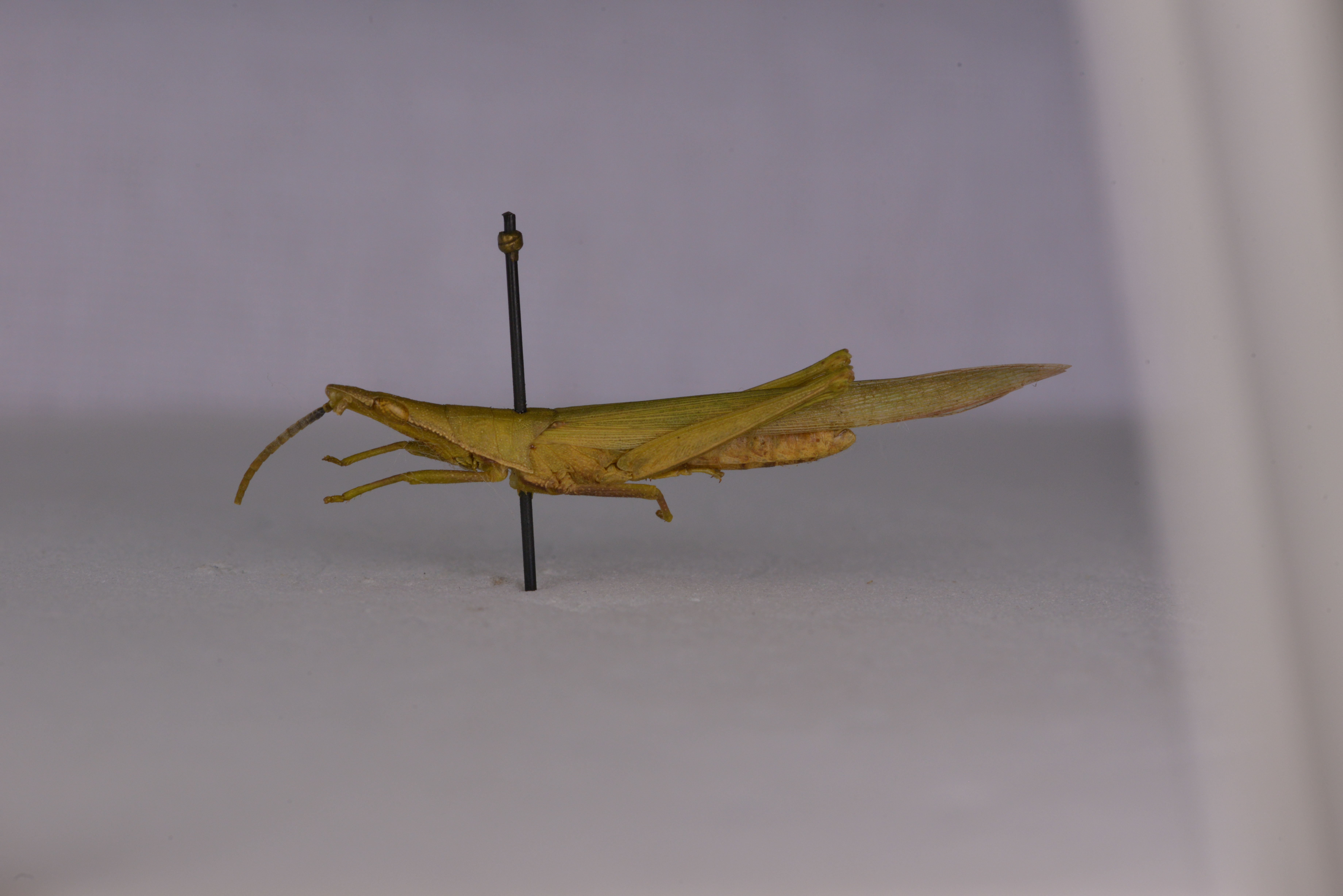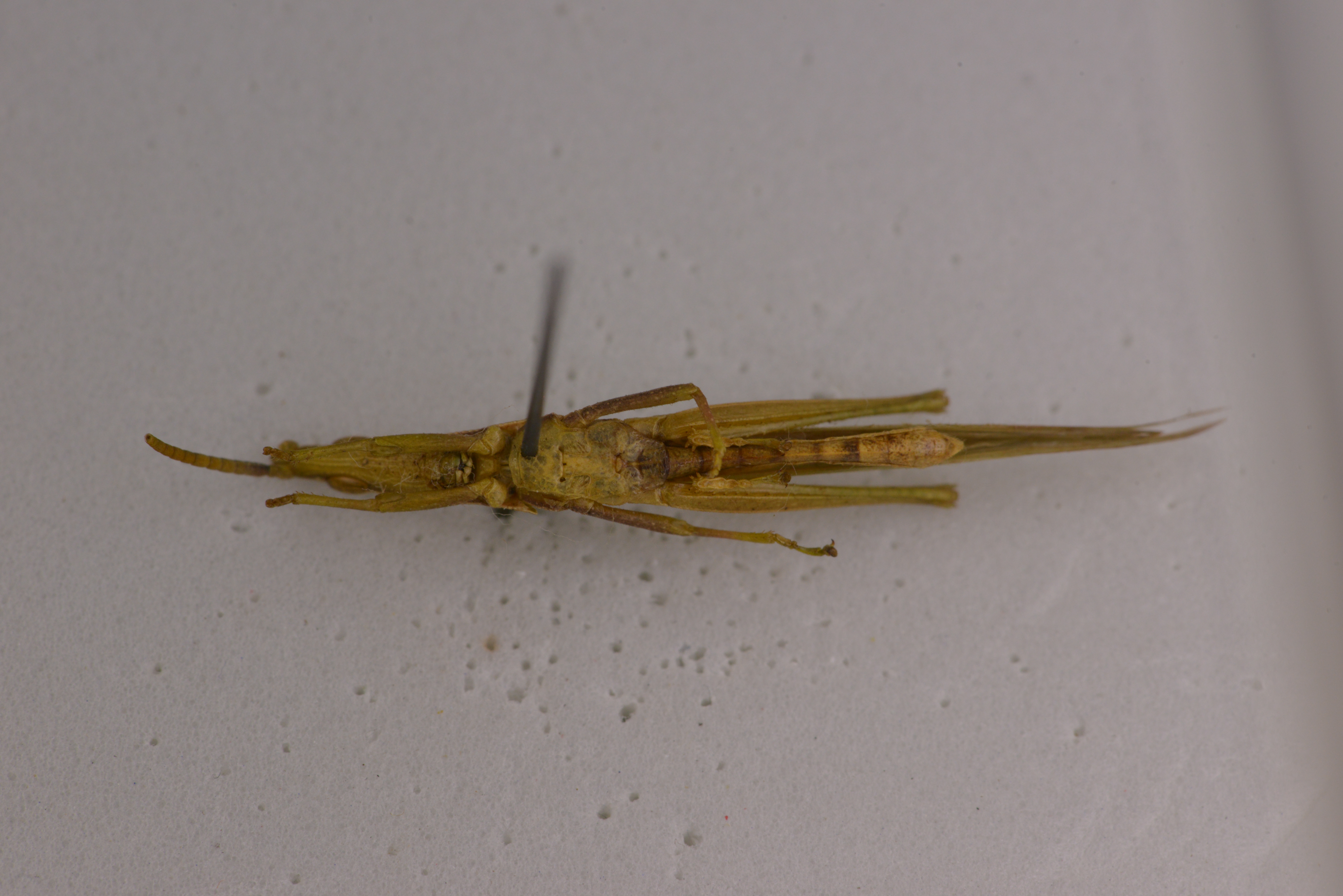描述:雄性 体较长,体长为体宽的约8倍。头顶较长,其长约为复眼最长直径的1.4-1.6倍,为复眼间最狭处的2.5-3.0倍;复眼为长卵形,其长为其宽的1.7倍。眼后一列颗粒稀小而整齐。触角16节,剑状,其长达上唇端部,前胸背板比较长,其前缘中央略凹,后缘为钝角形突出,沿中隆线处具小三角形凹口;中隆线明显隆起.侧隆线由小颗粒连接而成细线;后横沟位于后端。前胸背板侧片后缘域缺膜区,后缘为弧形凹人,后下角向后延伸较长为锐角。前翅超出后足股节端部之长为翅长的1/3左右。后翅短于前翅,超过后足股节端部。中胸腹板侧叶间的中隔长形。后足股节细长,其长约为宽的7倍,外侧下隆线不明显向外突出。腹部最后一节的后缘中央具三角形凹陷。肛上板较长,较远地长于尾须。下生殖板侧面观端部宽圆。阳茎基背片桥部较略宽短.其突角较狭锐。阳茎细长,端部向上弯曲。