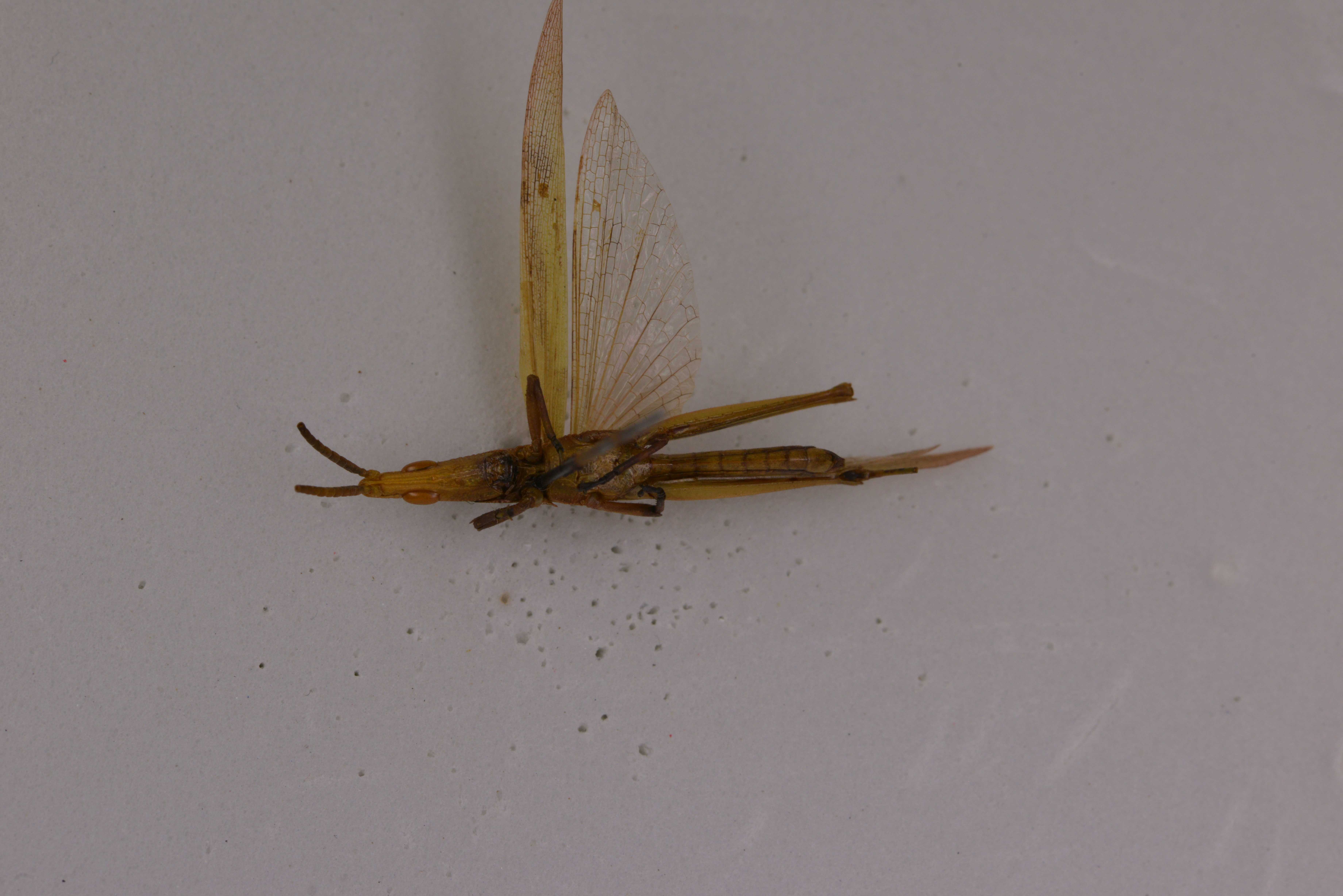 描述:雄性 体较长,体长为体宽的约8倍。头顶较长,其长约为复眼最长直径的1.4-1.6倍,为复眼间最狭处的2.5-3.0倍;复眼为长卵形,其长为其宽的1.7倍。眼后一列颗粒稀小而整齐。触角16节,剑状,其长达上唇端部,前胸背板比较长,其前缘中央略凹,后缘为钝角形突出,沿中隆线处具小三角形凹口;中隆线明显隆起.侧隆线由小颗粒连接而成细线;后横沟位于后端。前胸背板侧片后缘域缺膜区,后缘为弧形凹人,后下角向后延伸较长为锐角。前翅超出后足股节端部之长为翅长的1/3左右。后翅短于前翅,超过后足股节端部。中胸腹板侧叶间的中隔长形。后足股节细长,其长约为宽的7倍,外侧下隆线不明显向外突出。腹部最后一节的后缘中央具三角形凹陷。肛上板较长,较远地长于尾须。下生殖板侧面观端部宽圆。阳茎基背片桥部较略宽短.其突角较狭锐。阳茎细长,端部向上弯曲。