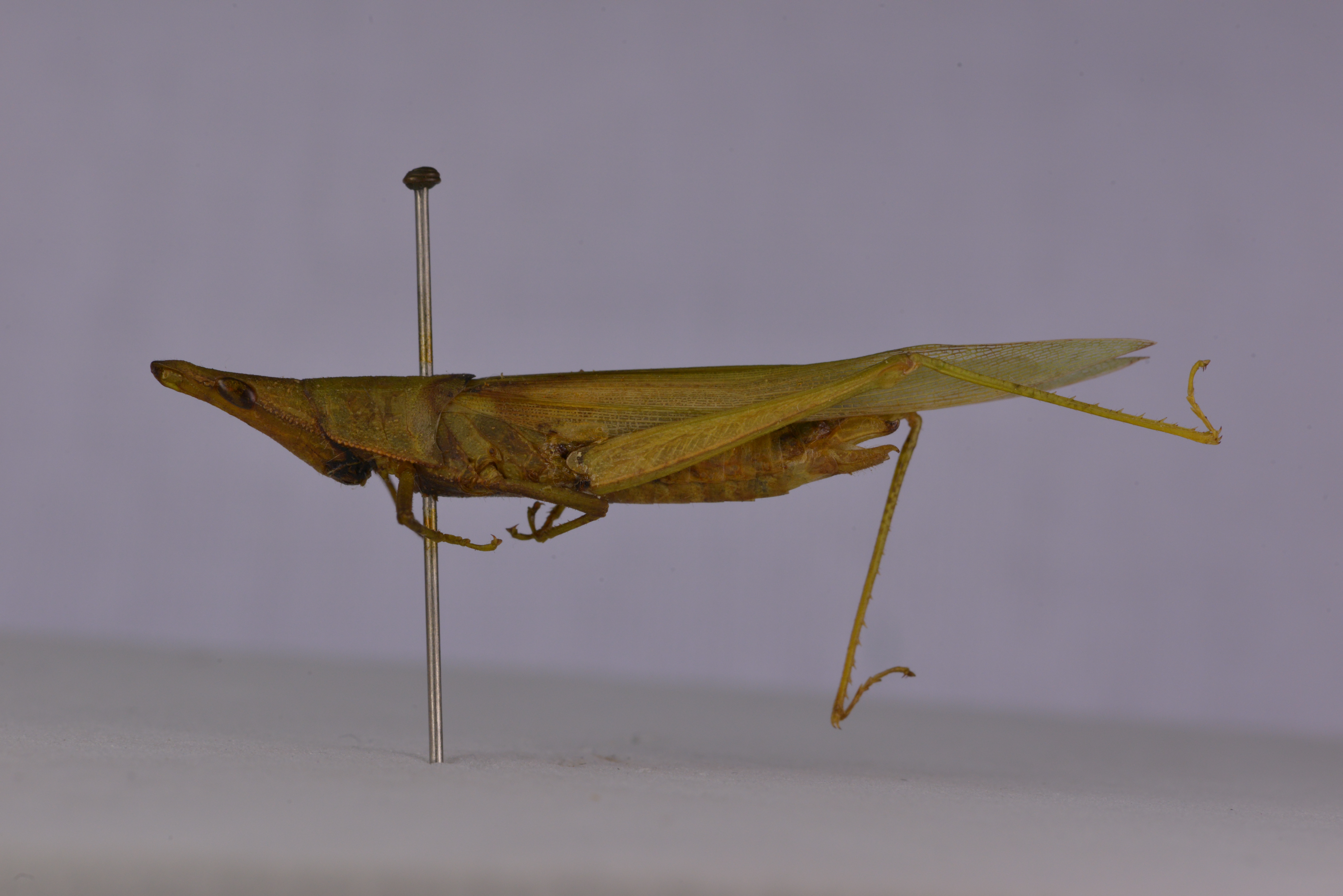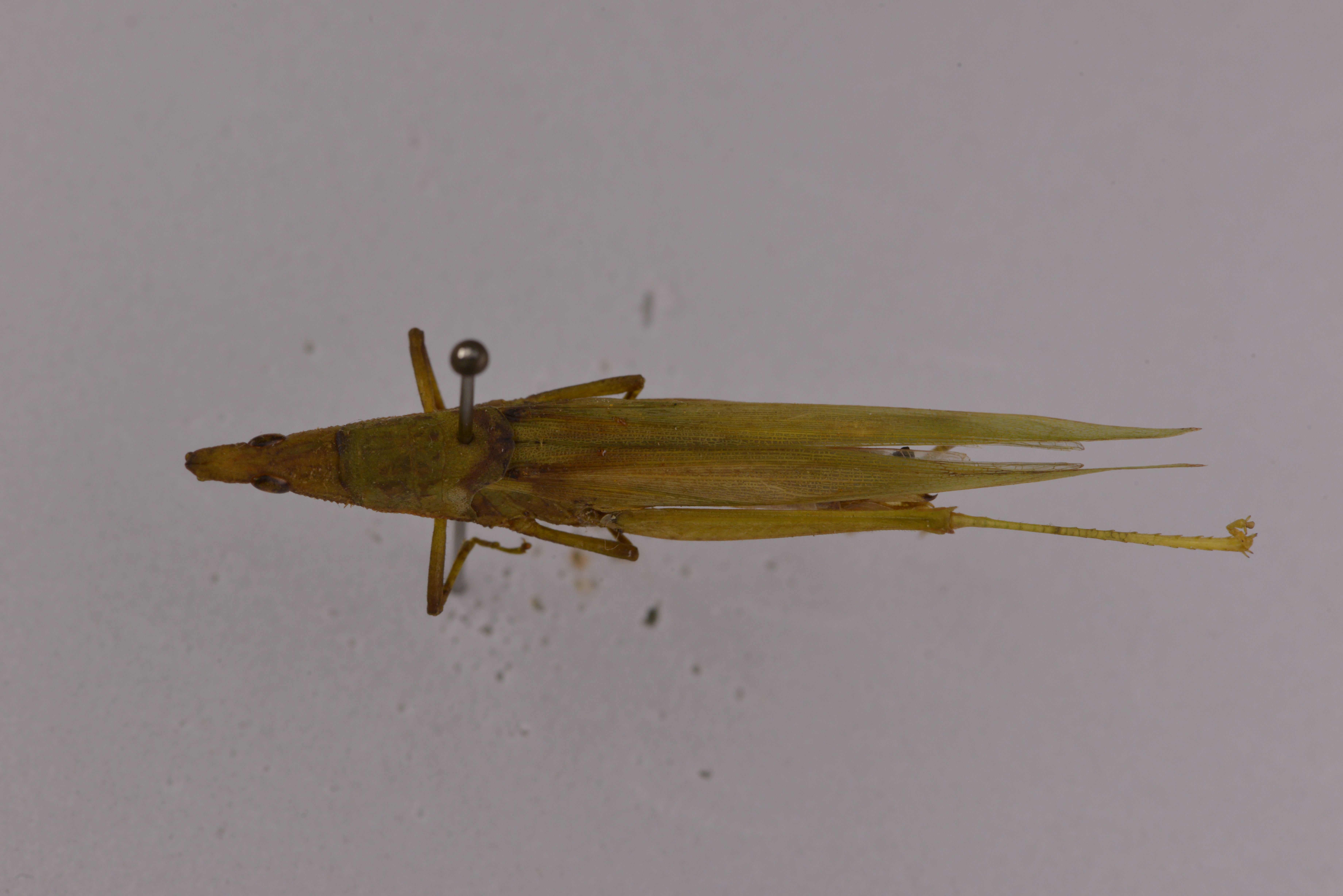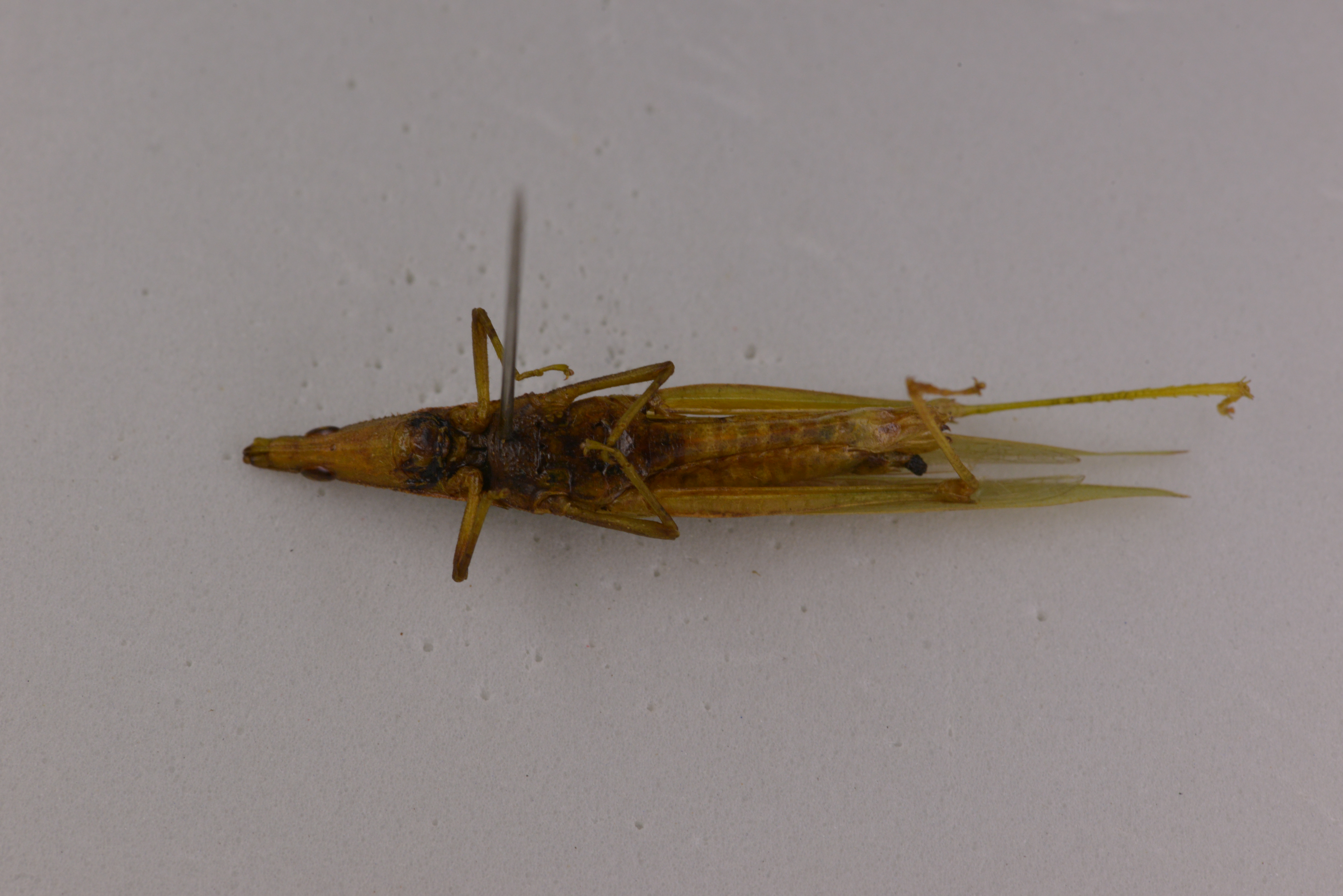 描述:雄性 体较长,体长为体宽的约8倍。头顶较长,其长约为复眼最长直径的1.4-1.6倍,为复眼间最狭处的2.5-3.0倍;复眼为长卵形,其长为其宽的1.7倍。眼后一列颗粒稀小而整齐。触角16节,剑状,其长达上唇端部,前胸背板比较长,其前缘中央略凹,后缘为钝角形突出,沿中隆线处具小三角形凹口;中隆线明显隆起.侧隆线由小颗粒连接而成细线;后横沟位于后端。前胸背板侧片后缘域缺膜区,后缘为弧形凹人,后下角向后延伸较长为锐角。前翅超出后足股节端部之长为翅长的1/3左右。后翅短于前翅,超过后足股节端部。中胸腹板侧叶间的中隔长形。后足股节细长,其长约为宽的7倍,外侧下隆线不明显向外突出。腹部最后一节的后缘中央具三角形凹陷。肛上板较长,较远地长于尾须。下生殖板侧面观端部宽圆。阳茎基背片桥部较略宽短.其突角较狭锐。阳茎细长,端部向上弯曲。