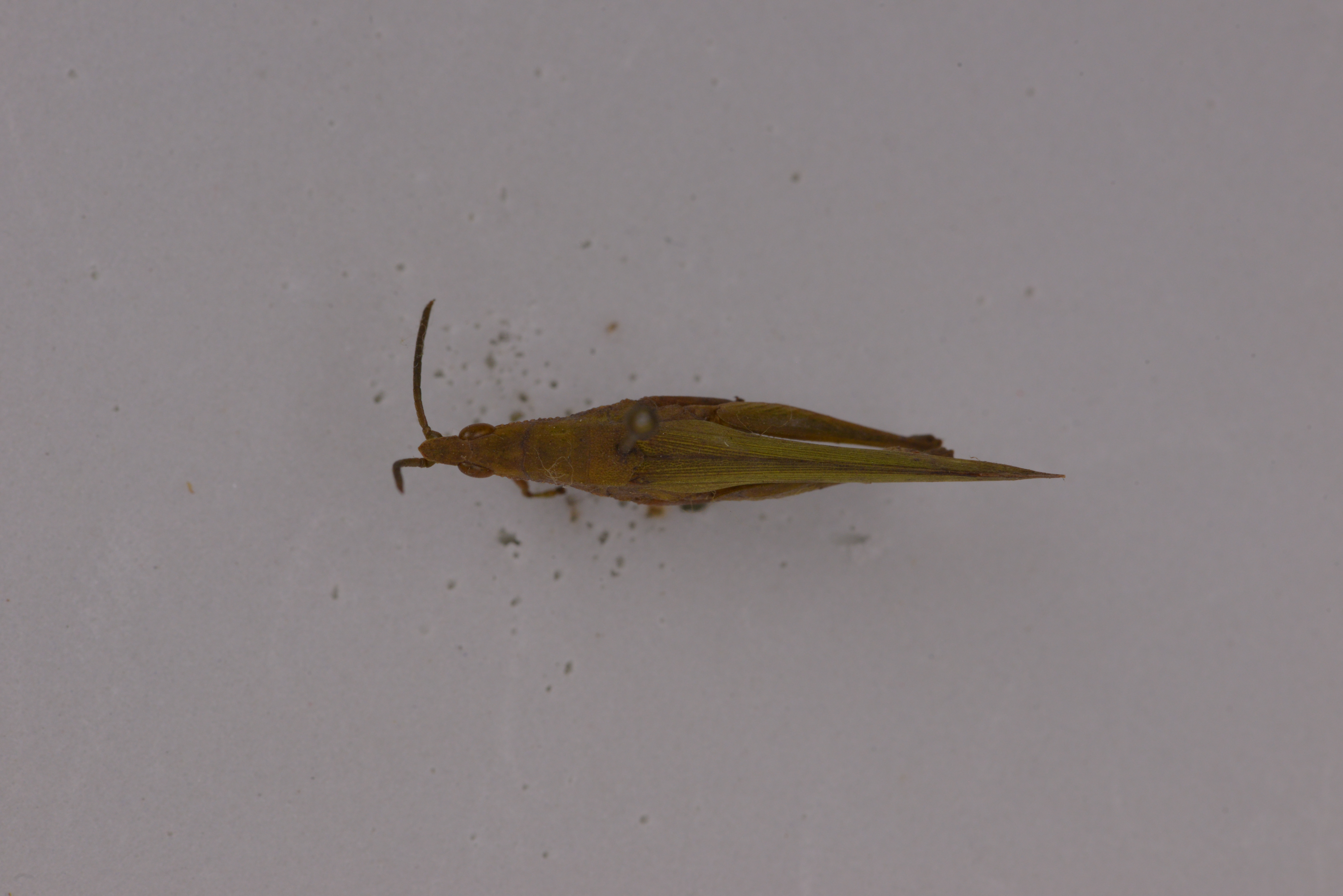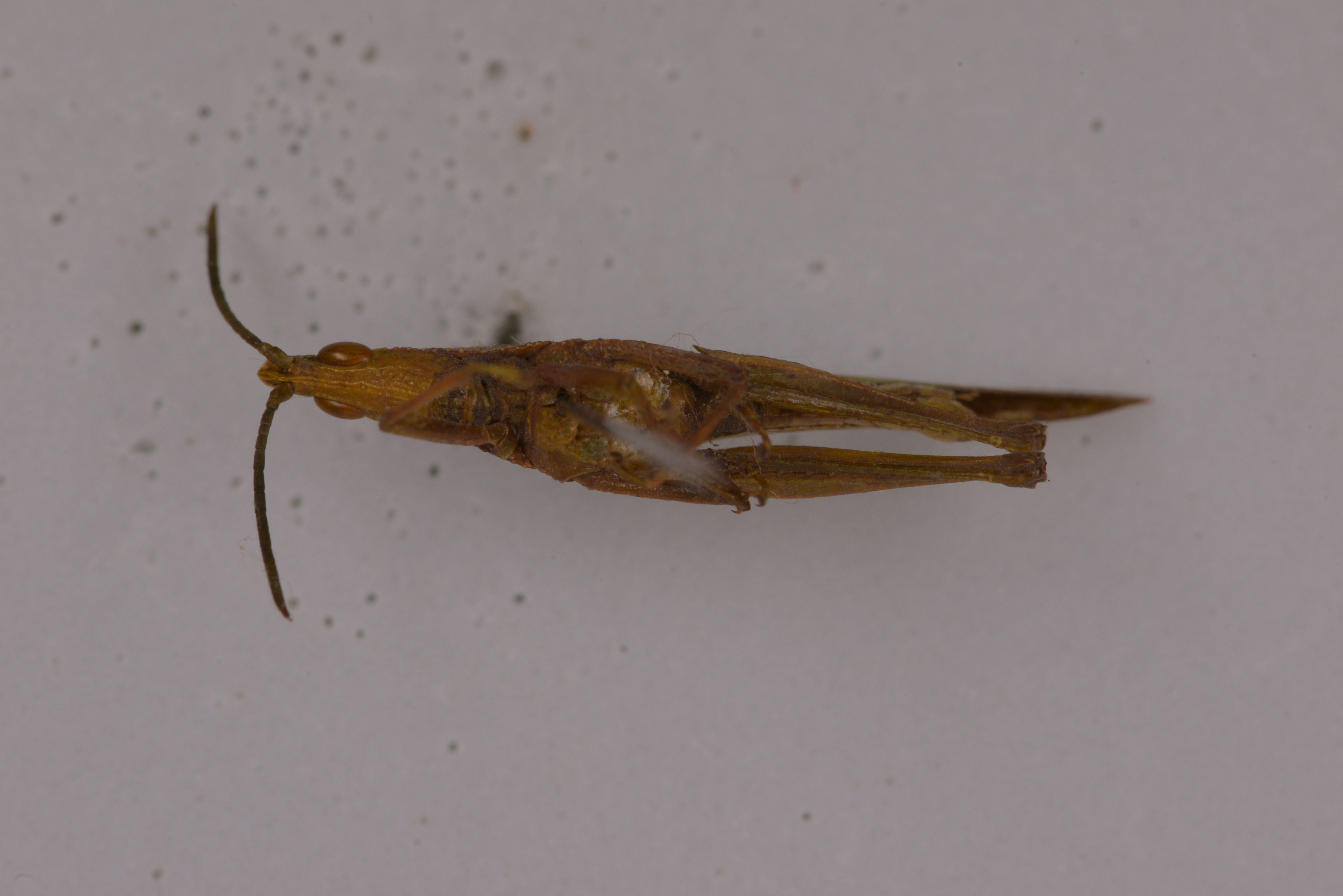 描述:雄性 体近似纺锤形,较粗短,体长为体宽的5倍,头顶短而较尖,其长度等于或短于复眼的最长直径,有时可略较长于最长直径;复眼长卵形,其最长直径约为其宽的1.6倍,眼后一列颗粒少而较大,且突出,排列整齐,或少数不整齐;触角较短,16节,到达上唇端部。前胸背板的颗粒较稀少,前缘宽弧形,后缘为钝角形突出,中隆线低,侧隆线低,侧隆线较不明显;前胸背板侧片后缘域缺膜区;后缘稍凹人,后下角略向后延伸;其下缘具一列较凸出的颗粒,排列整齐。中、后胸两侧的下缘明显向外扩展,中胸腹板侧叶间的中隔为较宽的四边形。前翅较宽短,超出后足股节端部的长度短于翅长的1/4,前缘略向后弯。后翅宽而短,刚超过后足股节端部,但略短于前翅。后足股节较粗短,其长约为宽的5倍,外侧下隆线明显地向外突出。肛上板略长,稍长于尾须。下生殖板侧面观端部宽圆,近乎钝角形。阳具基背片桥部较细长,其突角较狭长。阳具细长,端部向上弯曲。