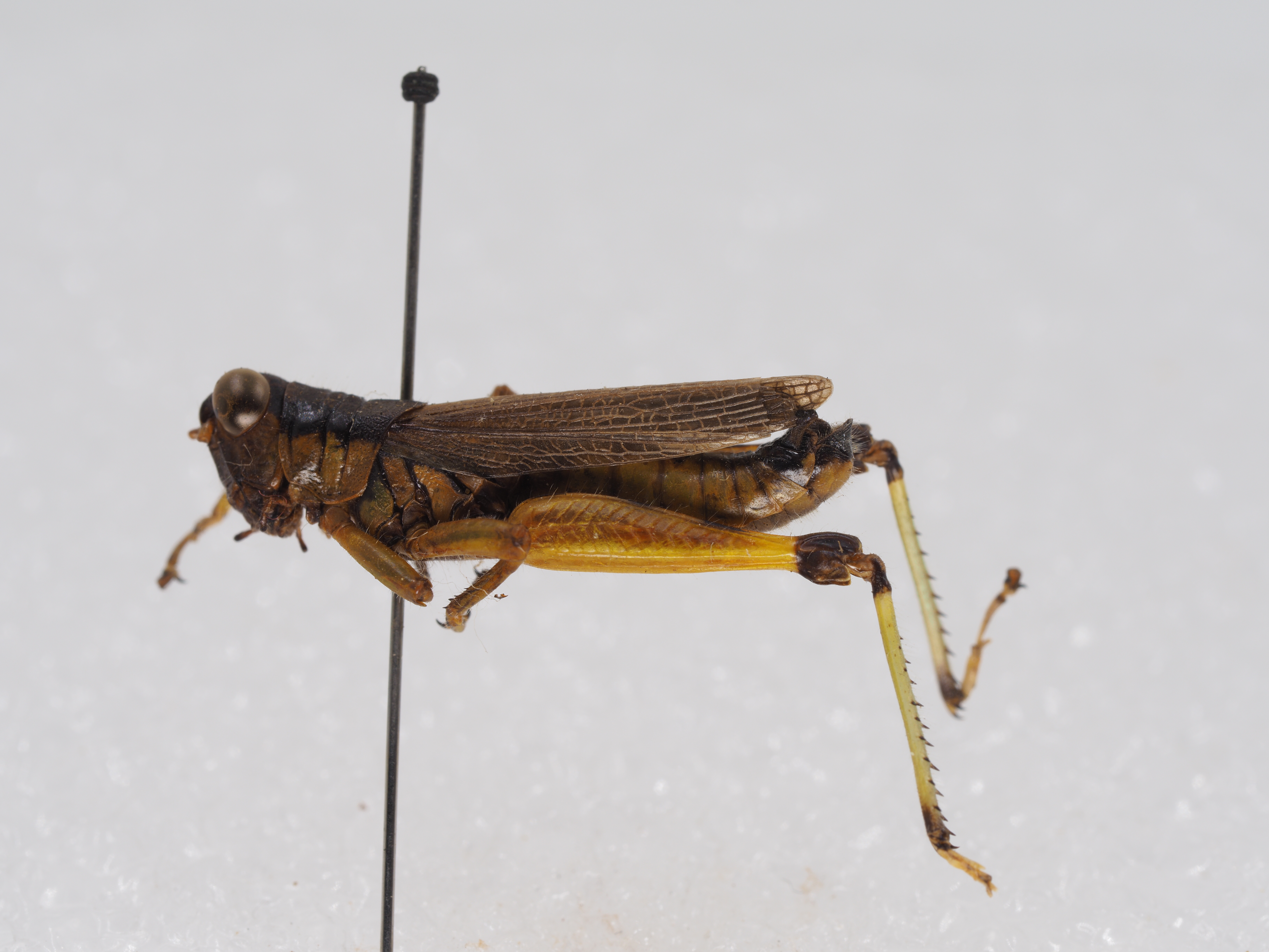 体色:黄褐色。自复眼之后方,向后延伸,沿前胸背板侧片之上缘,到达侧片之后缘,各具有一条较宽的纵行之黑色斑纹。前胸背板中隆线为黑色。前翅褐色,后翅褐色,后翅基部淡色,其后缘及端部染以淡烟色,翅脉黑色。后足股节上侧具有3个黑褐色横斑纹,其中近基部之一较小,膝部为黑褐色。股节外侧略带绿色,内侧及底侧为黄色。后足胫节基部为黑色,端部为烟色,端部底侧烟色斑纹较长,几达胫节长的1/3,其余为蓝绿色。腹端背侧为黑褐色。