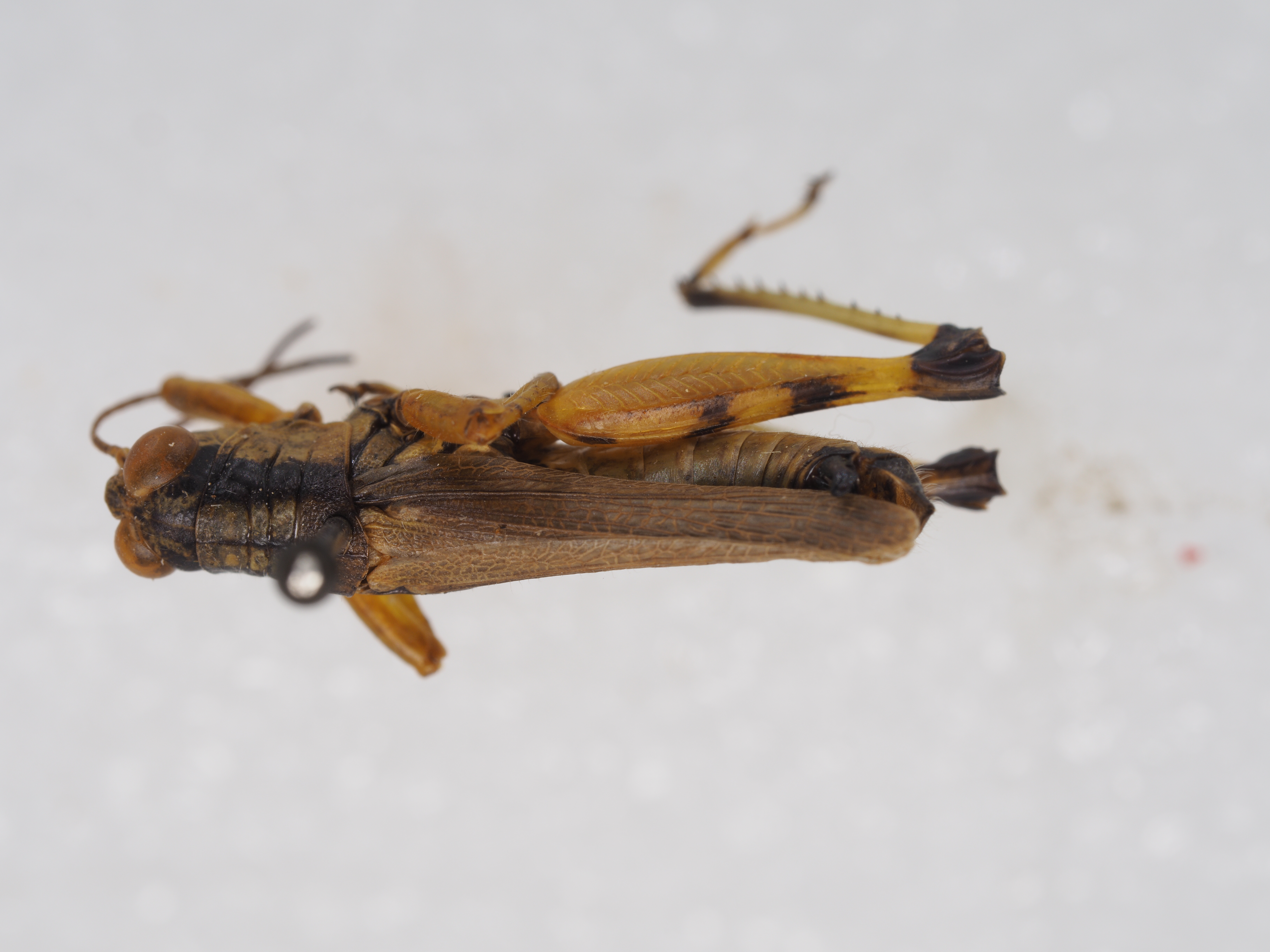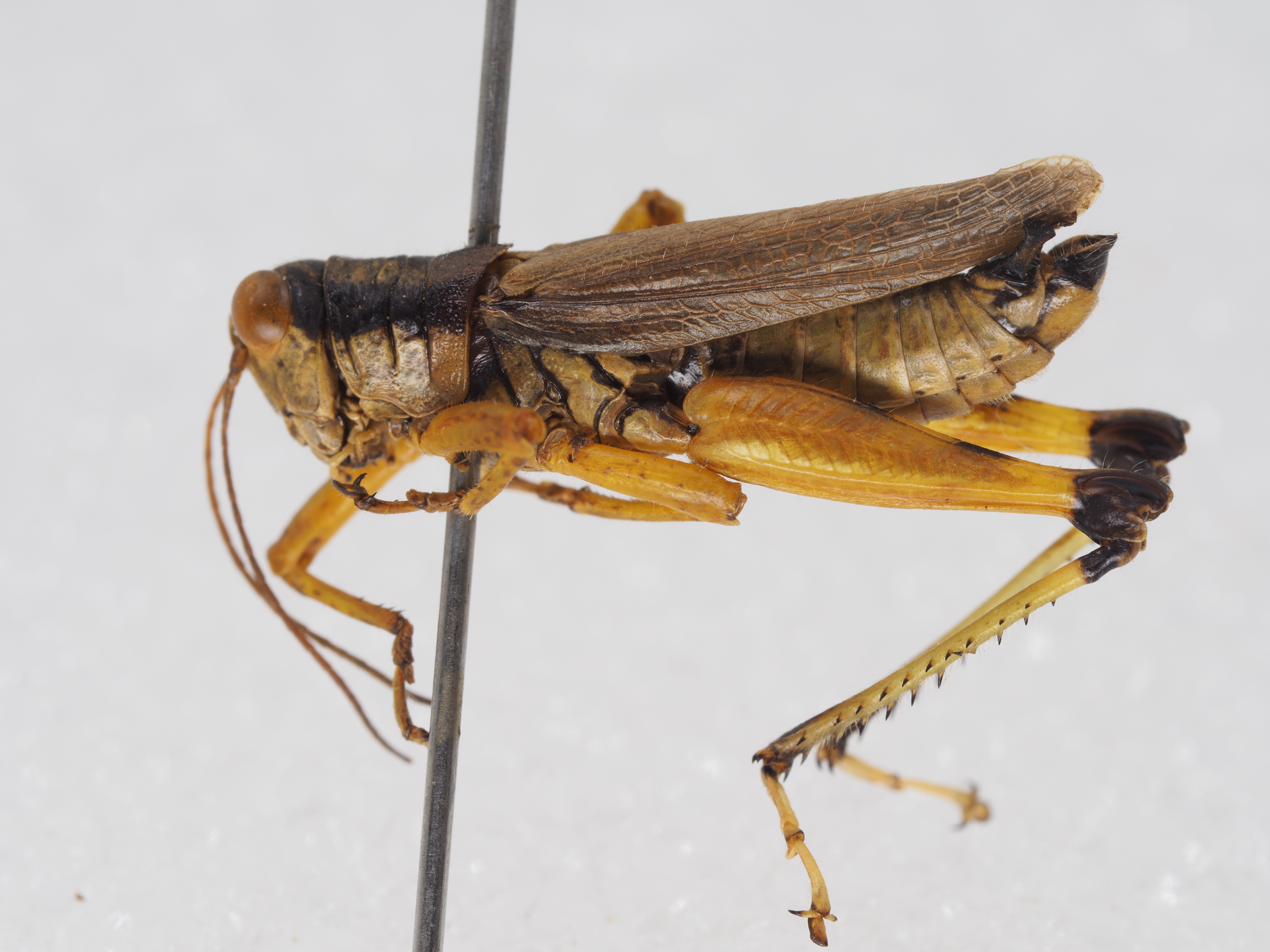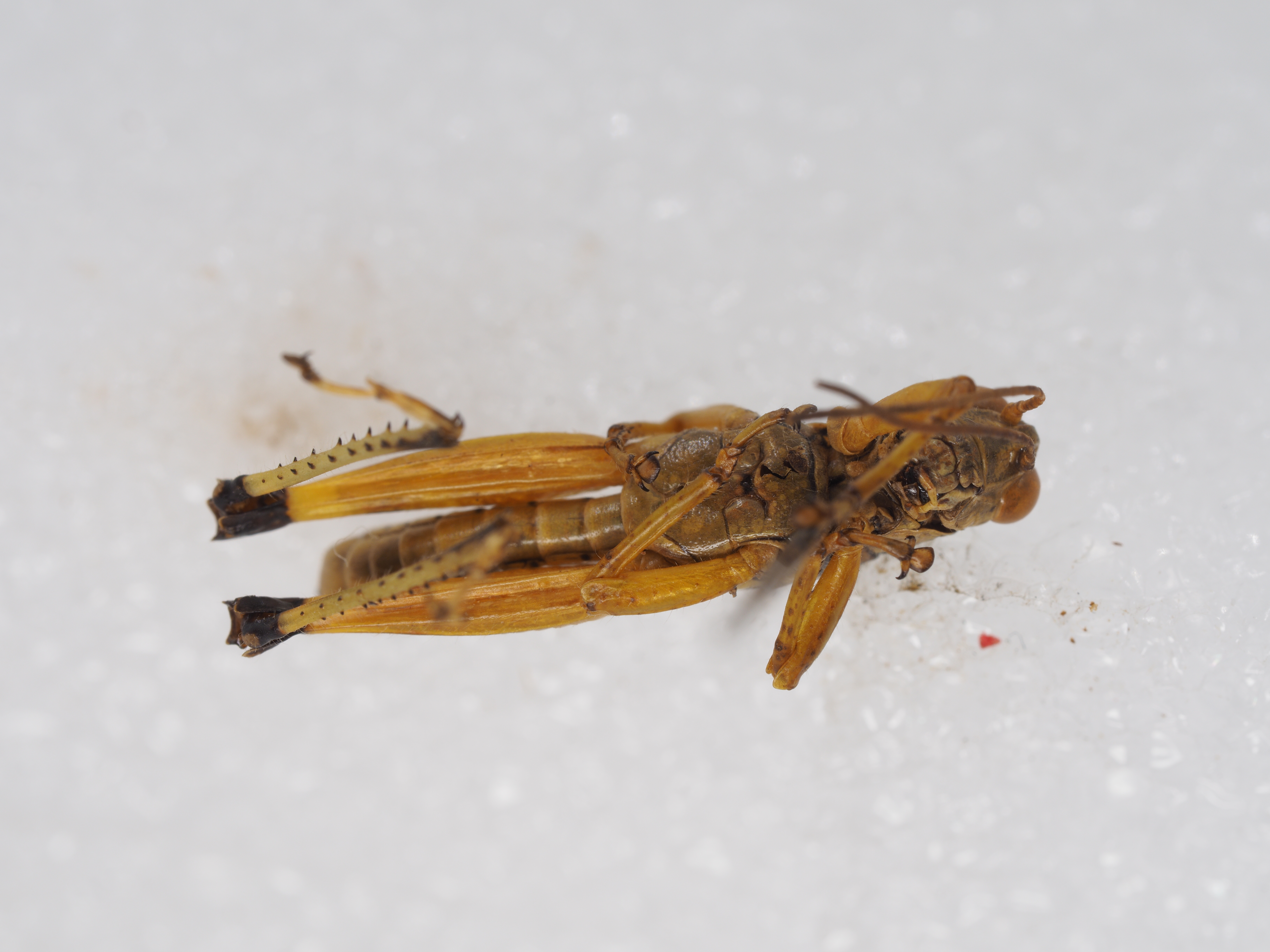 体色:黄褐色。自复眼之后方,向后延伸,沿前胸背板侧片之上缘,到达侧片之后缘,各具有一条较宽的纵行之黑色斑纹。前胸背板中隆线为黑色。前翅褐色,后翅褐色,后翅基部淡色,其后缘及端部染以淡烟色,翅脉黑色。后足股节上侧具有3个黑褐色横斑纹,其中近基部之一较小,膝部为黑褐色。股节外侧略带绿色,内侧及底侧为黄色。后足胫节基部为黑色,端部为烟色,端部底侧烟色斑纹较长,几达胫节长的1/3,其余为蓝绿色。腹端背侧为黑褐色。