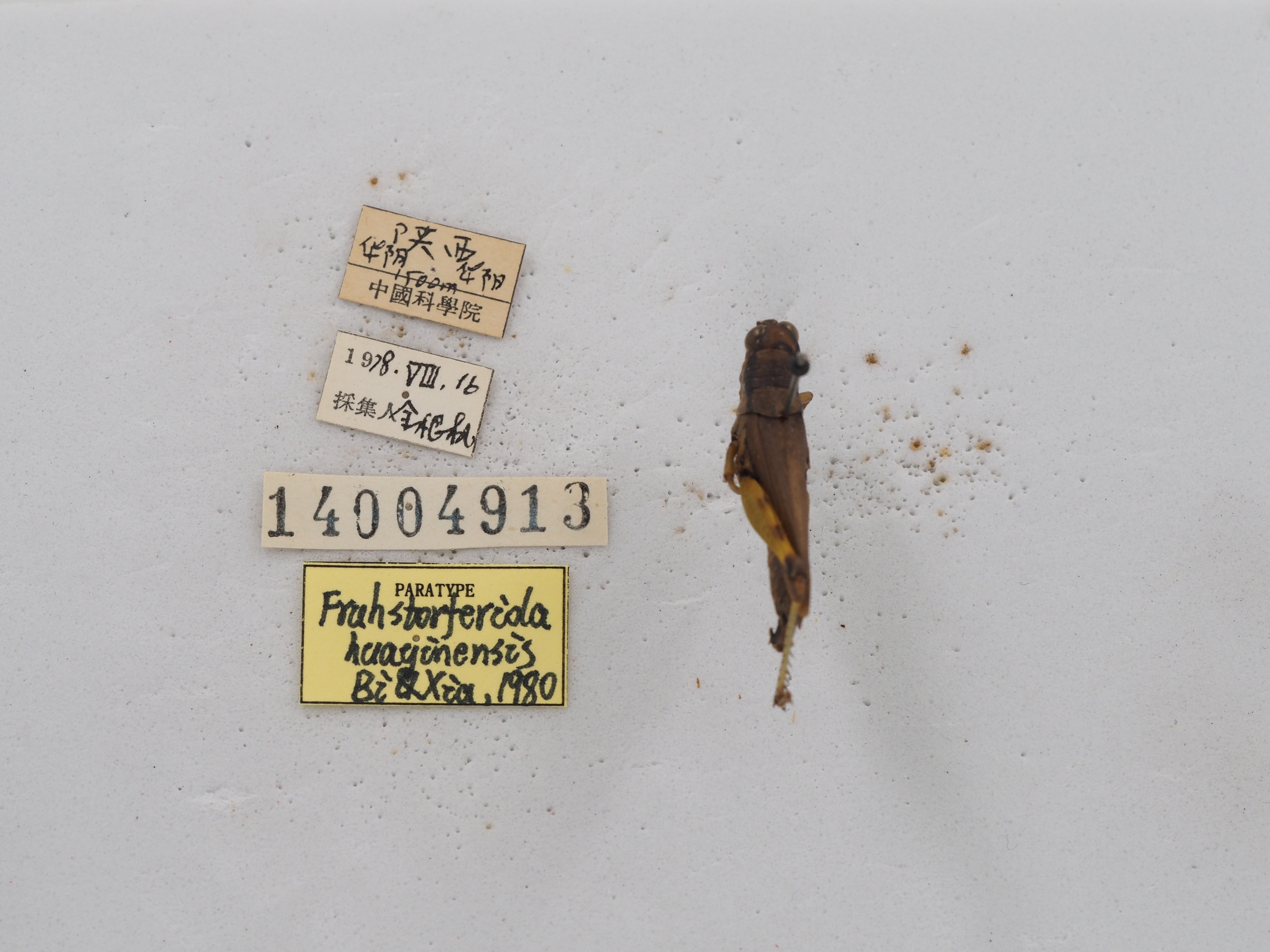 描述:雄性 体型显著较小,腹面具有较密的绒毛。头部短小,向上隆起,明显高出于前胸背板。头顶略向前倾斜,两侧缘隆线明显,中央低凹,其在复眼前之最宽处明显宽于颜面隆起。颜面明显向后倾斜,颜面隆起侧缘平行,在中央单眼之下具纵沟,到达唇基。复眼大而突出,卵圆形,其垂直的直径为其水平直径的1.1~1.4倍,为其眼下沟长度的1.4~2.0倍。触角细长,远远超过前胸背板后缘,24节。前胸背板狭长,其前缘宽平,后缘为圆弧形,缺侧隆线;中隆线在沟后区较明显;3条横沟均切断中隆线;后横沟位于后端,为沟前区的长度的1.2倍,沟后区具粗大刻点。前胸腹板突为短锥形,略向后倾斜,端部狭锐。前、后翅均发达,几乎等长,但都不超过后足股节端部,刚到达或略不到达股节端部;端部狭圆。后足股节匀称,上隆线缺细齿;上侧外缘具刺8~11个,缺外端刺,内缘具刺10~11个(包括内端刺)。腹端最后一节后缘具有较不明显的尾片,圆形,基部明显分开。肛上板为短三角形,其宽略大于长,中央自基部具有细长纵沟,纵沟之两侧低凹;基部两侧各具一短隆线,端部两侧也各具一短线。尾须侧扁,端部明显向内弯曲,其长刚超过肛上板端部;由侧面观之,中部略狭,基部较宽,端部明显膨大(图118f)。下生殖板为短锥形,端部细狭而向上延伸。