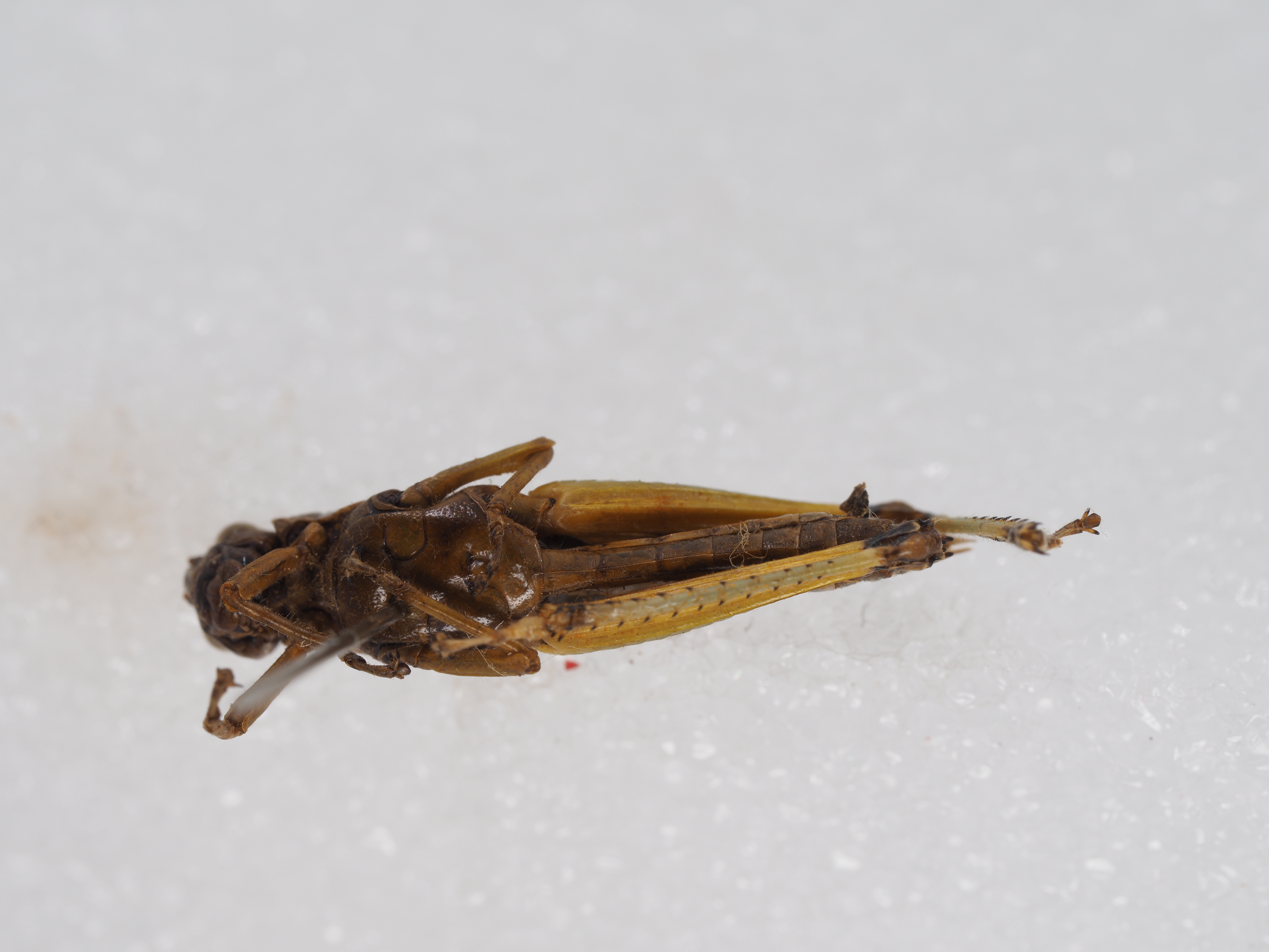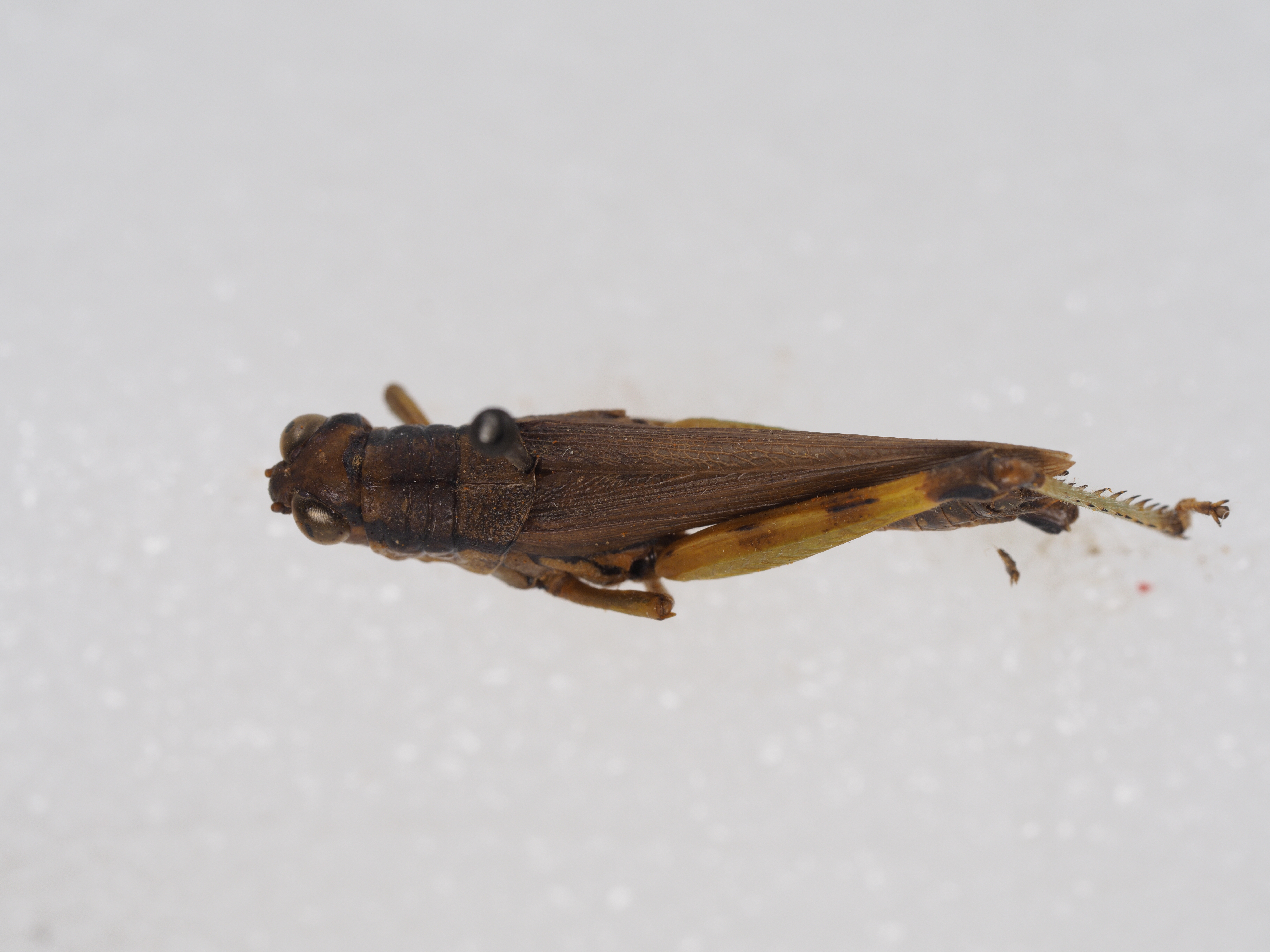体色:黄褐色。自复眼之后方,向后延伸,沿前胸背板侧片之上缘,到达侧片之后缘,各具有一条较宽的纵行之黑色斑纹。前胸背板中隆线为黑色。前翅褐色,后翅褐色,后翅基部淡色,其后缘及端部染以淡烟色,翅脉黑色。后足股节上侧具有3个黑褐色横斑纹,其中近基部之一较小,膝部为黑褐色。股节外侧略带绿色,内侧及底侧为黄色。后足胫节基部为黑色,端部为烟色,端部底侧烟色斑纹较长,几达胫节长的1/3,其余为蓝绿色。腹端背侧为黑褐色。