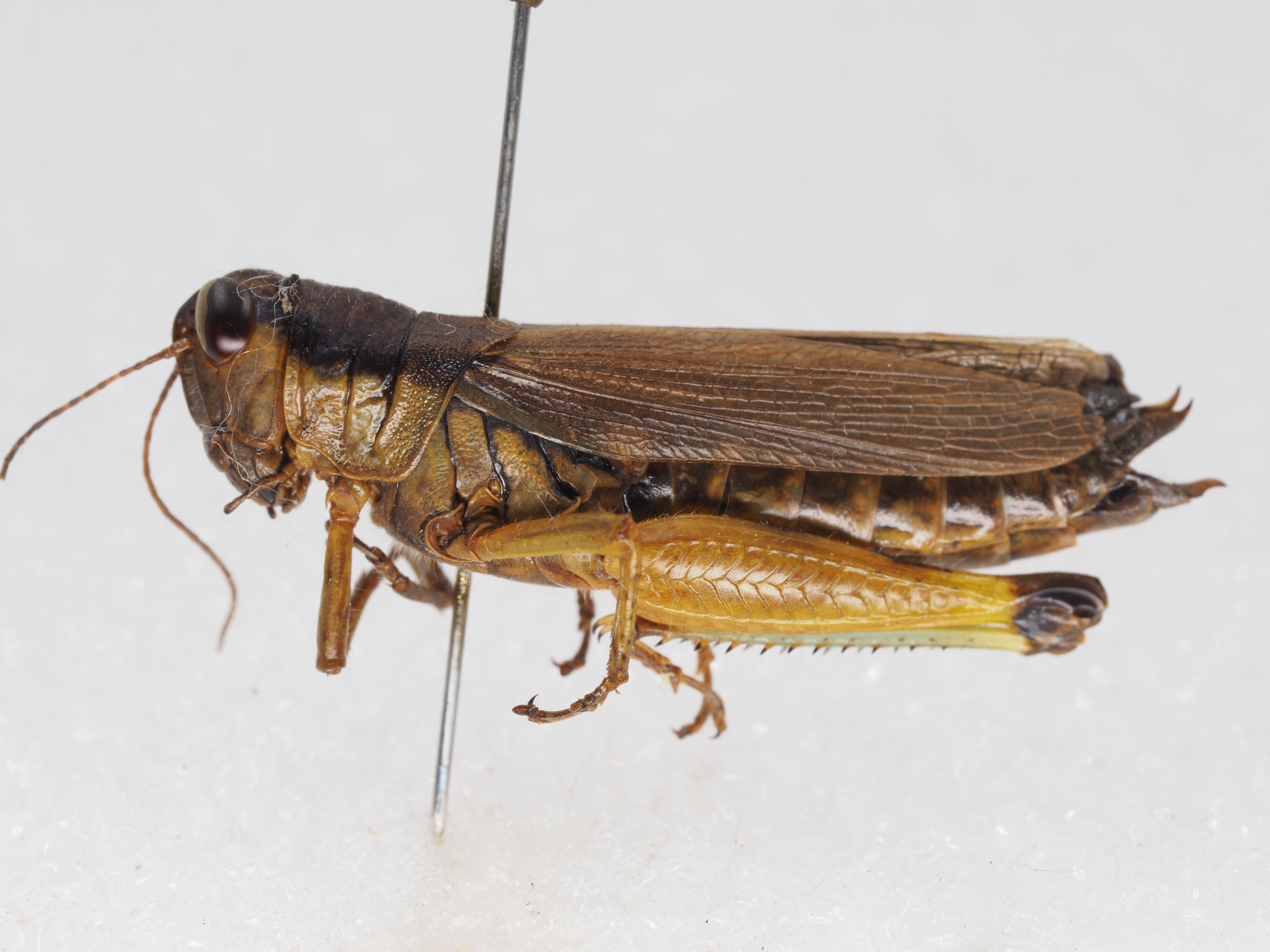 体色:黄褐色。自复眼之后方,向后延伸,沿前胸背板侧片之上缘,到达侧片之后缘,各具有一条较宽的纵行之黑色斑纹。前胸背板中隆线为黑色。前翅褐色,后翅褐色,后翅基部淡色,其后缘及端部染以淡烟色,翅脉黑色。后足股节上侧具有3个黑褐色横斑纹,其中近基部之一较小,膝部为黑褐色。股节外侧略带绿色,内侧及底侧为黄色。后足胫节基部为黑色,端部为烟色,端部底侧烟色斑纹较长,几达胫节长的1/3,其余为蓝绿色。腹端背侧为黑褐色。