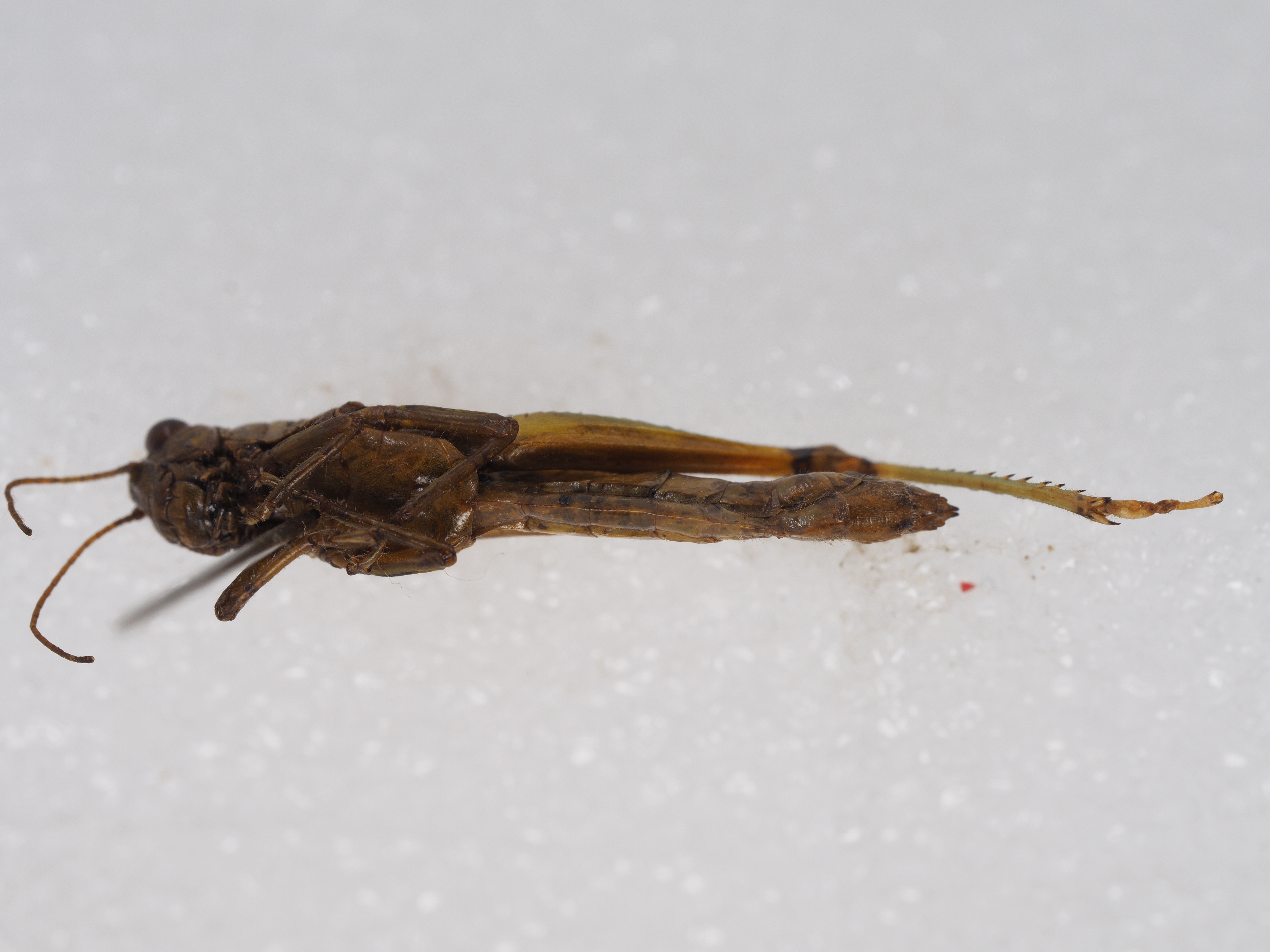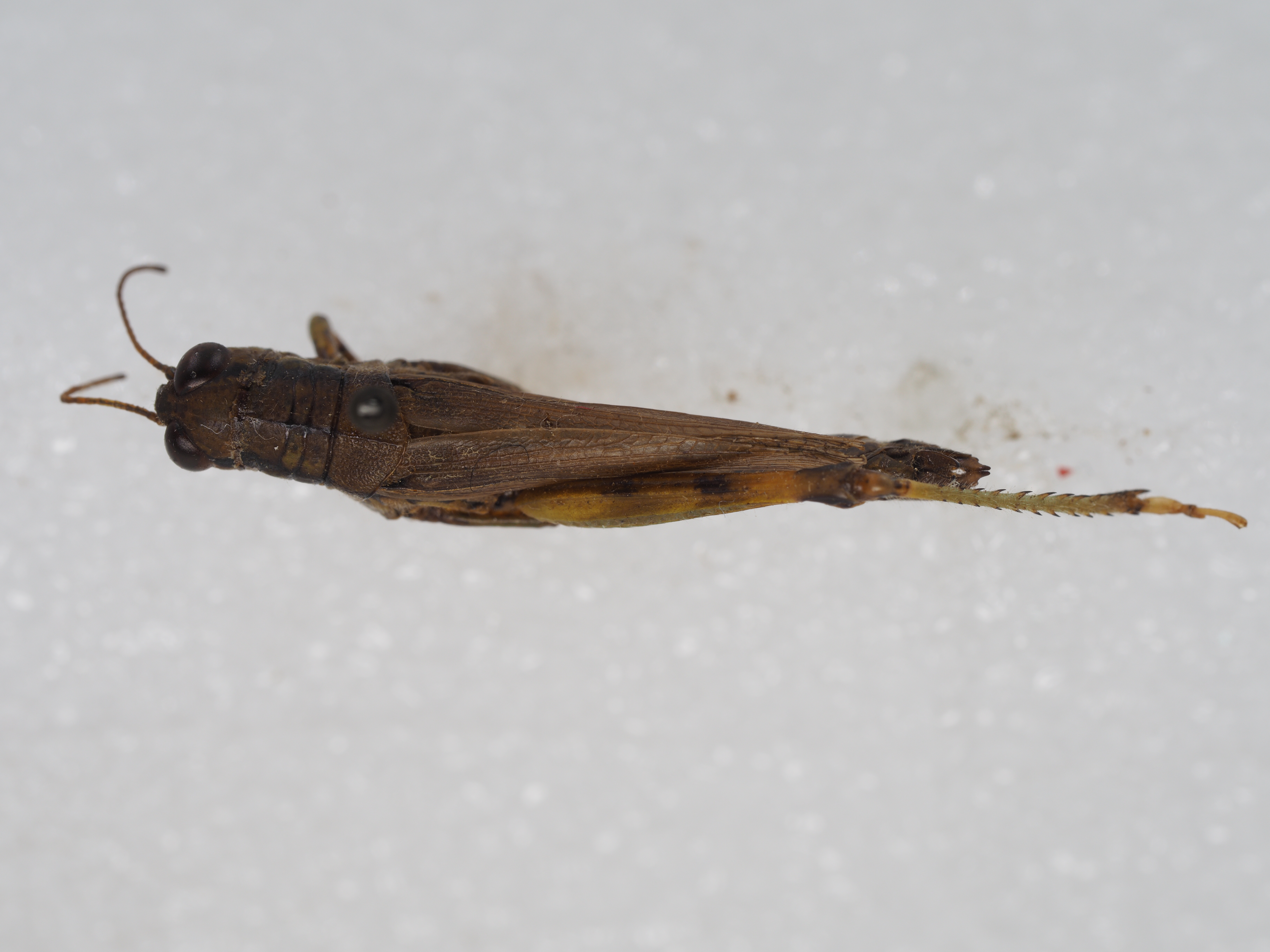 体色:黄褐色。自复眼之后方,向后延伸,沿前胸背板侧片之上缘,到达侧片之后缘,各具有一条较宽的纵行之黑色斑纹。前胸背板中隆线为黑色。前翅褐色,后翅褐色,后翅基部淡色,其后缘及端部染以淡烟色,翅脉黑色。后足股节上侧具有3个黑褐色横斑纹,其中近基部之一较小,膝部为黑褐色。股节外侧略带绿色,内侧及底侧为黄色。后足胫节基部为黑色,端部为烟色,端部底侧烟色斑纹较长,几达胫节长的1/3,其余为蓝绿色。腹端背侧为黑褐色。
