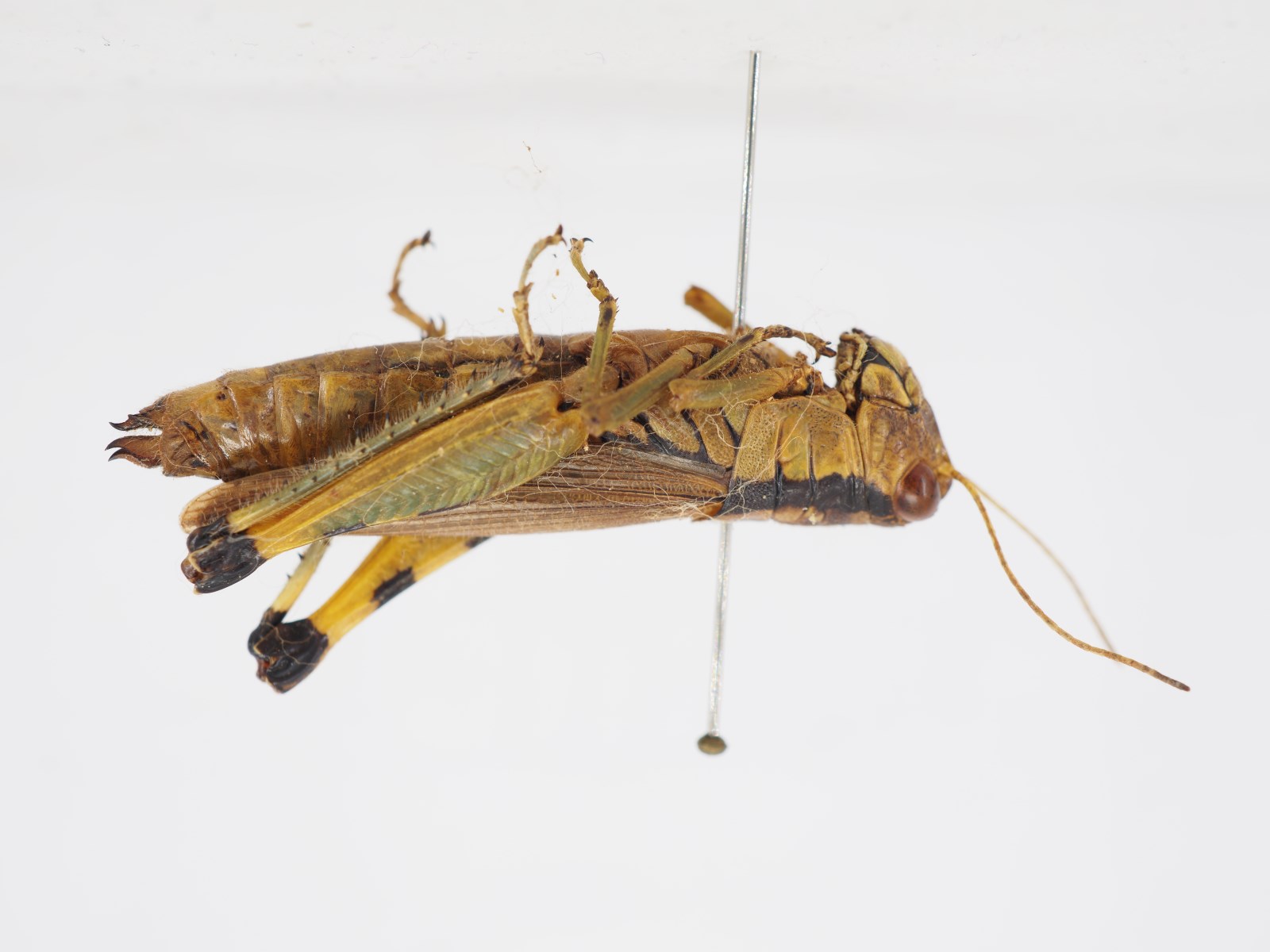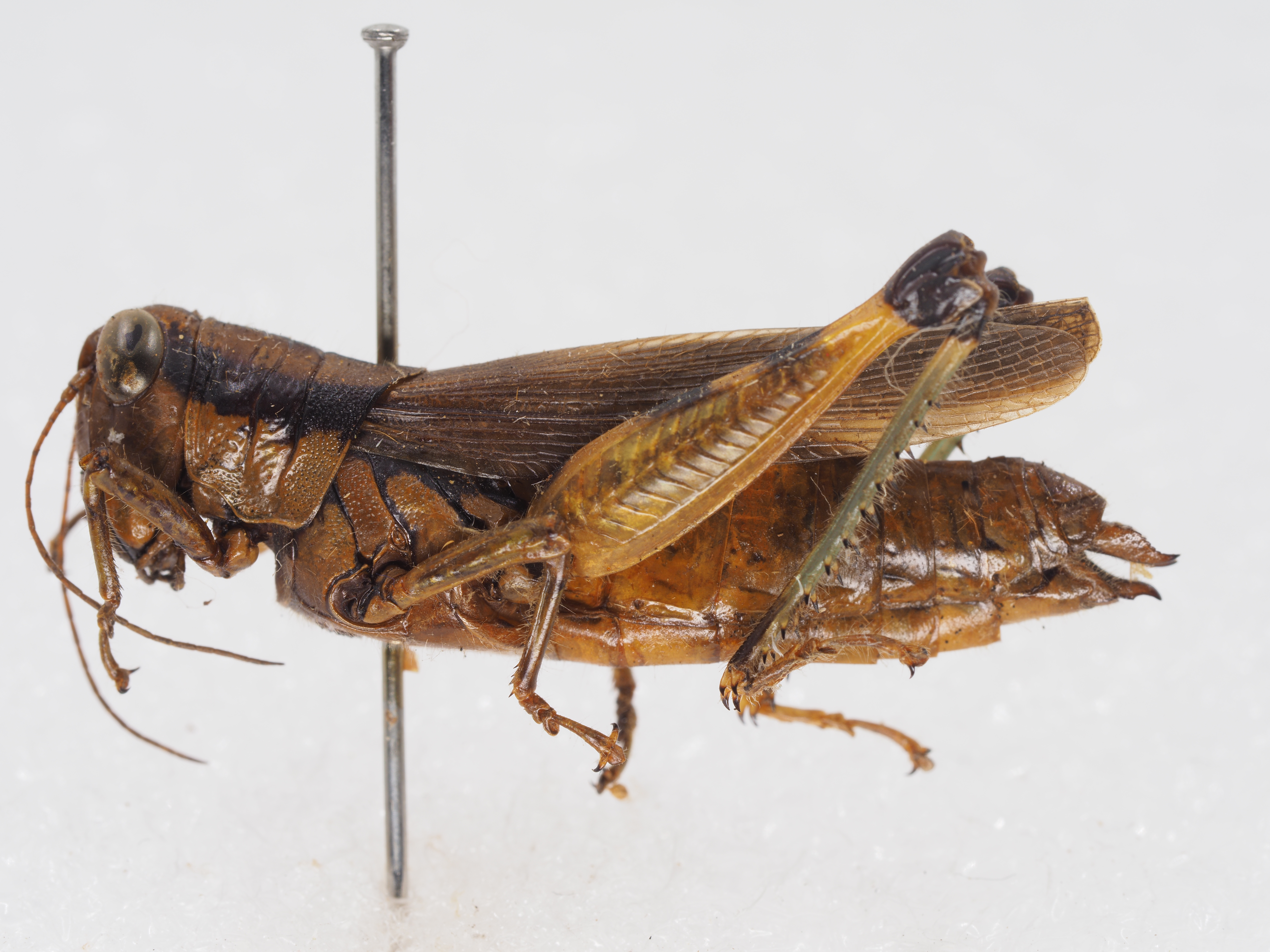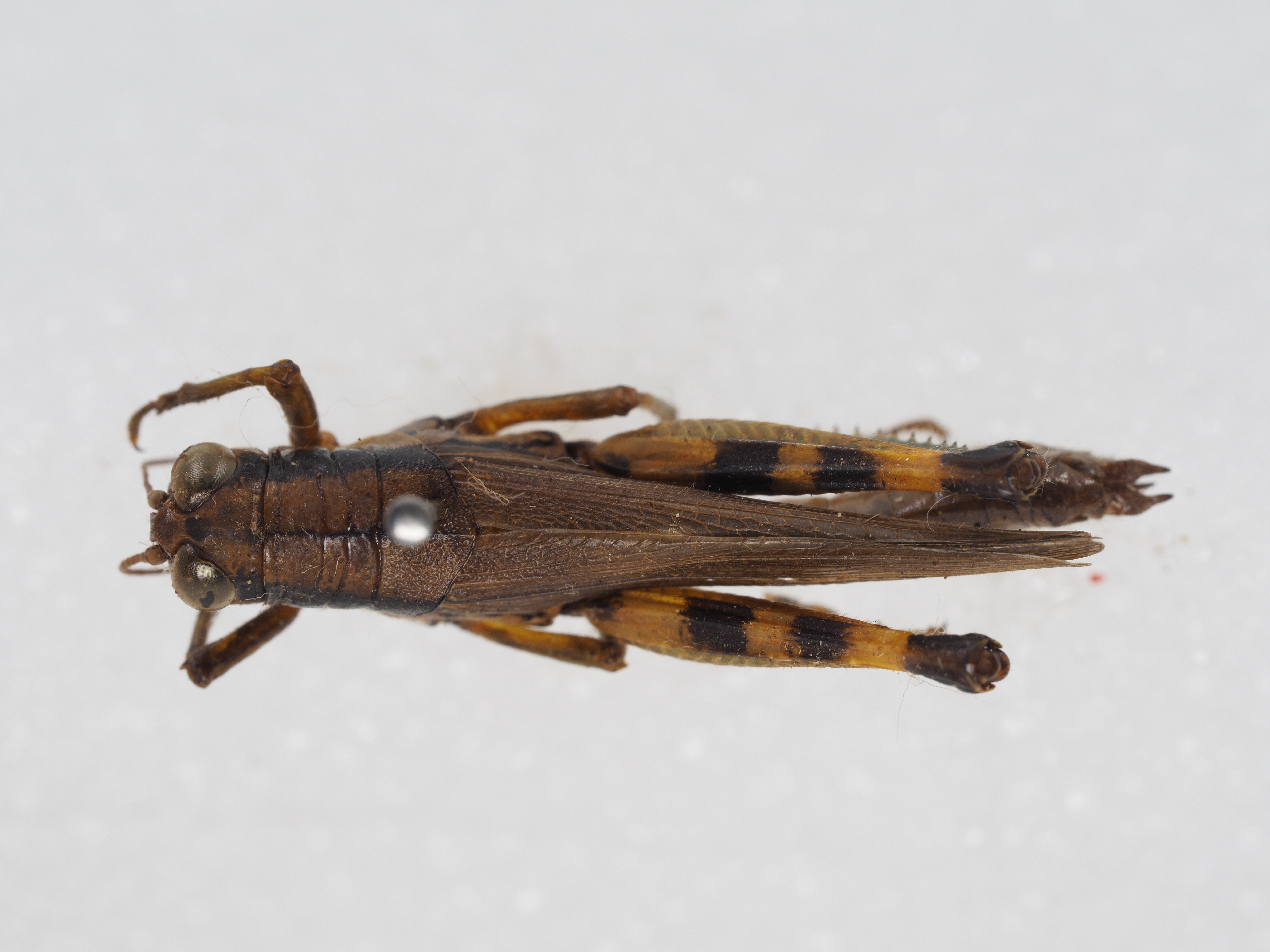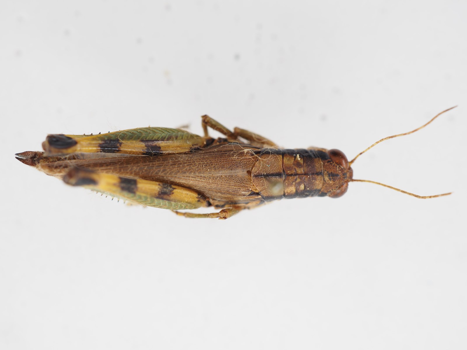 体色:黄褐色。自复眼之后方,向后延伸,沿前胸背板侧片之上缘,到达侧片之后缘,各具有一条较宽的纵行之黑色斑纹。前胸背板中隆线为黑色。前翅褐色,后翅基部本色,端部染以烟色,翅脉黑色。后足股节上侧具有三个黑色横斑纹,其中基部之一较小或不明显;膝部为黑色;股节外侧略带绿色,内侧及底侧黄色。后足胫节基部为黑色,在黑色之前并具不明显的淡色环,端部为烟色,其底侧烟色较长,几达胫节长之1/3,其余为蓝绿色。腹端背侧为烟色。