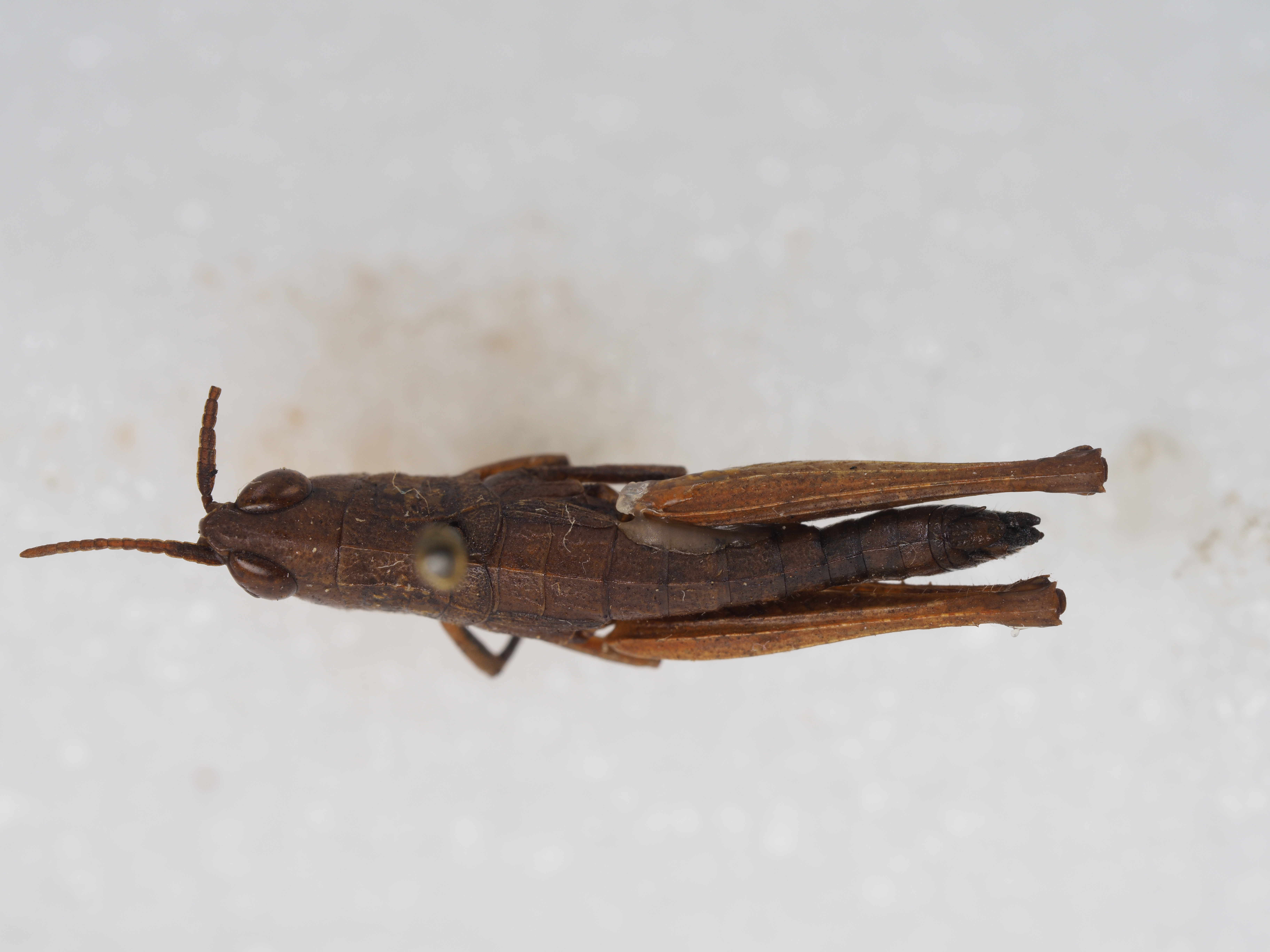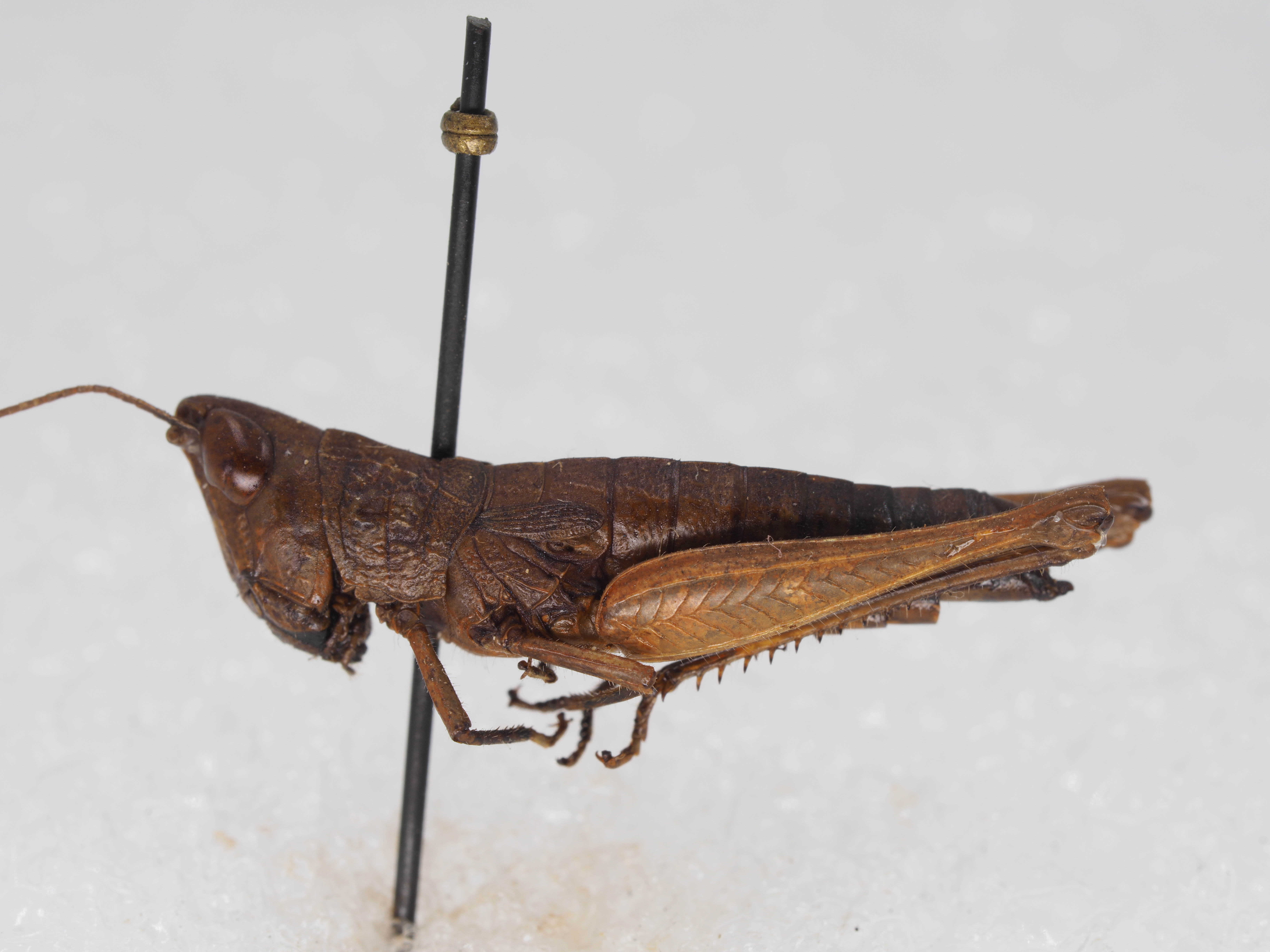 描述:雄性 体小型,细长,略侧扁,具细刻点。颜面侧观颇向后倾斜,与头顶组成锐角,颜面隆起侧缘明显,在中单眼之上近乎平形,之下向外展开直达唇基,中央形成小凹,并具细点刻。颜面侧隆线明显,略弯曲。头顶较长,向前突出,在中部之前较平,中央具短纵隆线,其后略为隆起,中部具弧形浅凹沟。头侧窝缺。后头略为隆起,具粗刻点。触角剑状,超过前胸背板的后缘,基部之半的节近扁平,端部之半的节较细长。复眼长卵形,其长径为眼下沟长的2倍,为横径的1.5倍。前胸背板中部略缩狭,前缘平直,中、侧隆线均明显,侧隆线在中部几乎平行,前端和后端均略向外开张,前、中横沟在背面均不明显,仅后横沟割断中隆线,后横沟位于后部,沟前区长为沟后区长的3倍;后缘中央凹陷较深(图116)。前胸背板侧片之前下角为钝角形,后下角近乎直角,后缘略内凹。中胸腹板侧叶间之中隔较宽,其宽明显大于长。前、后翅均不发达,鳞片状,侧置,前翅不到达或刚到达第一腹节背板的后缘;后翅微小。后足股节细长,上隆线平滑,端部形成一小齿,下膝侧片顶圆形。后足胫节与股节近乎等长,内、外侧均具刺11—12个,缺外端刺。跗节较短,其第1节的长度为第2、3节长度之和;爪较短,中垫较大,但不到达爪的端部。腹部略侧扁,第1腹节具较大的鼓膜器。肛上板三角形,基部中央具纵沟,端半部略低凹,端部钝圆。
