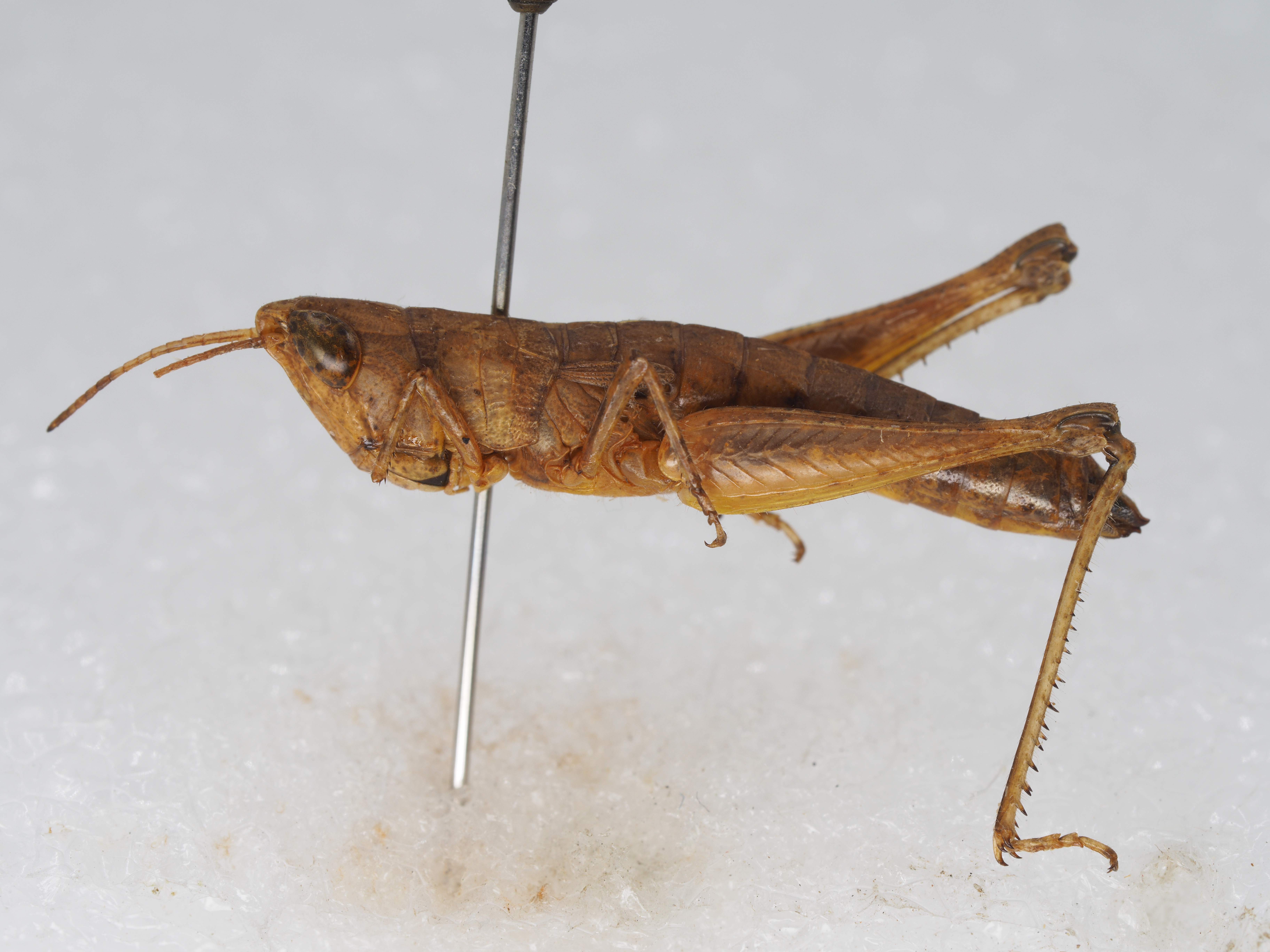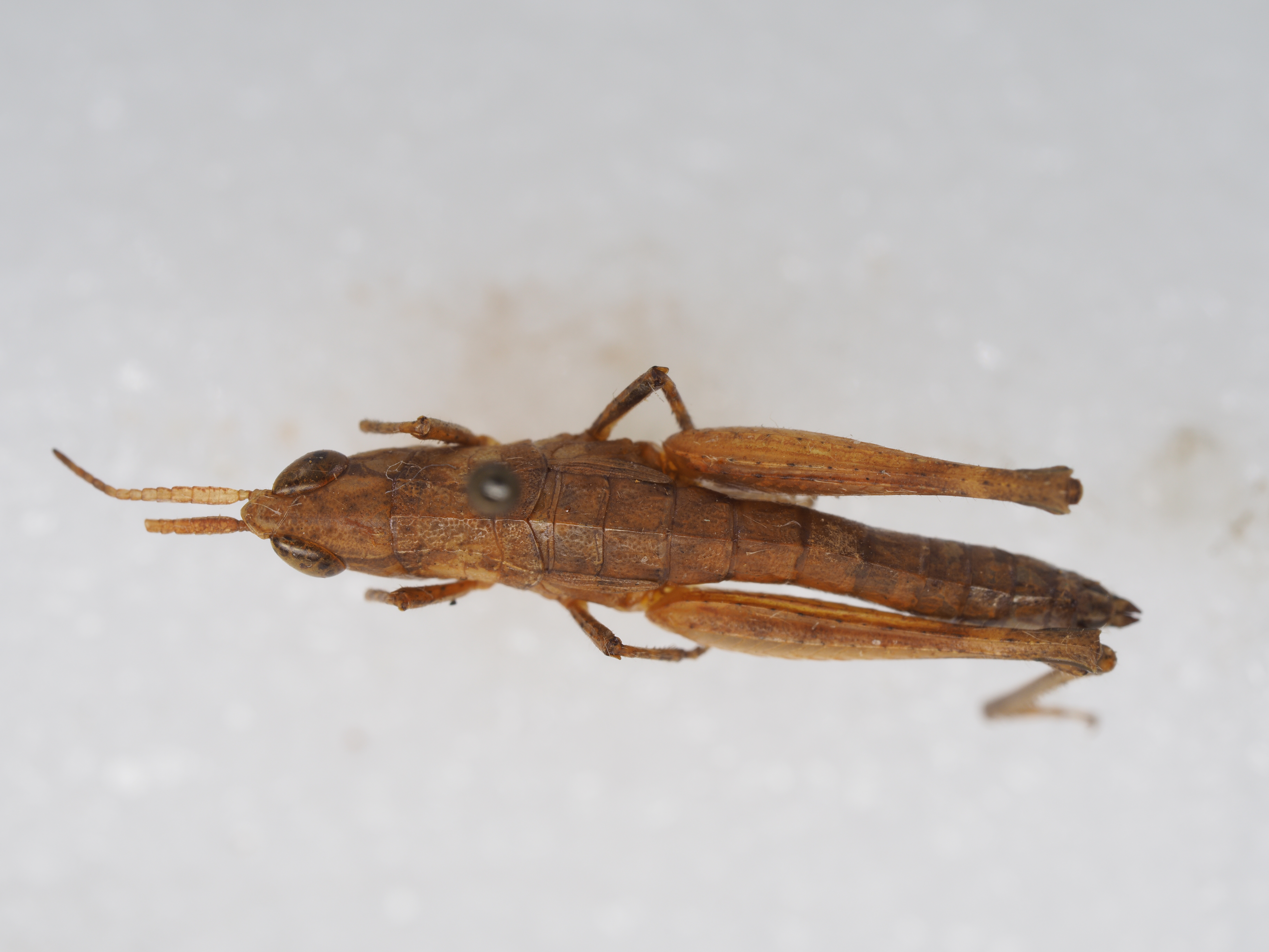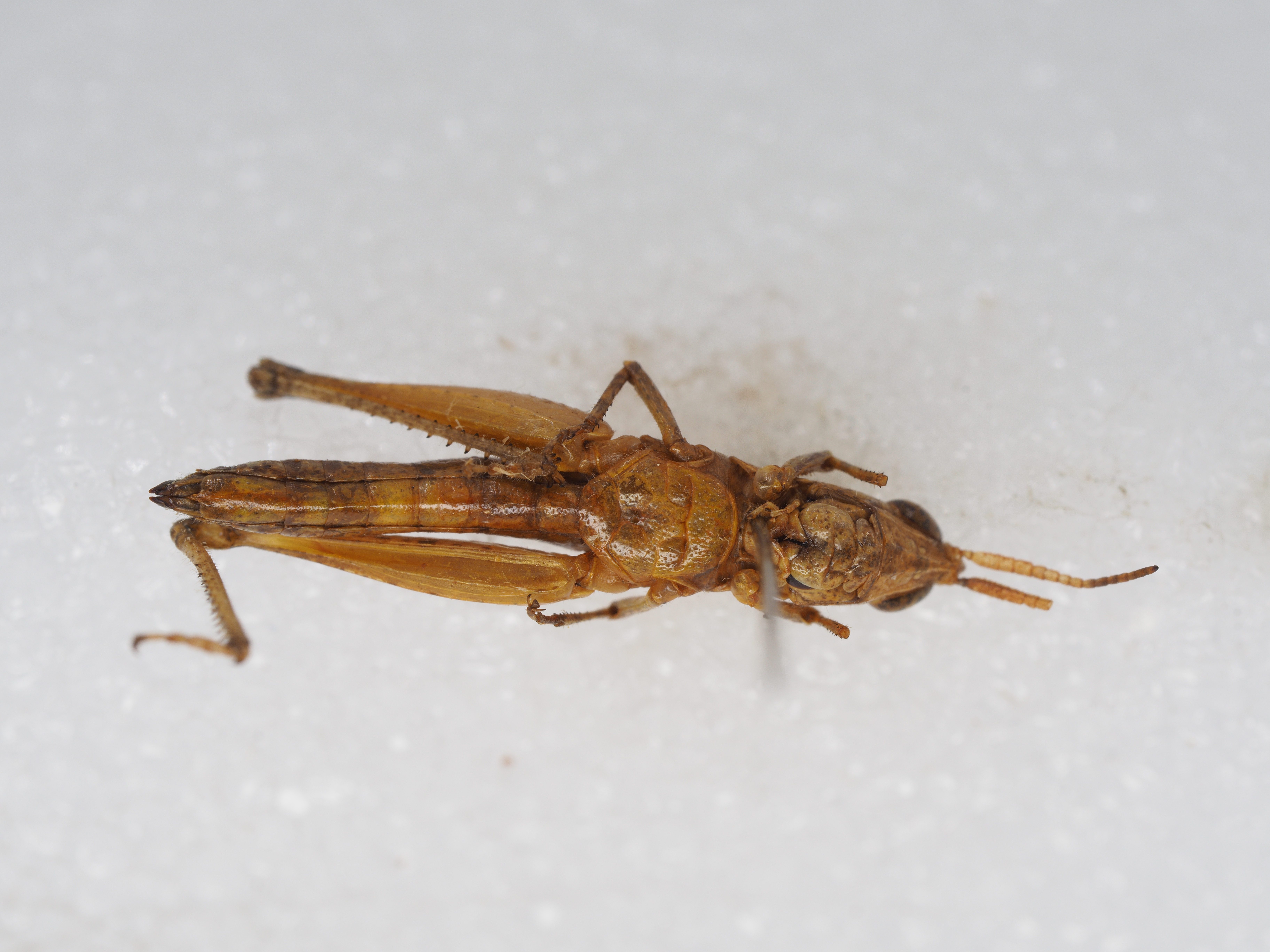 描述:雄性 体小型,细长,略侧扁,具细刻点。颜面侧观颇向后倾斜,与头顶组成锐角,颜面隆起侧缘明显,在中单眼之上近乎平形,之下向外展开直达唇基,中央形成小凹,并具细点刻。颜面侧隆线明显,略弯曲。头顶较长,向前突出,在中部之前较平,中央具短纵隆线,其后略为隆起,中部具弧形浅凹沟。头侧窝缺。后头略为隆起,具粗刻点。触角剑状,超过前胸背板的后缘,基部之半的节近扁平,端部之半的节较细长。复眼长卵形,其长径为眼下沟长的2倍,为横径的1.5倍。前胸背板中部略缩狭,前缘平直,中、侧隆线均明显,侧隆线在中部几乎平行,前端和后端均略向外开张,前、中横沟在背面均不明显,仅后横沟割断中隆线,后横沟位于后部,沟前区长为沟后区长的3倍;后缘中央凹陷较深(图116)。前胸背板侧片之前下角为钝角形,后下角近乎直角,后缘略内凹。中胸腹板侧叶间之中隔较宽,其宽明显大于长。前、后翅均不发达,鳞片状,侧置,前翅不到达或刚到达第一腹节背板的后缘;后翅微小。后足股节细长,上隆线平滑,端部形成一小齿,下膝侧片顶圆形。后足胫节与股节近乎等长,内、外侧均具刺11—12个,缺外端刺。跗节较短,其第1节的长度为第2、3节长度之和;爪较短,中垫较大,但不到达爪的端部。腹部略侧扁,第1腹节具较大的鼓膜器。肛上板三角形,基部中央具纵沟,端半部略低凹,端部钝圆。
