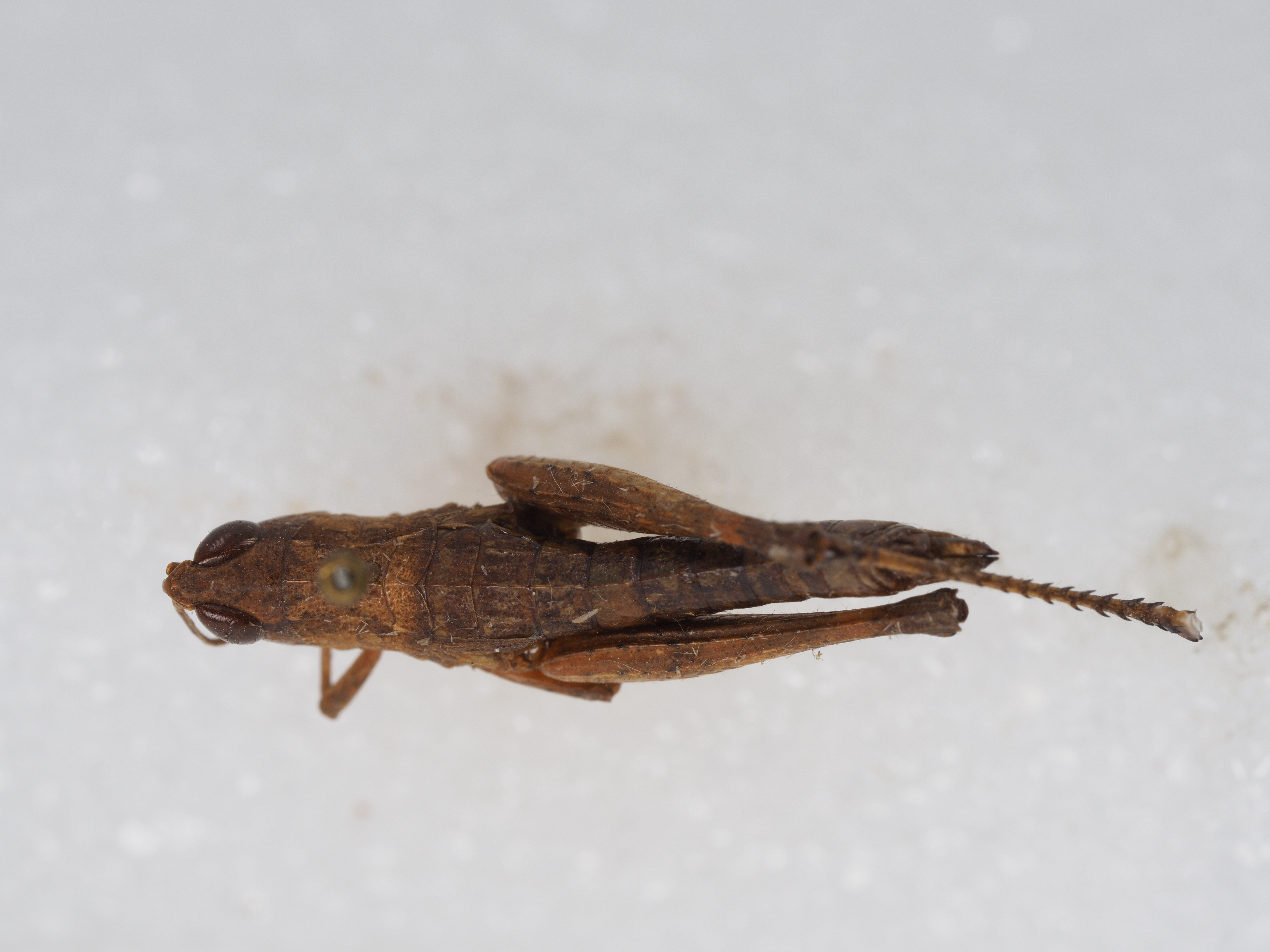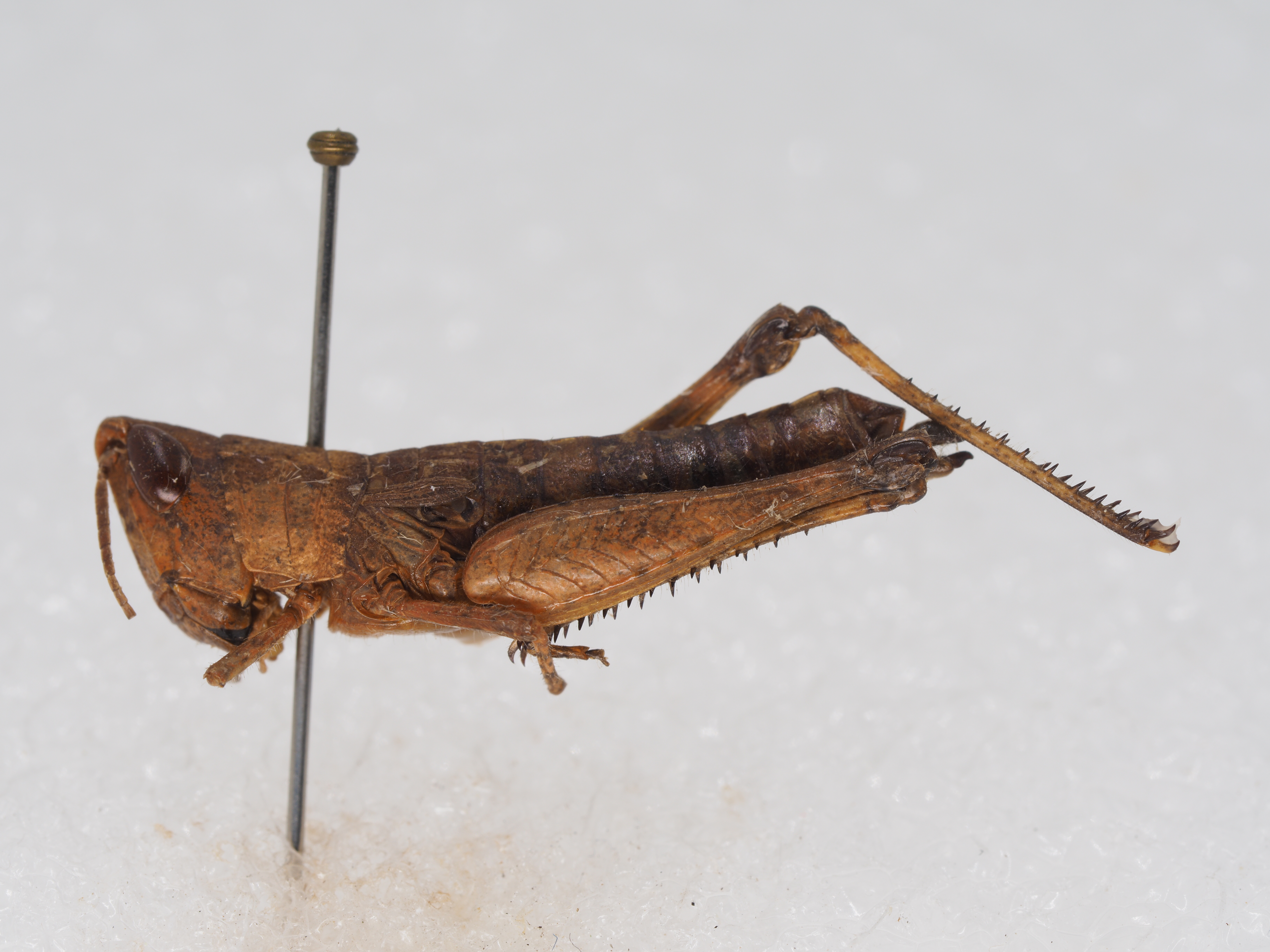 描述:雄性 体小型,细长,略侧扁,具细刻点。颜面侧观颇向后倾斜,与头顶组成锐角,颜面隆起侧缘明显,在中单眼之上近乎平形,之下向外展开直达唇基,中央形成小凹,并具细点刻。颜面侧隆线明显,略弯曲。头顶较长,向前突出,在中部之前较平,中央具短纵隆线,其后略为隆起,中部具弧形浅凹沟。头侧窝缺。后头略为隆起,具粗刻点。触角剑状,超过前胸背板的后缘,基部之半的节近扁平,端部之半的节较细长。复眼长卵形,其长径为眼下沟长的2倍,为横径的1.5倍。前胸背板中部略缩狭,前缘平直,中、侧隆线均明显,侧隆线在中部几乎平行,前端和后端均略向外开张,前、中横沟在背面均不明显,仅后横沟割断中隆线,后横沟位于后部,沟前区长为沟后区长的3倍;后缘中央凹陷较深(图116)。前胸背板侧片之前下角为钝角形,后下角近乎直角,后缘略内凹。中胸腹板侧叶间之中隔较宽,其宽明显大于长。前、后翅均不发达,鳞片状,侧置,前翅不到达或刚到达第一腹节背板的后缘;后翅微小。后足股节细长,上隆线平滑,端部形成一小齿,下膝侧片顶圆形。后足胫节与股节近乎等长,内、外侧均具刺11—12个,缺外端刺。跗节较短,其第1节的长度为第2、3节长度之和;爪较短,中垫较大,但不到达爪的端部。腹部略侧扁,第1腹节具较大的鼓膜器。肛上板三角形,基部中央具纵沟,端半部略低凹,端部钝圆。