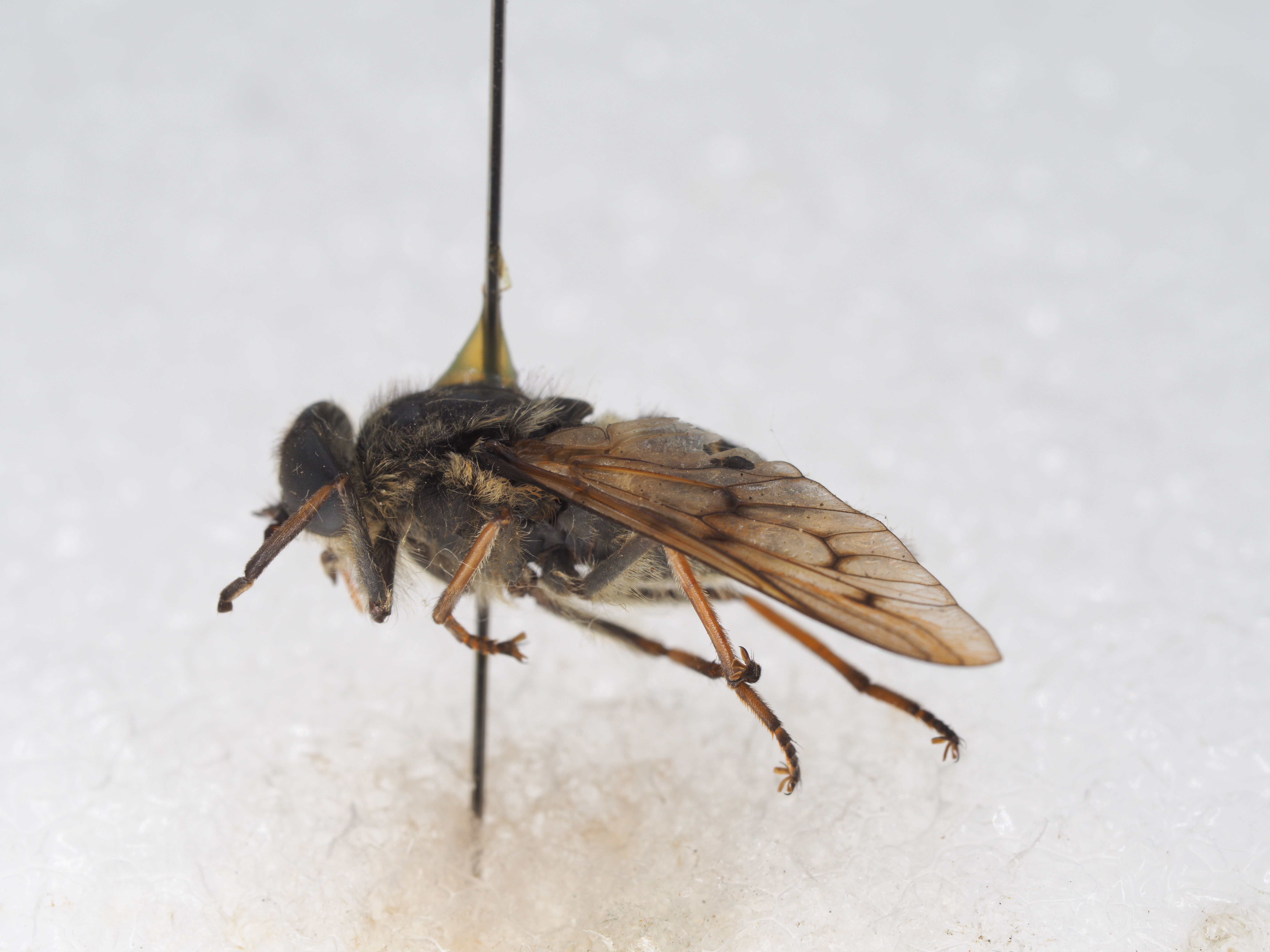 胸部,盾片及小盾片黑色,无纹饰,复深棕色粉被,侧片黑、黄毛夹杂。翅横脉处有黑斑。足黑色,中、后足胫节大部分黄色,末端黑色。腹部,背板黑色,着生黑毛,每节后缘着黄毛,两侧淡黄色毛,第I节中部有淡黄色毛,第II节两侧有橙色斑。腹板黑色,复灰粉被,着生黑毛及黄毛。