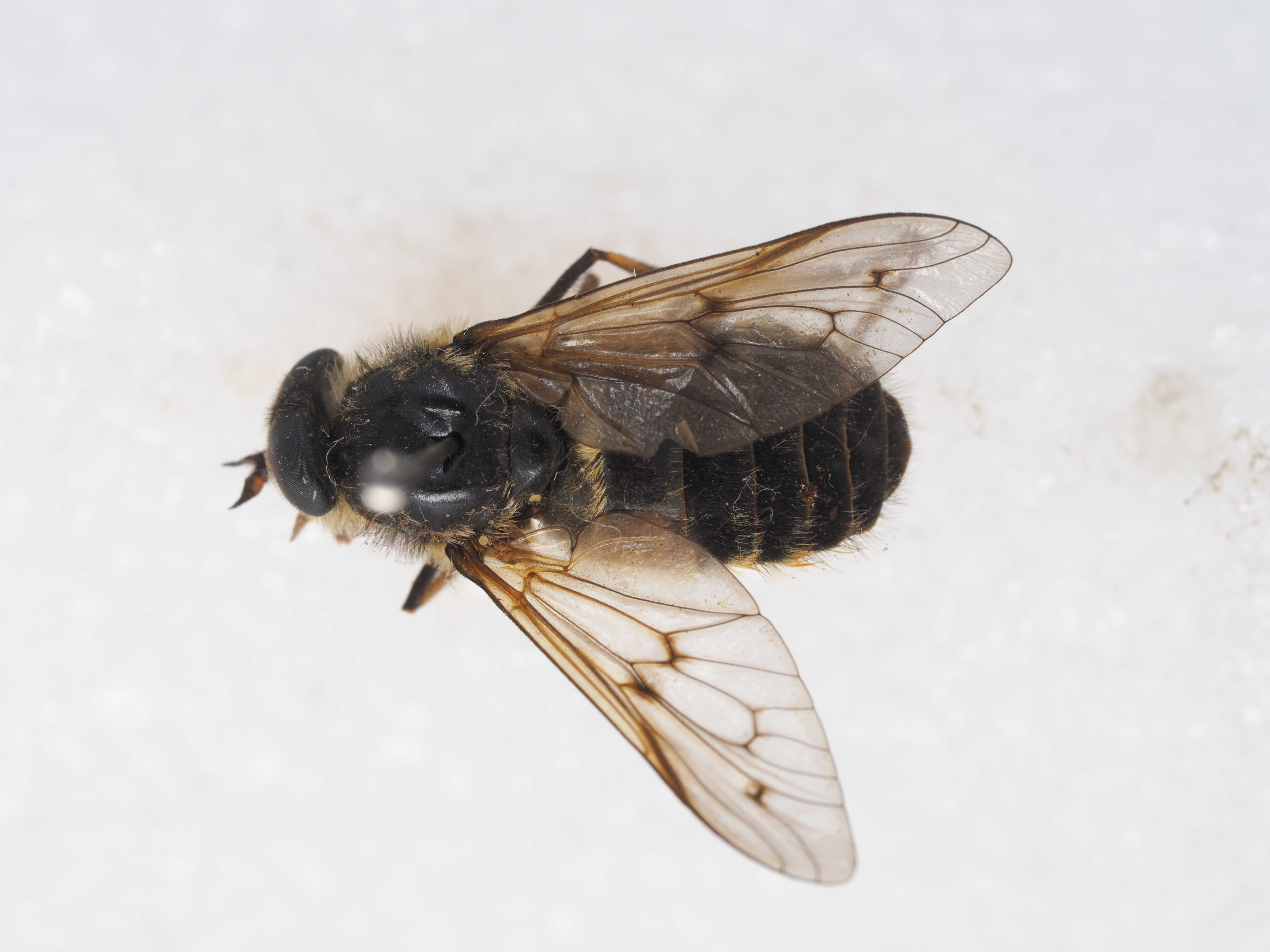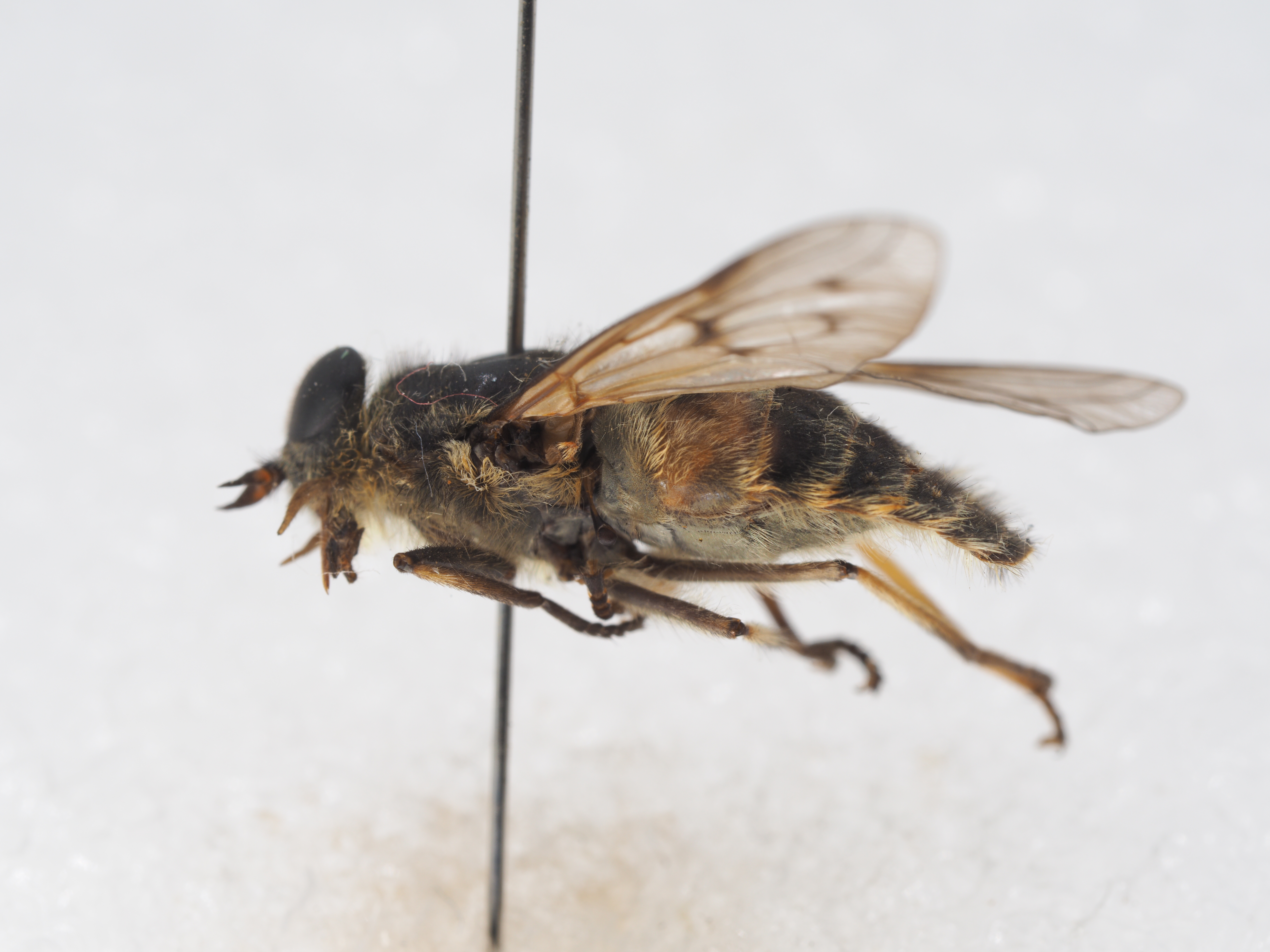 胸部,盾片、小盾片黑色,着生稀疏疏的淡黄色及黑毛,侧片丛生黑毛及浅白毛,翅横脉处有黒斑。平衡棒头部色深。足黒色,前胫基部玆黄色,中、后胫节基部拍黄色,末端黒色。