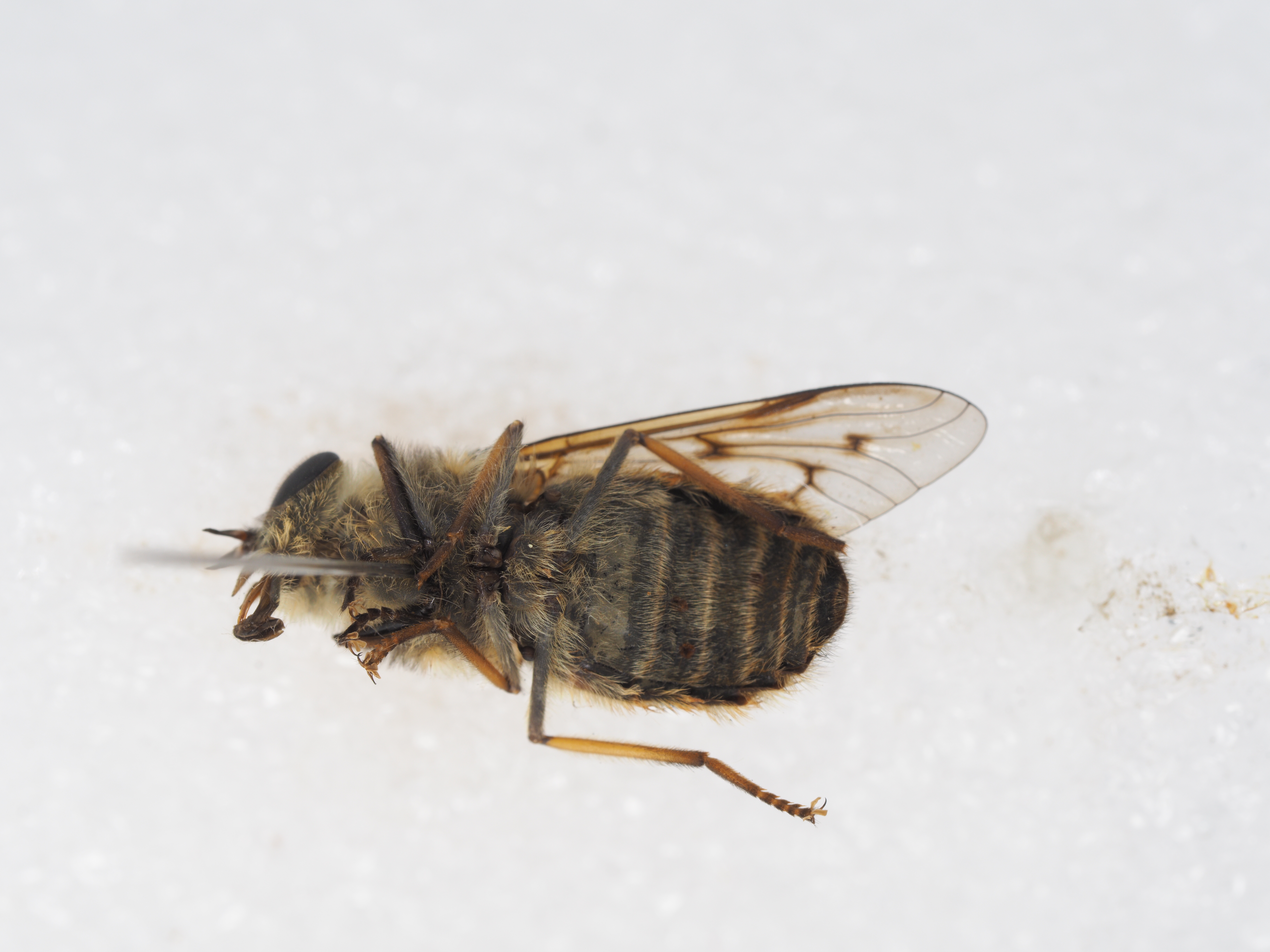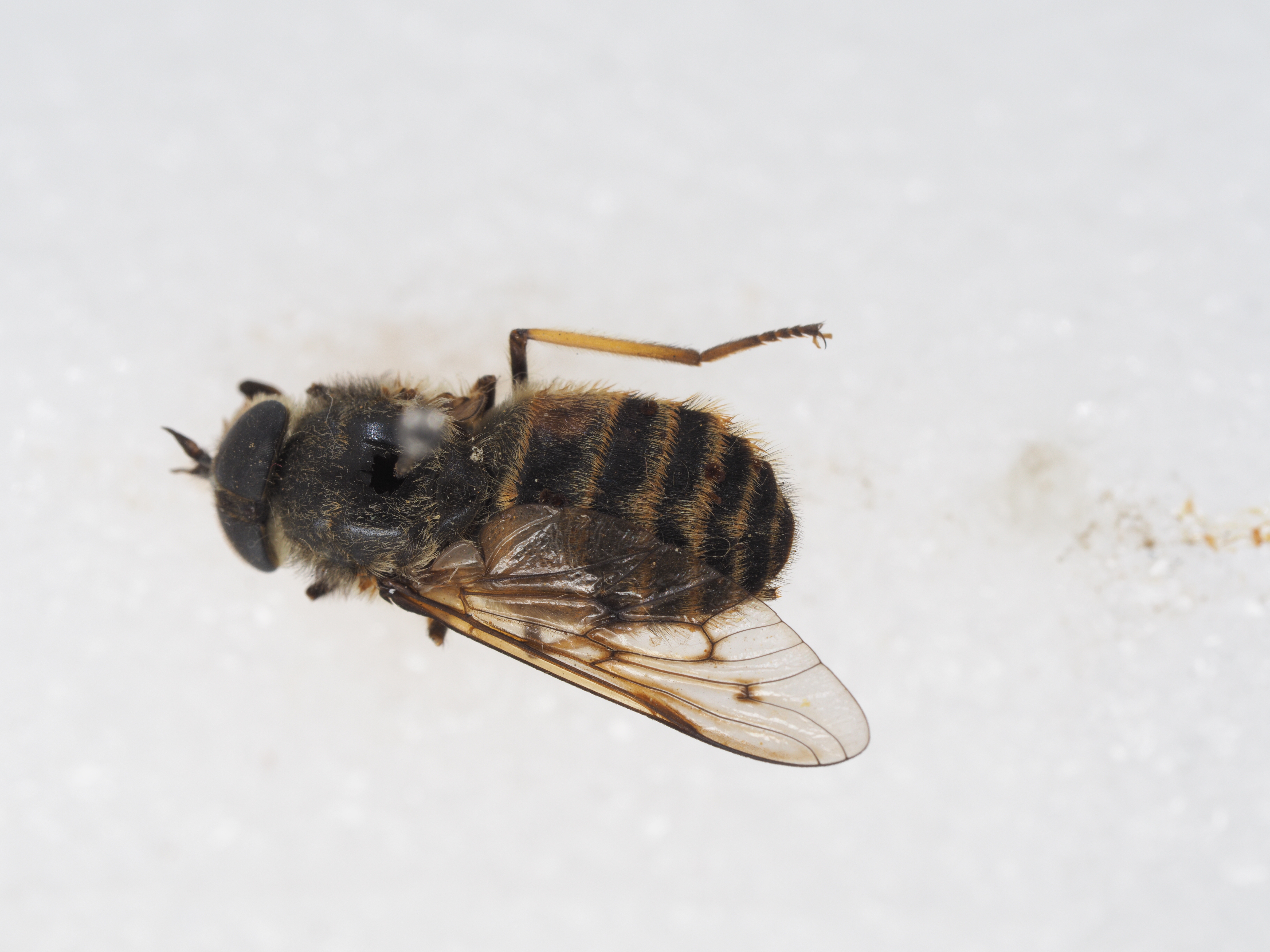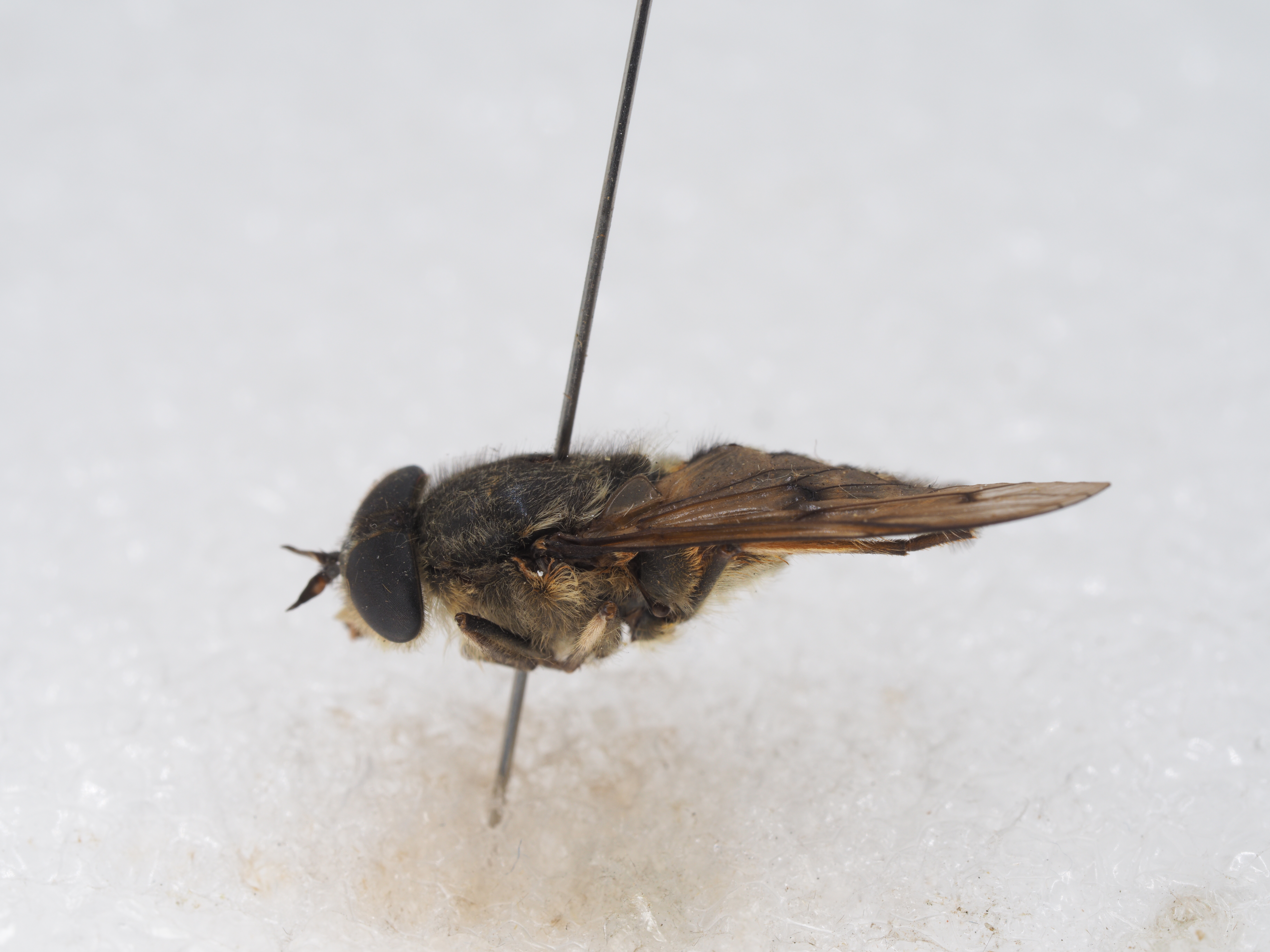 胸部,盾片、小盾片黑色,着生稀疏疏的淡黄色及黑毛,侧片丛生黑毛及浅白毛,翅横脉处有黒斑。平衡棒头部色深。足黒色,前胫基部玆黄色,中、后胫节基部拍黄色,末端黒色。