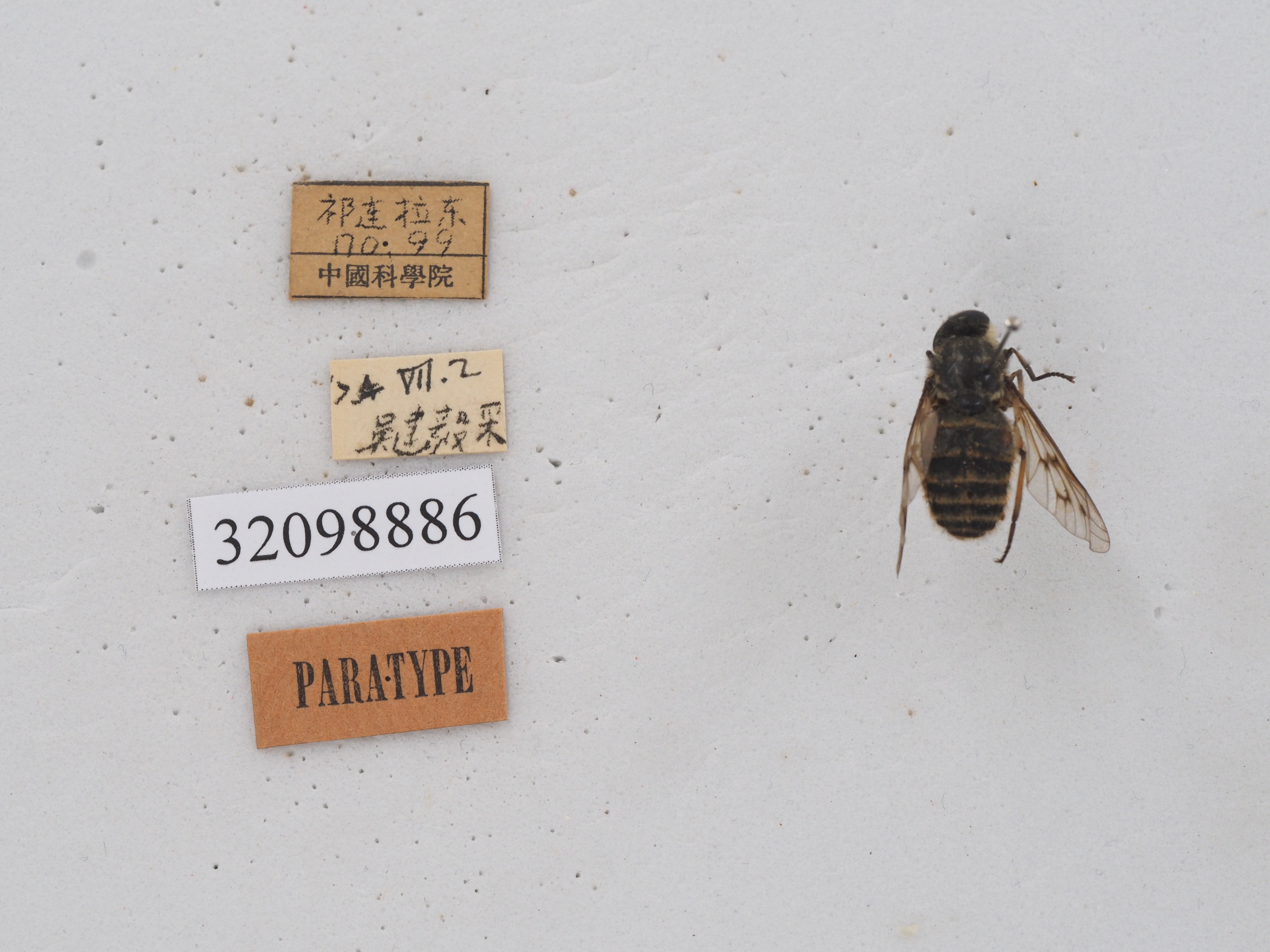 描述:雌虫体长14-15毫米。头部:前额黑色,复灰黑色粉被,具少量黑毛,两侧大致平行,高度为基部宽度的3倍,额板半圆形,与眼及额下板接触。中额板线形不显著,与额板分离。额下板及颊黑色,复灰粉被。颊上部具黒毛,下部及磨具淡黄色毛。单眼瘤明显。触角黑色,第1、2节具黑色长毛,第3节第1环节背缘有不明显的钝突,基部橙色,第1环节长度约其余几个环节总长的1.6倍。下颚须灰黑色,具黑毛及少量淡黄色毛。长度为最宽处宽的4倍。