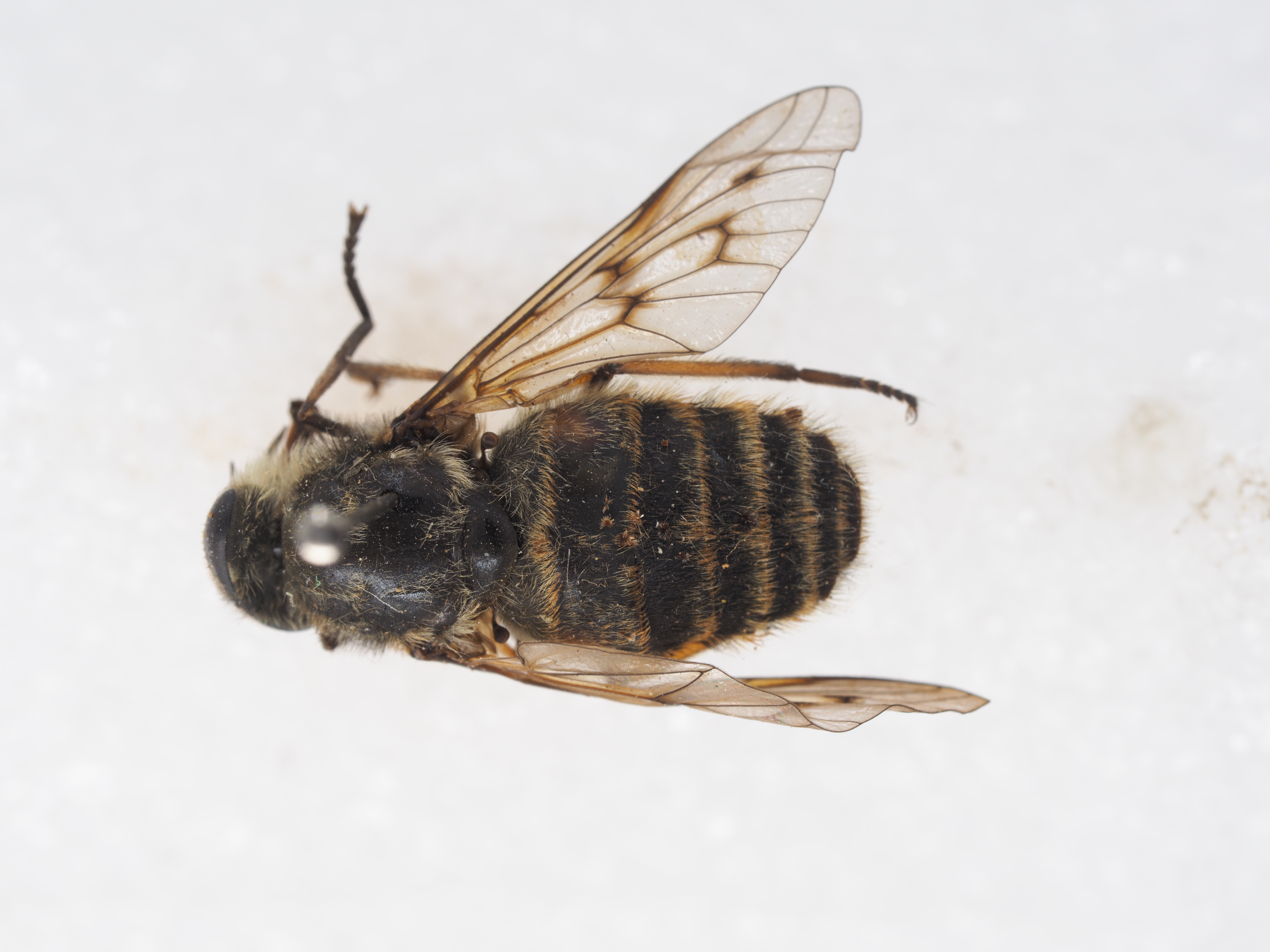 腹部:背板黑色,着生黑毛及淡黄色毛,I一V节后缘具淡黄色毛形成带,II节两侧具橙色斑,背板边缘丛生淡黄色毛。腹板黑色,复黄色粉被,每节末端具浅白毛。有的付模腹板粉被不明显。
