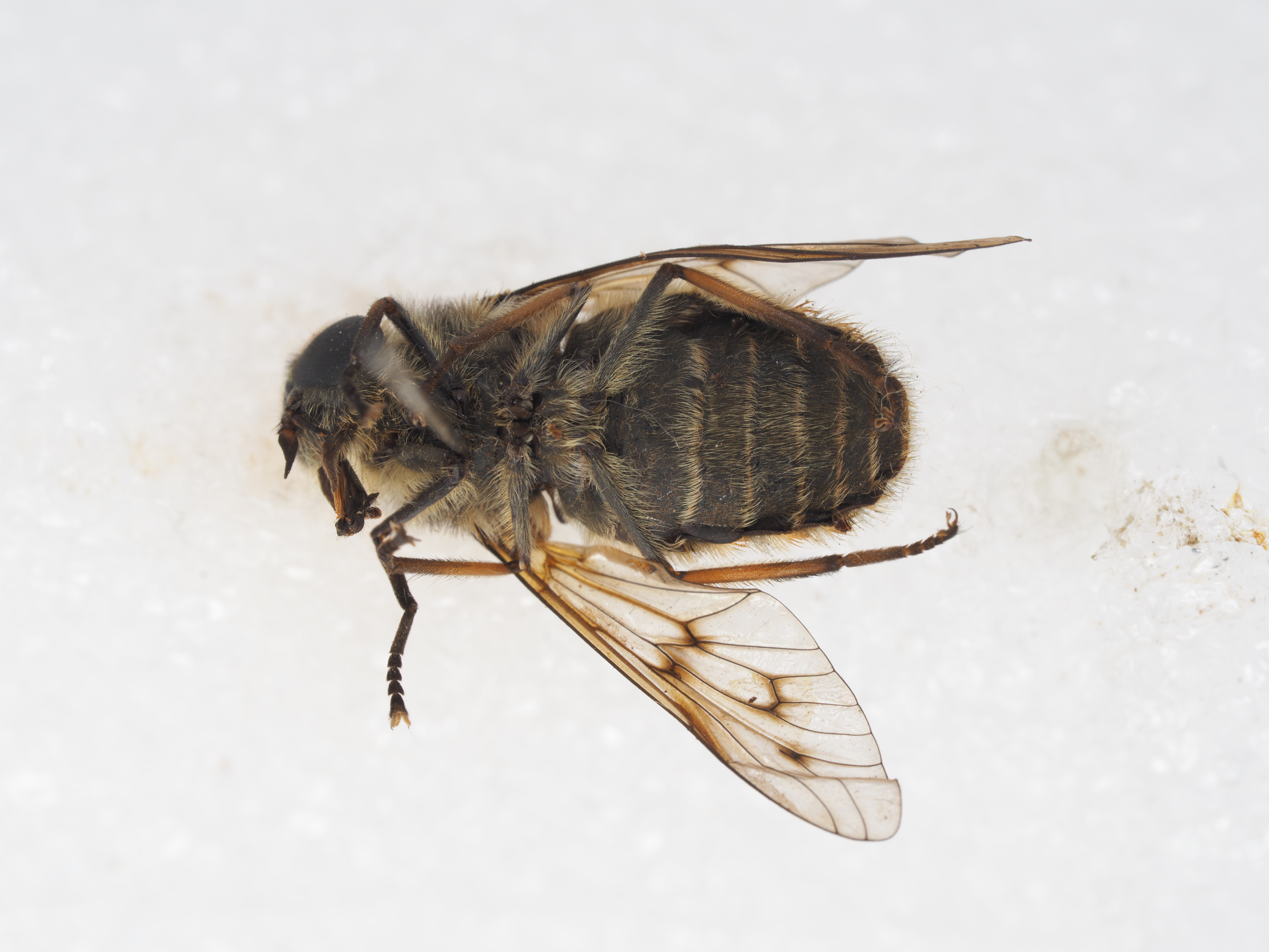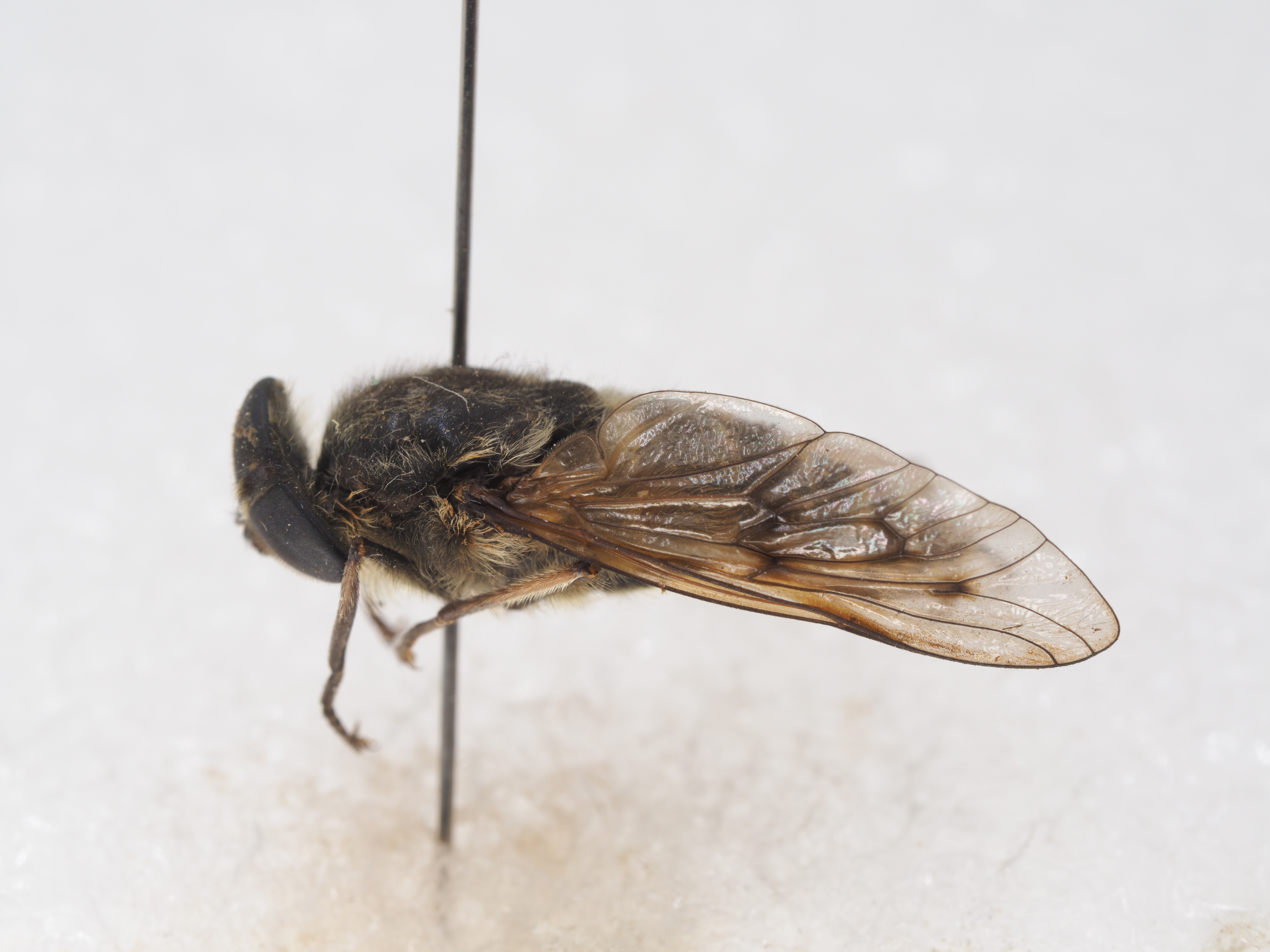 胸部,盾片、小盾片黑色,着生稀疏疏的淡黄色及黑毛,侧片丛生黑毛及浅白毛,翅横脉处有黒斑。平衡棒头部色深。足黒色,前胫基部玆黄色,中、后胫节基部拍黄色,末端黒色。