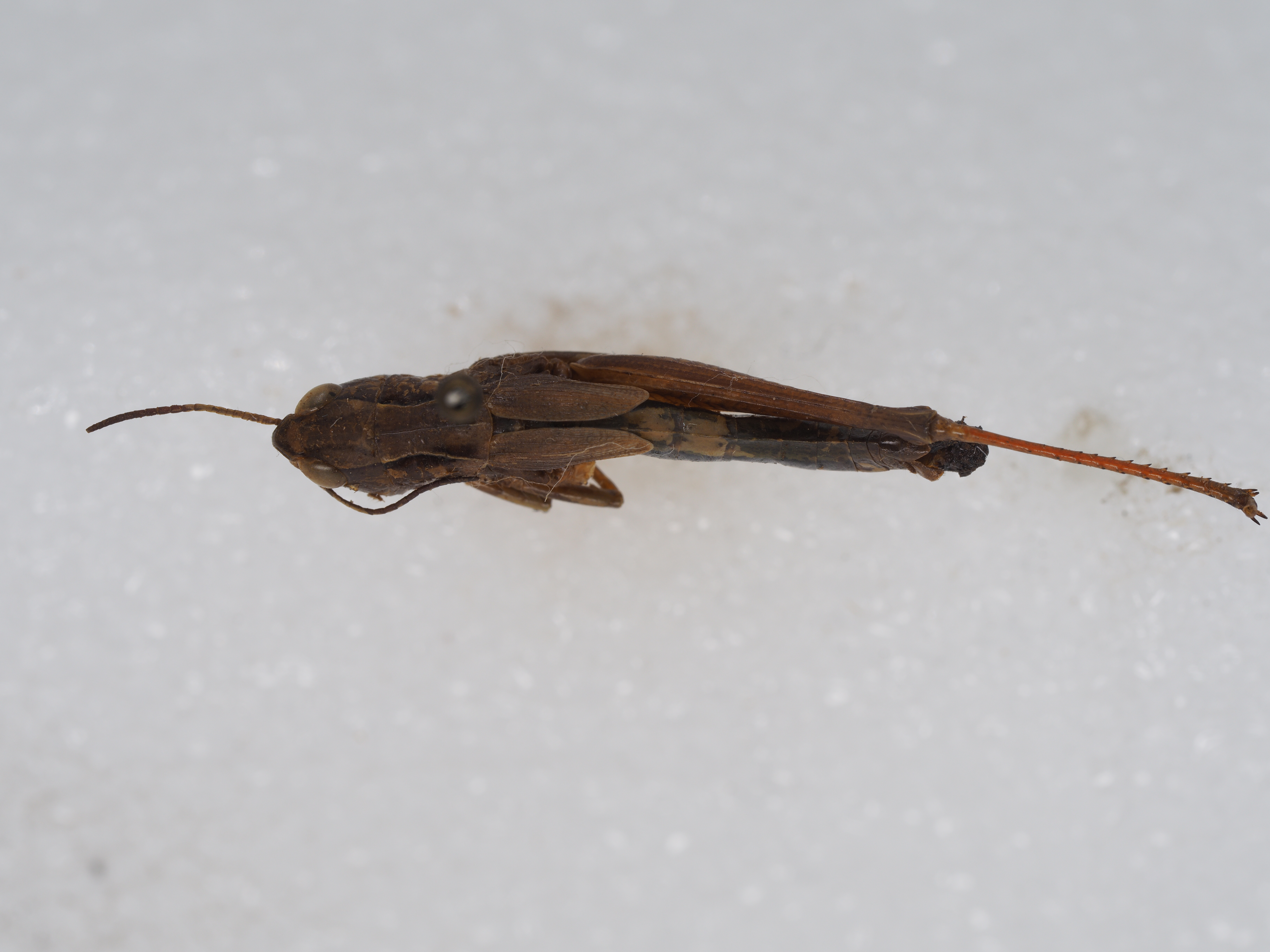 雌性 体较雄粗壮。触角到达或略超过前胸背板后缘。头侧窝长为宽的3.8倍。颜面隆起平坦,缺纵沟。复眼较小,略长于眼下沟。头顶前缘呈钝角形。前翅甚短,到达或略不到达第3腹节背板后缘;两前翅在基部背面稍分离;前翅长为宽的2倍;缘前脉域较宽,具闰脉,前缘脉域、中脉域及肘脉域也具闰脉。下生殖板后缘中央三角形突出。产卵瓣粗短,端部呈钩状。