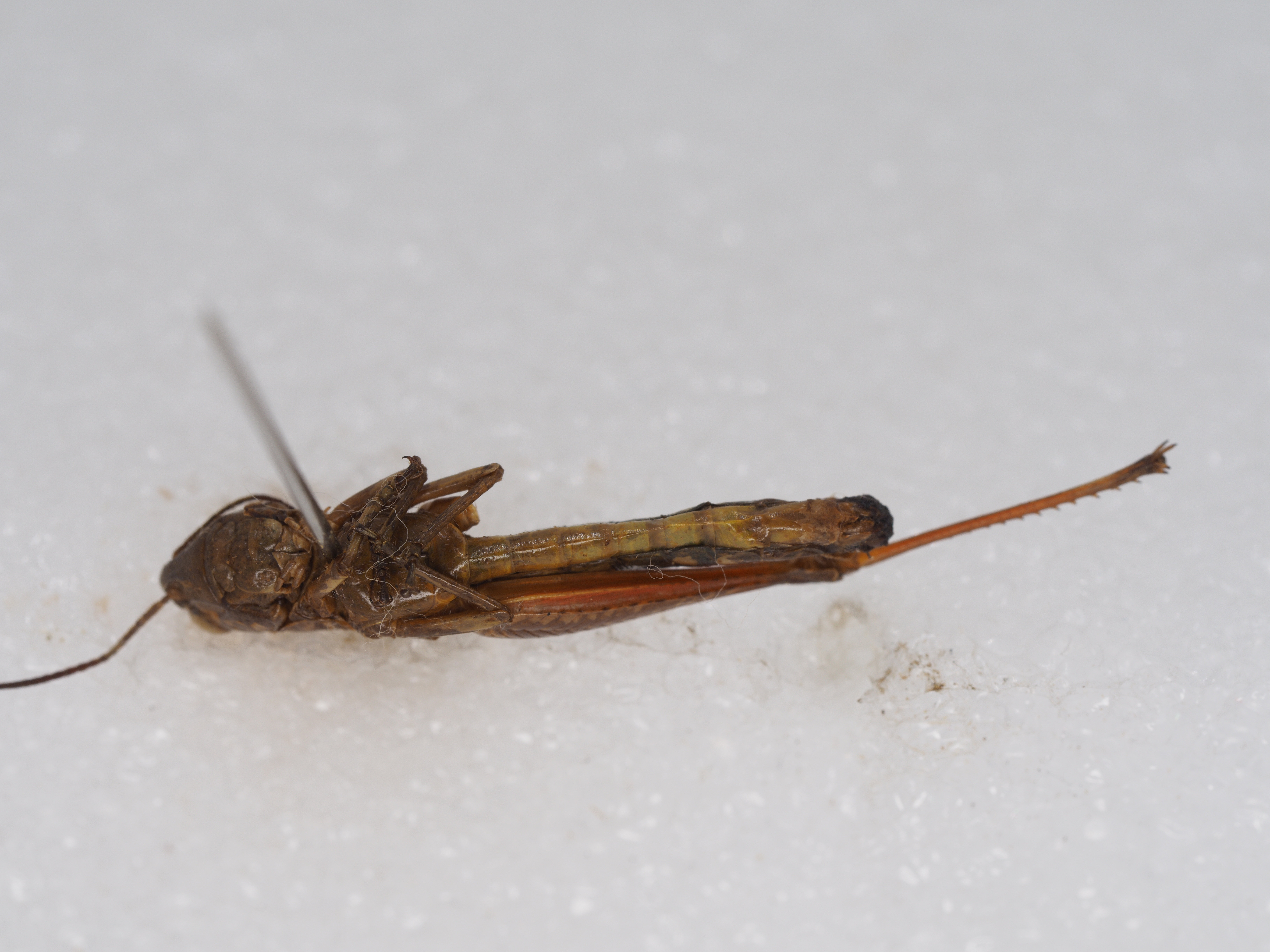 体色 棕褐色、绿褐色。前胸背板侧隆线两侧深褐色,眼后带不明显。后股节内、外侧土黄色,下侧橘红色,端部浅褐色。后足胫节和跗节橘红色。雄性下生殖板浅橘红色。