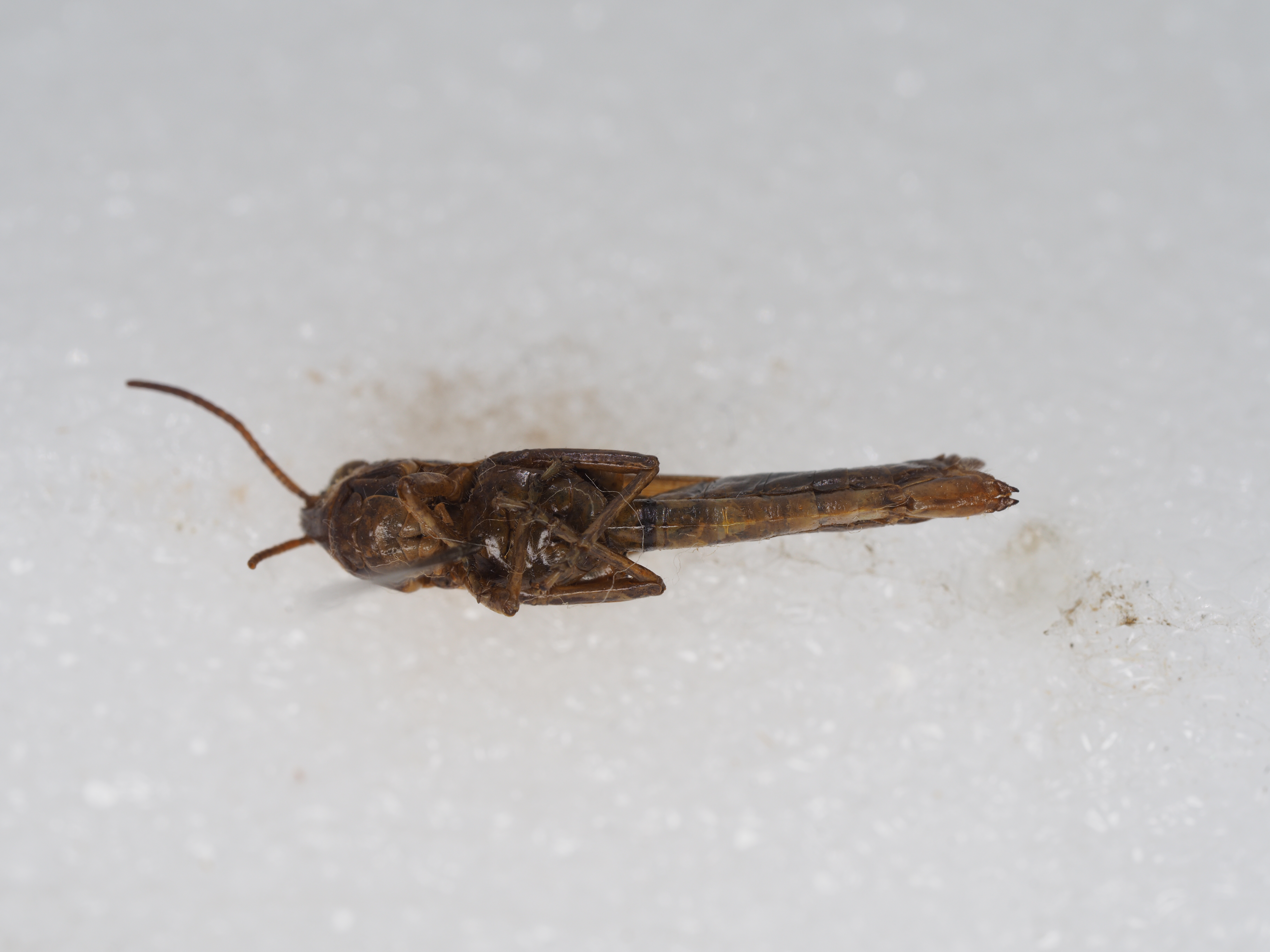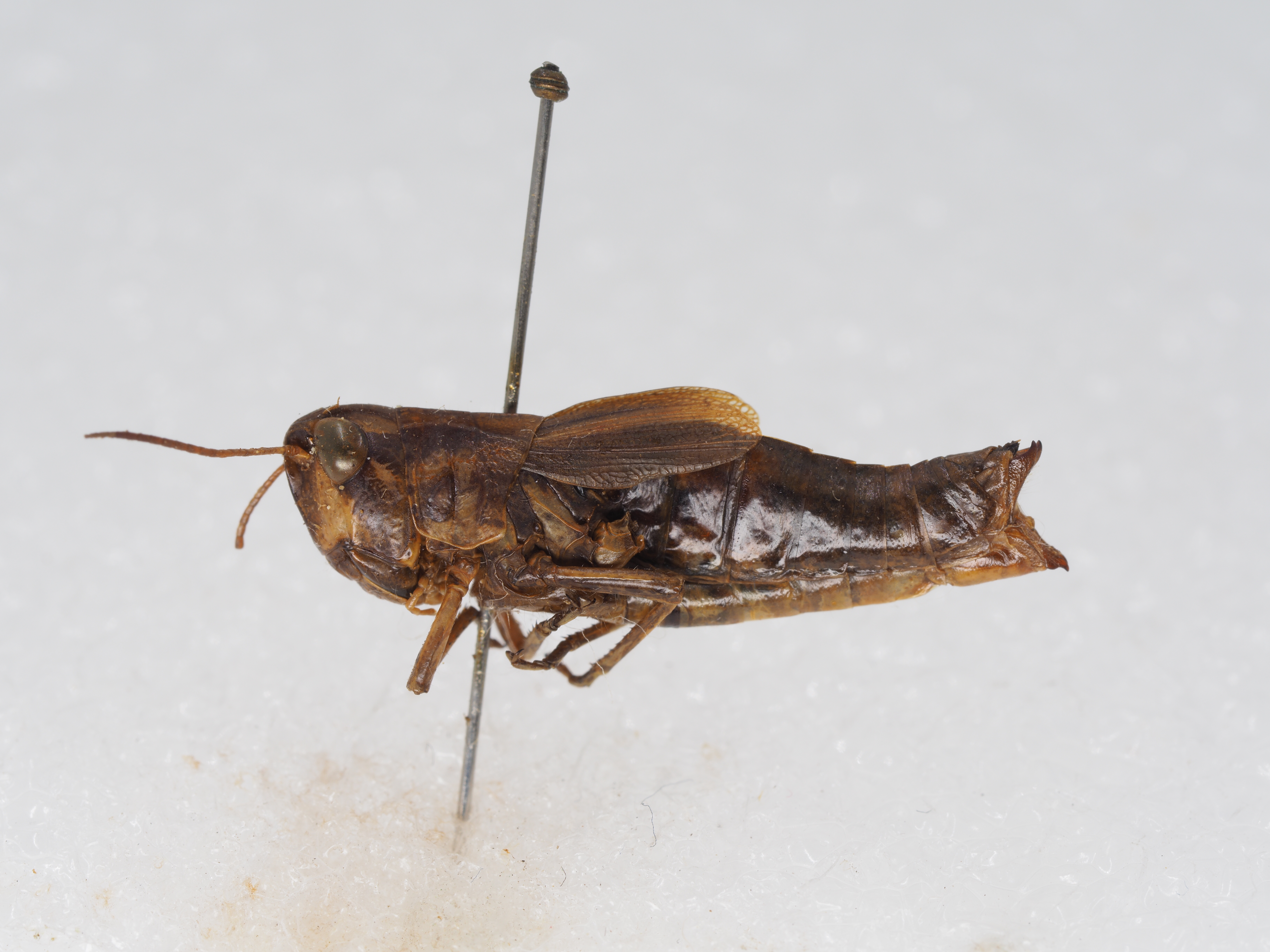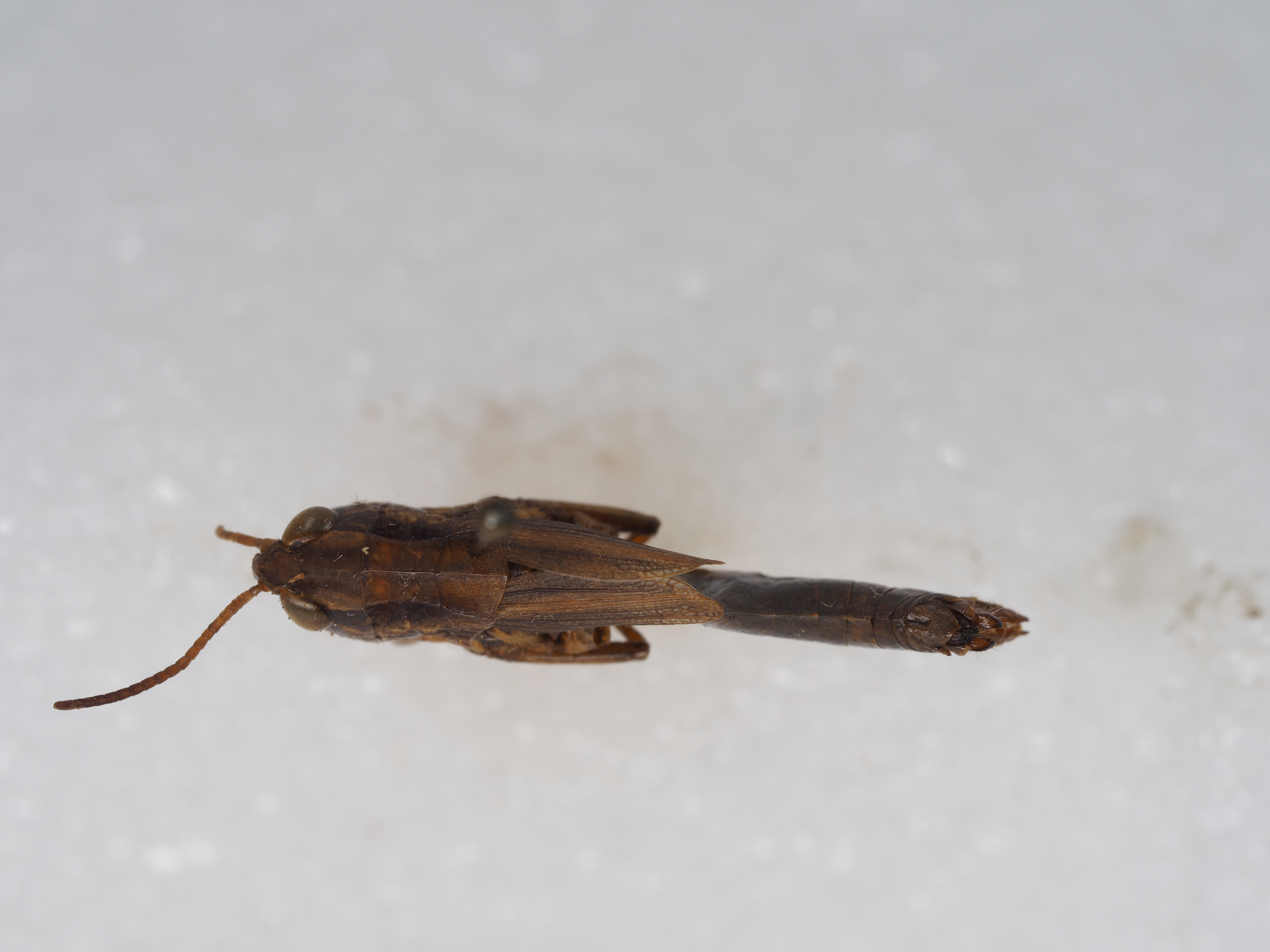 雌性 体较雄粗壮。触角到达或略超过前胸背板后缘。头侧窝长为宽的3.8倍。颜面隆起平坦,缺纵沟。复眼较小,略长于眼下沟。头顶前缘呈钝角形。前翅甚短,到达或略不到达第3腹节背板后缘;两前翅在基部背面稍分离;前翅长为宽的2倍;缘前脉域较宽,具闰脉,前缘脉域、中脉域及肘脉域也具闰脉。下生殖板后缘中央三角形突出。产卵瓣粗短,端部呈钩状。