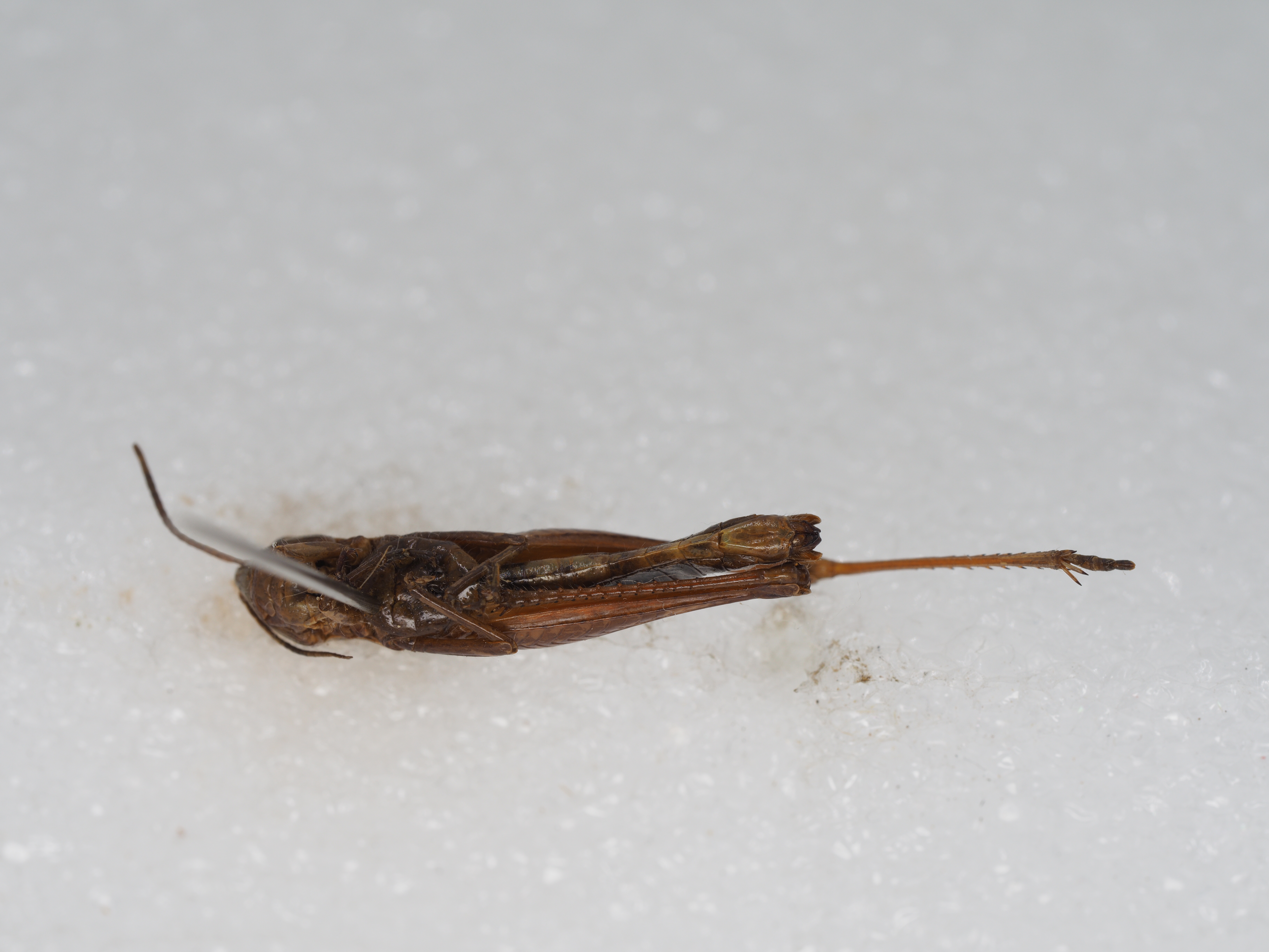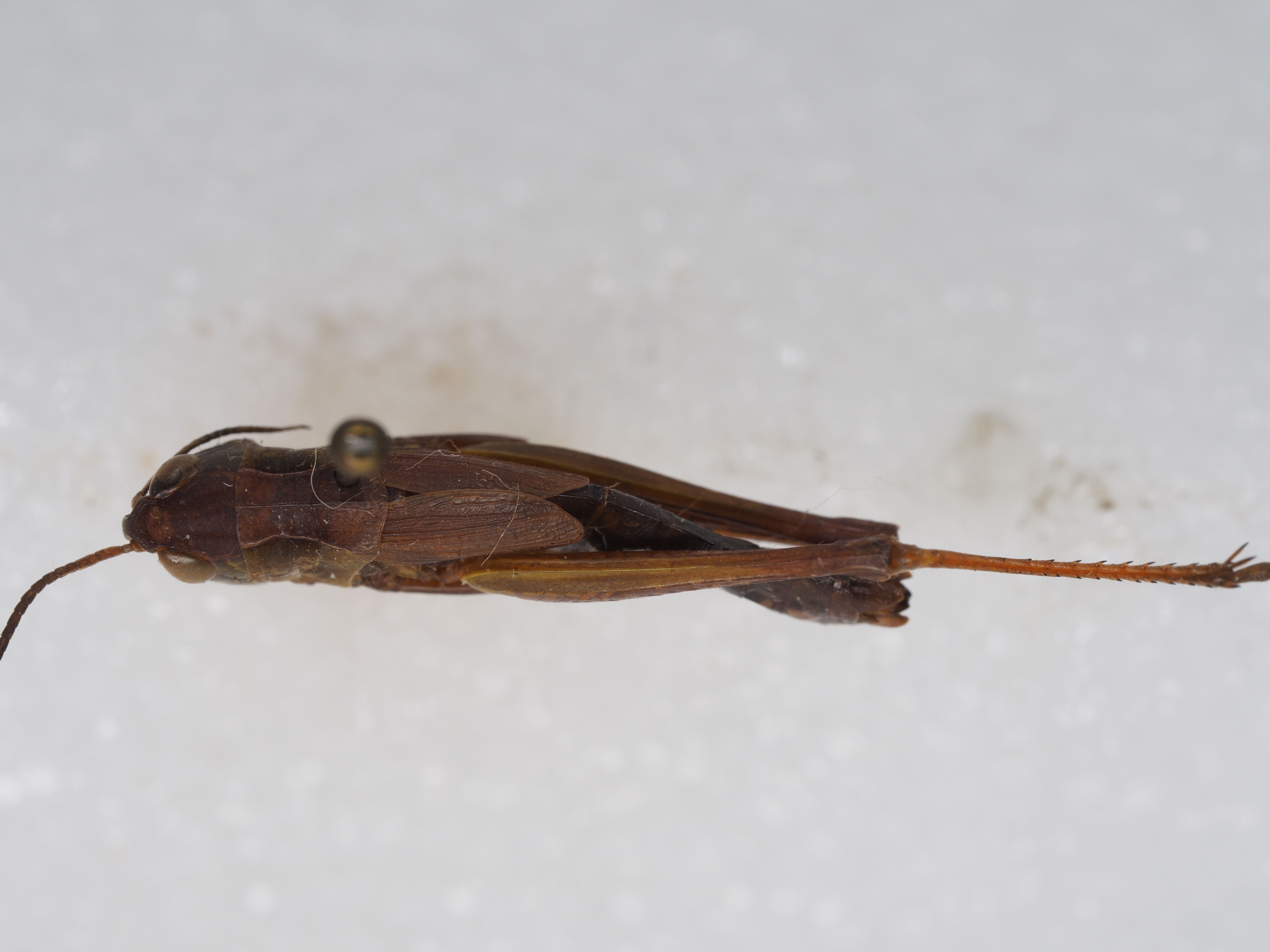 体色 棕褐色、绿褐色。前胸背板侧隆线两侧深褐色,眼后带不明显。后股节内、外侧土黄色,下侧橘红色,端部浅褐色。后足胫节和跗节橘红色。雄性下生殖板浅橘红色。