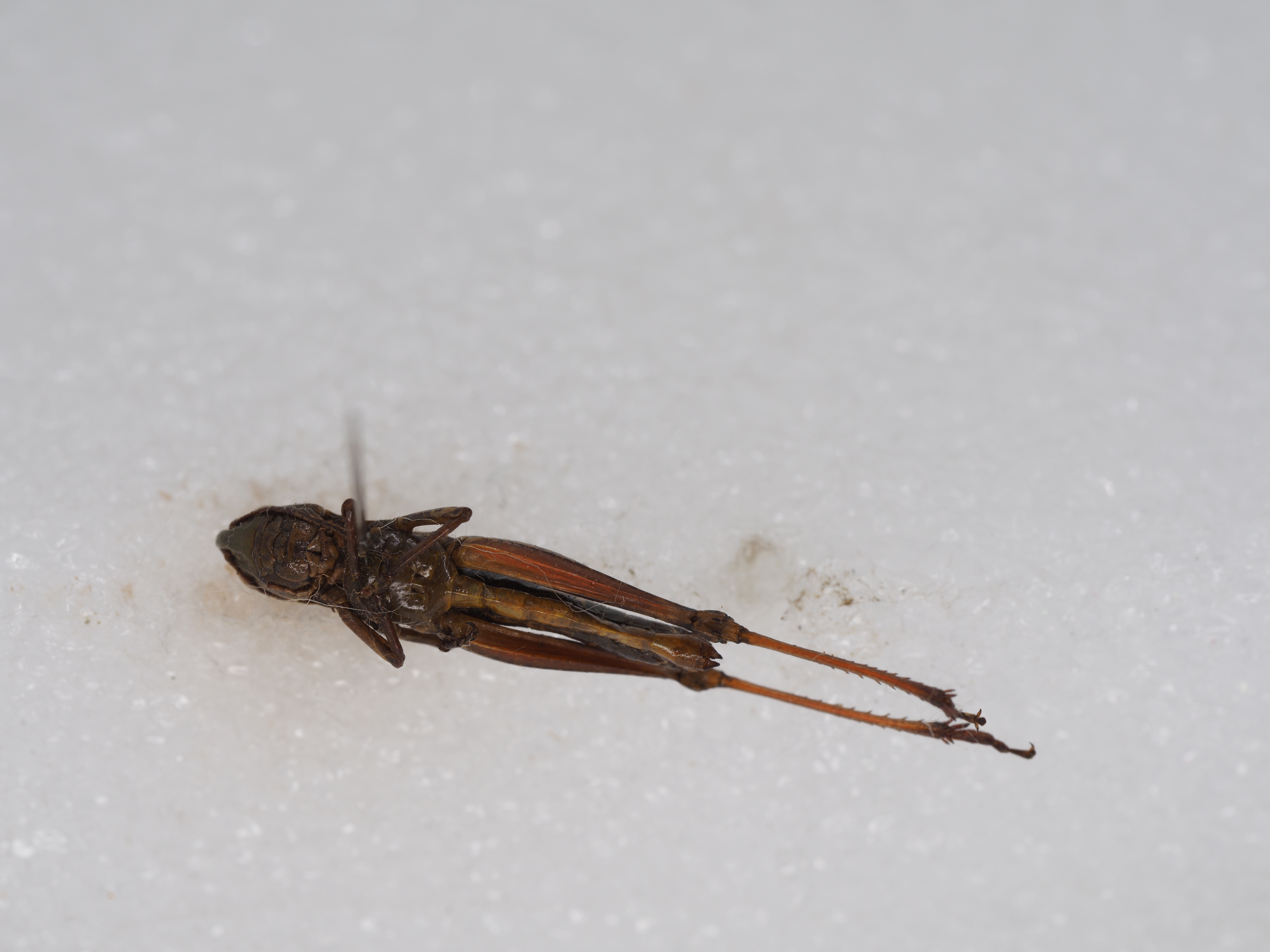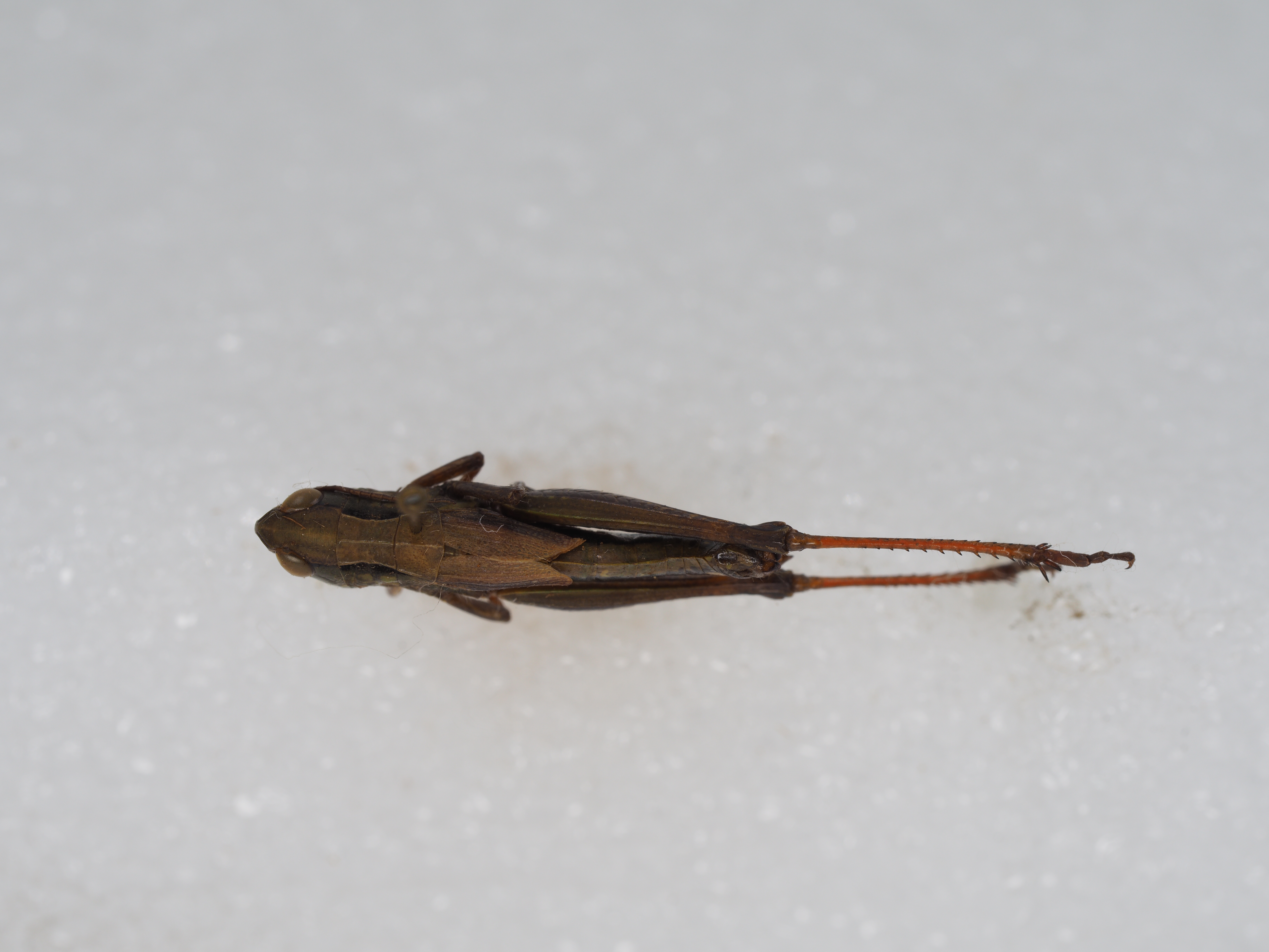 体色 棕褐色、绿褐色。前胸背板侧隆线两侧深褐色,眼后带不明显。后股节内、外侧土黄色,下侧橘红色,端部浅褐色。后足胫节和跗节橘红色。雄性下生殖板浅橘红色。