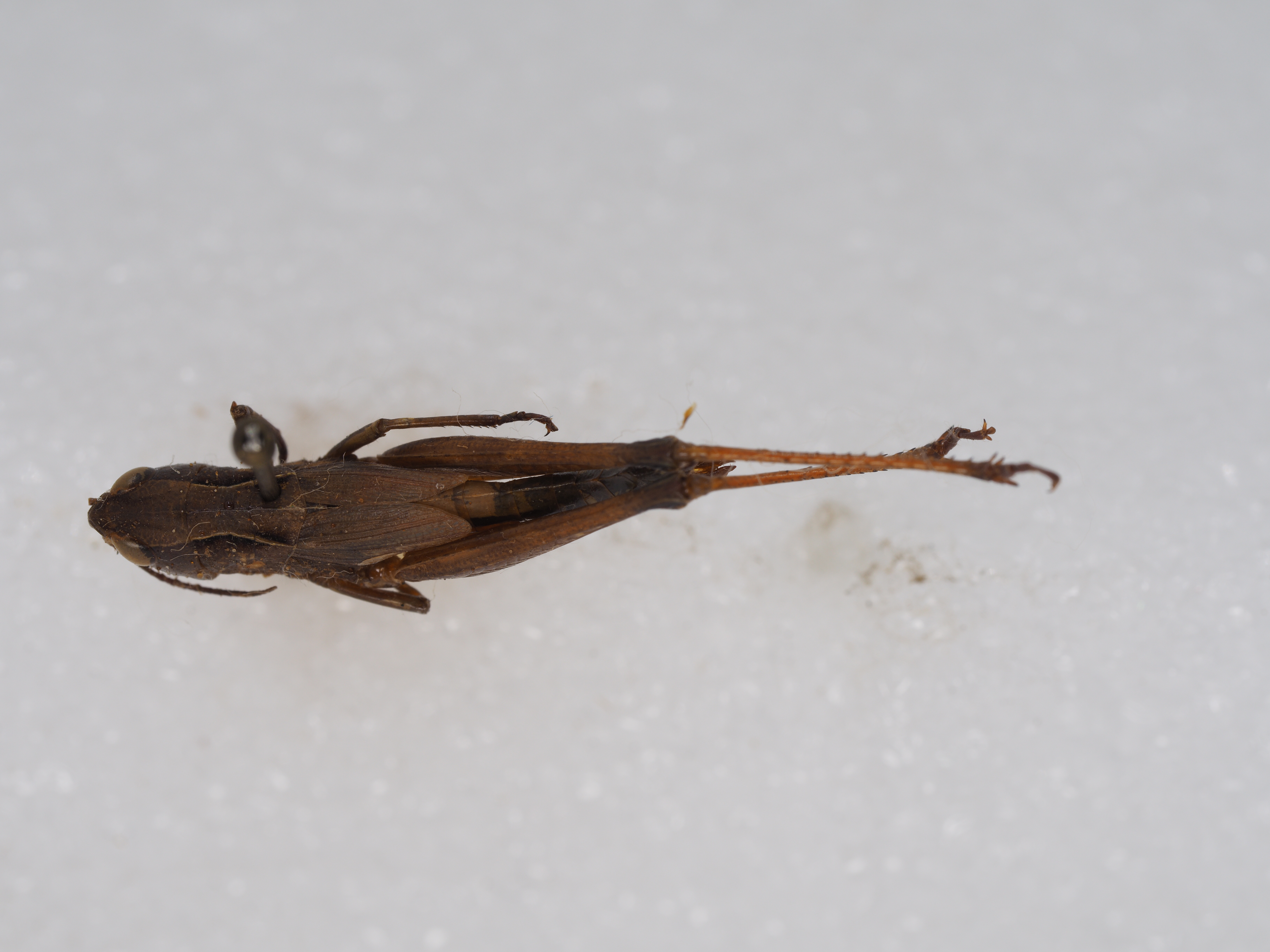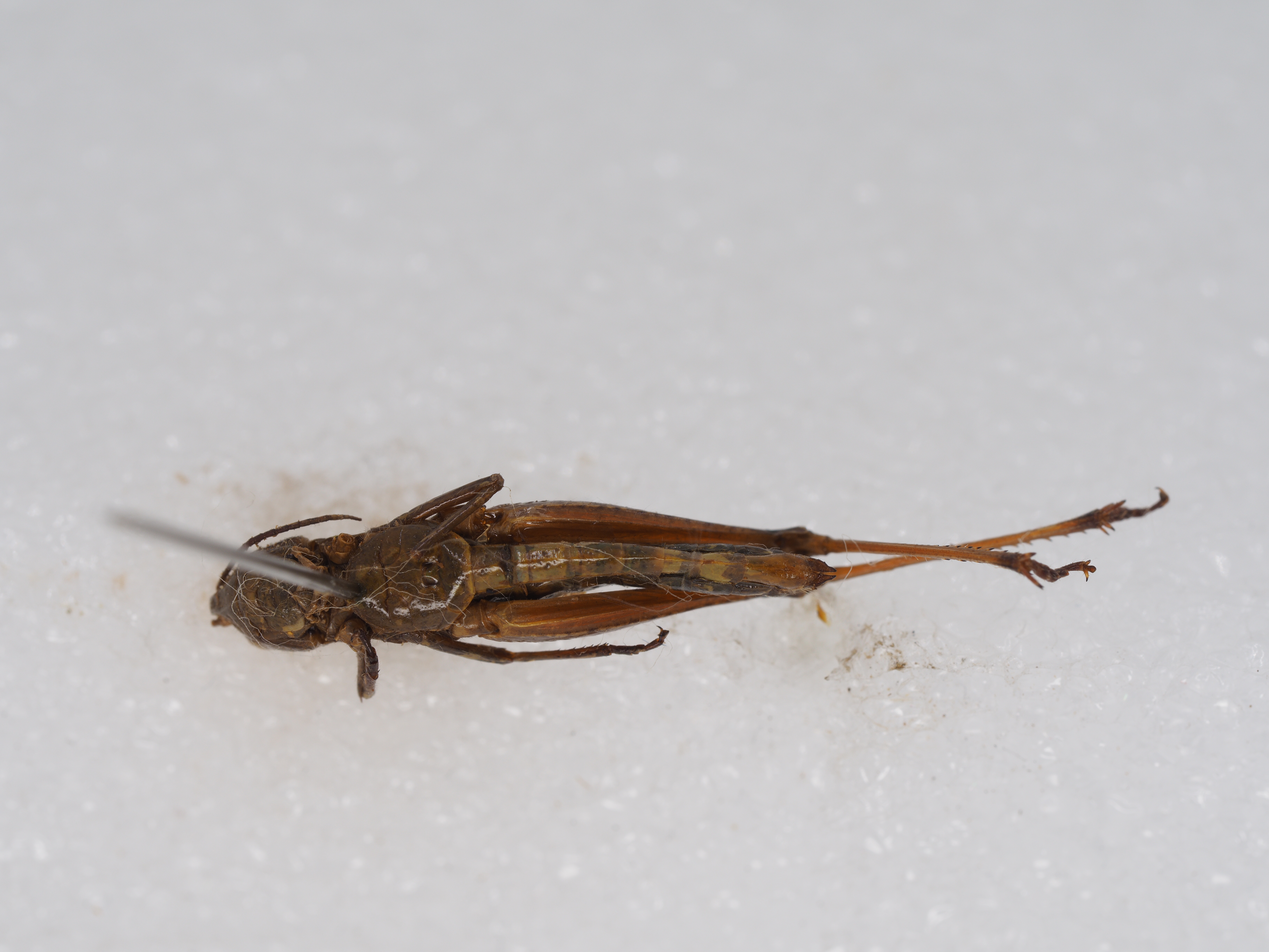 体色 棕褐色、绿褐色。前胸背板侧隆线两侧深褐色,眼后带不明显。后股节内、外侧土黄色,下侧橘红色,端部浅褐色。后足胫节和跗节橘红色。雄性下生殖板浅橘红色。