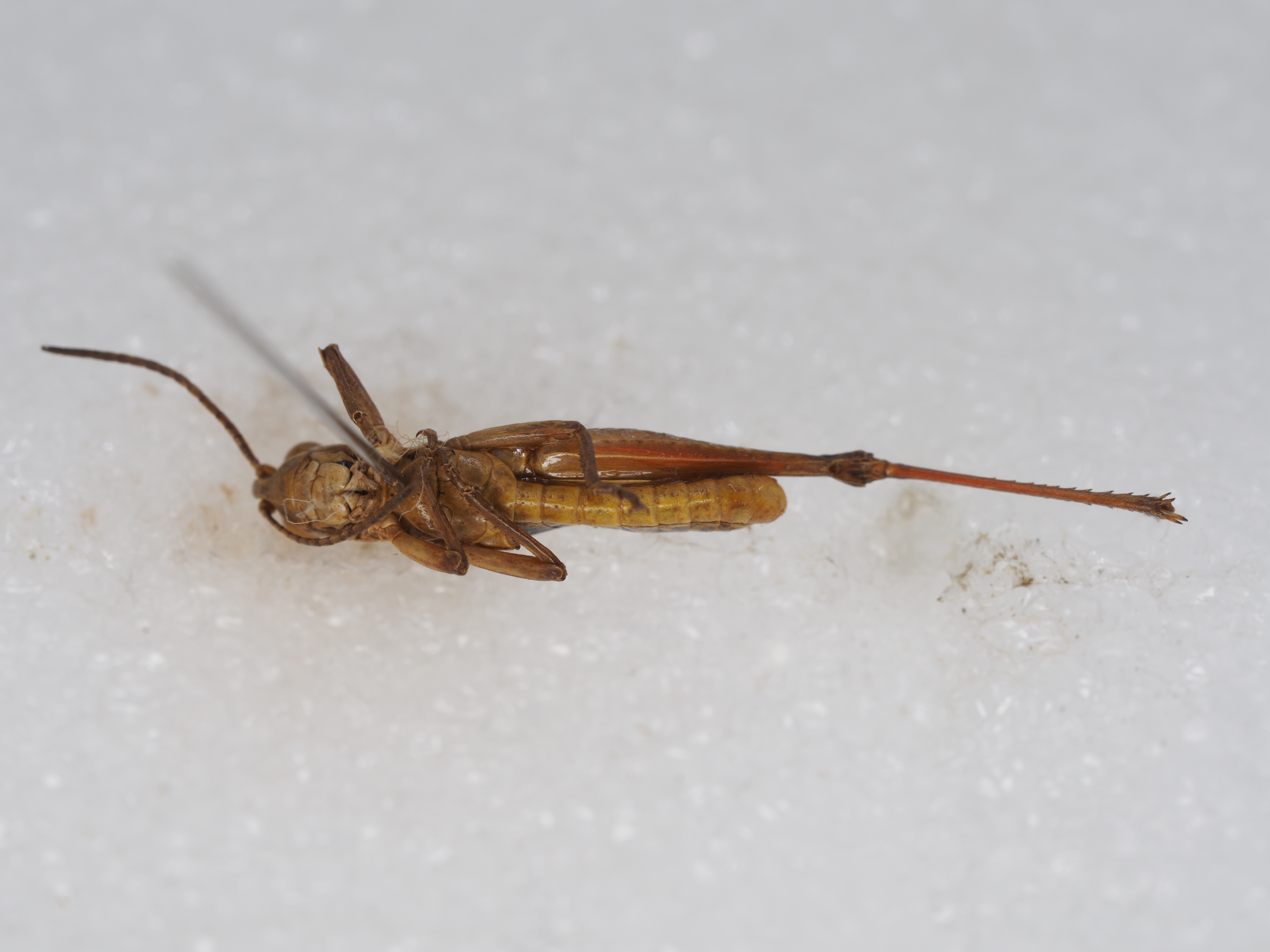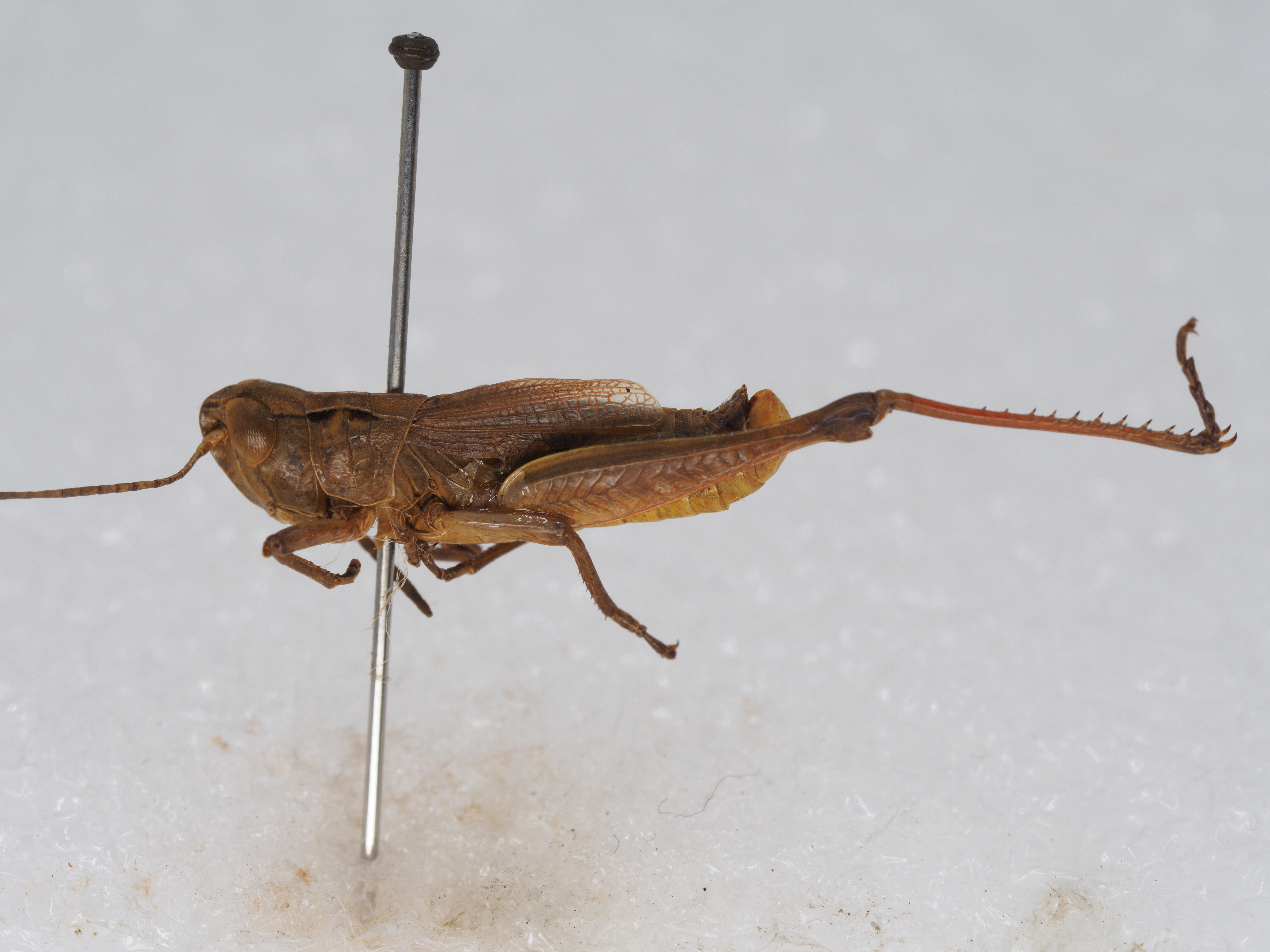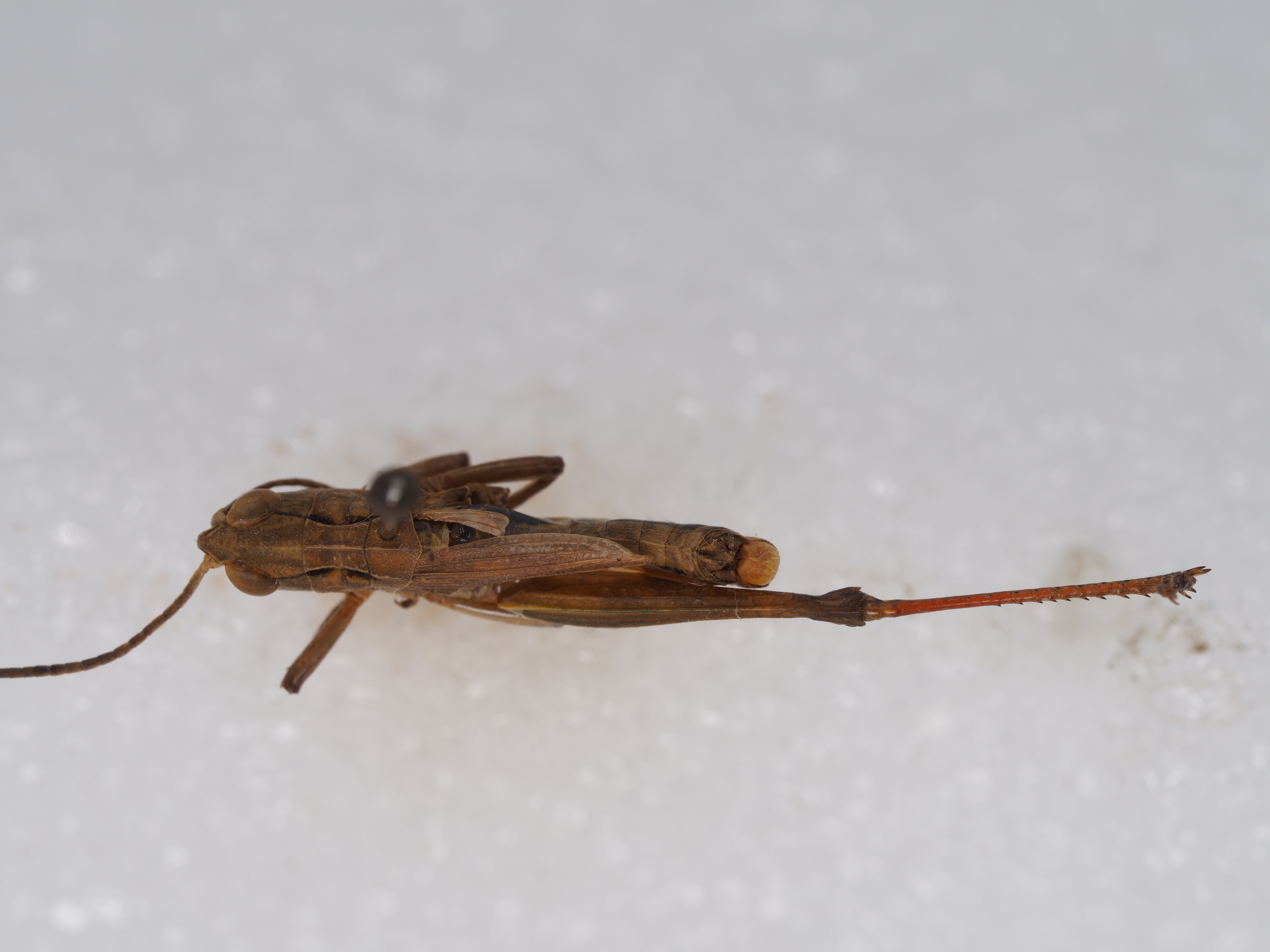 体色 棕褐色、绿褐色。前胸背板侧隆线两侧深褐色,眼后带不明显。后股节内、外侧土黄色,下侧橘红色,端部浅褐色。后足胫节和跗节橘红色。雄性下生殖板浅橘红色。