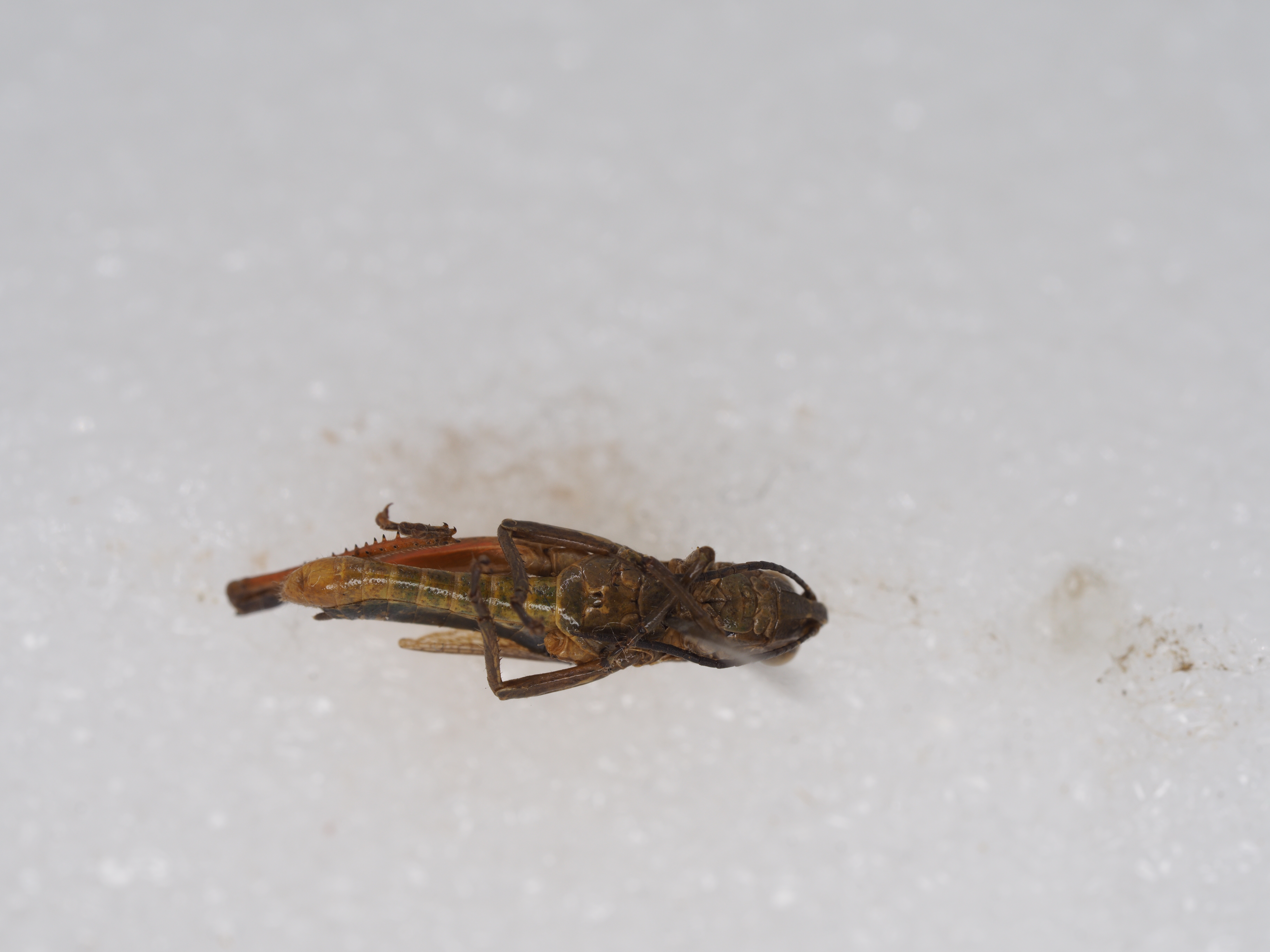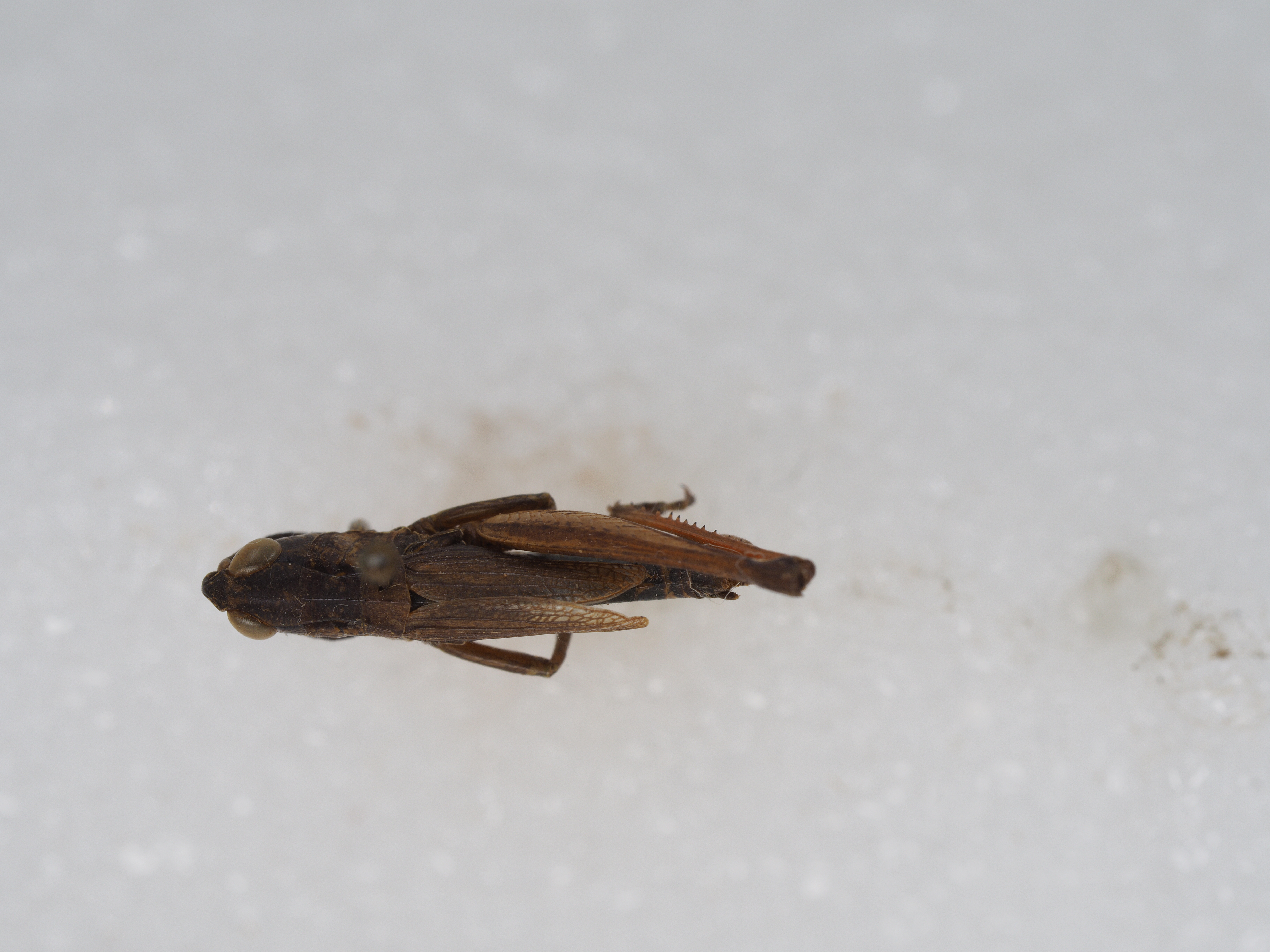 体色 棕褐色、绿褐色。前胸背板侧隆线两侧深褐色,眼后带不明显。后股节内、外侧土黄色,下侧橘红色,端部浅褐色。后足胫节和跗节橘红色。雄性下生殖板浅橘红色。