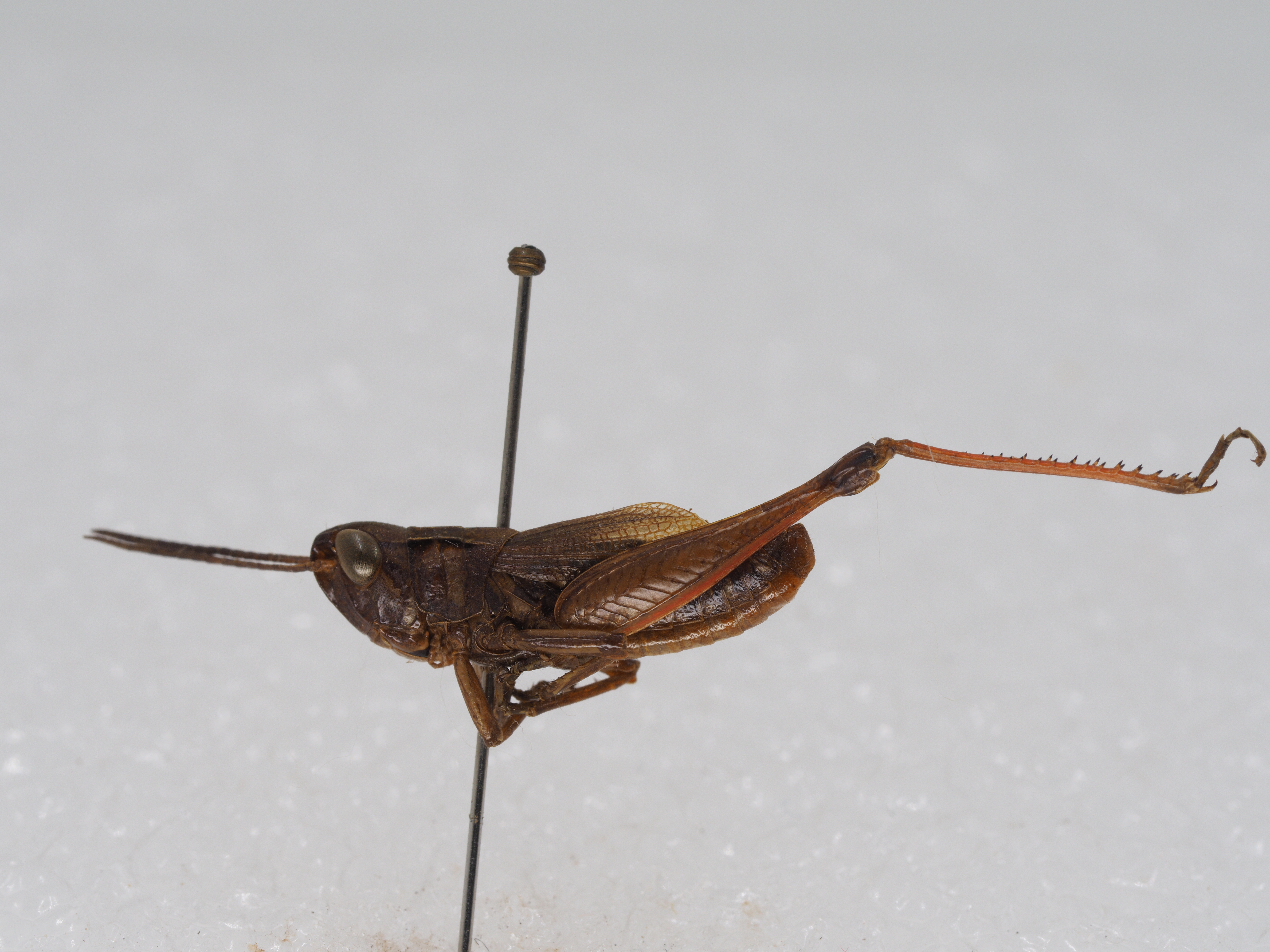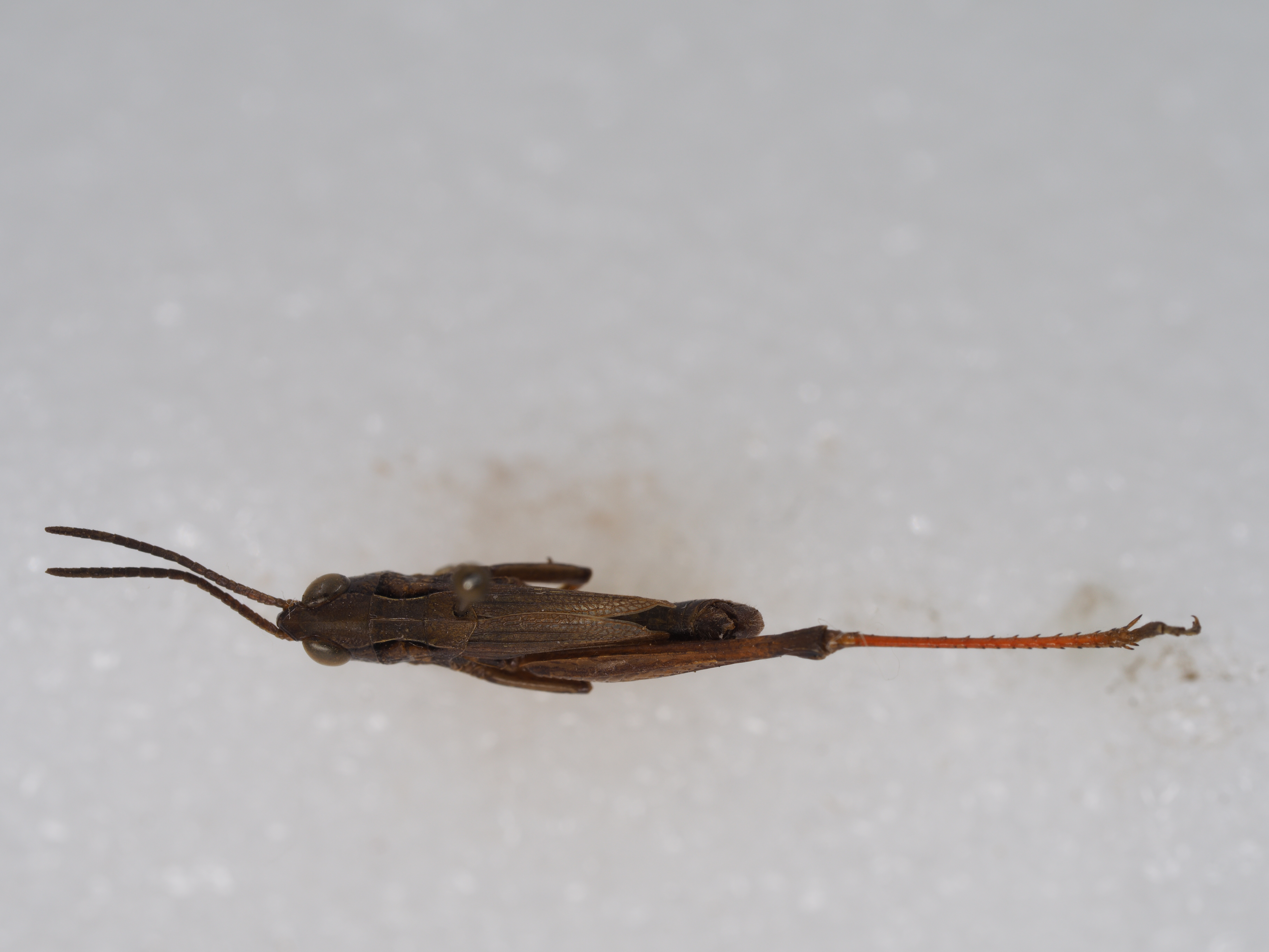 体色 棕褐色、绿褐色。前胸背板侧隆线两侧深褐色,眼后带不明显。后股节内、外侧土黄色,下侧橘红色,端部浅褐色。后足胫节和跗节橘红色。雄性下生殖板浅橘红色。