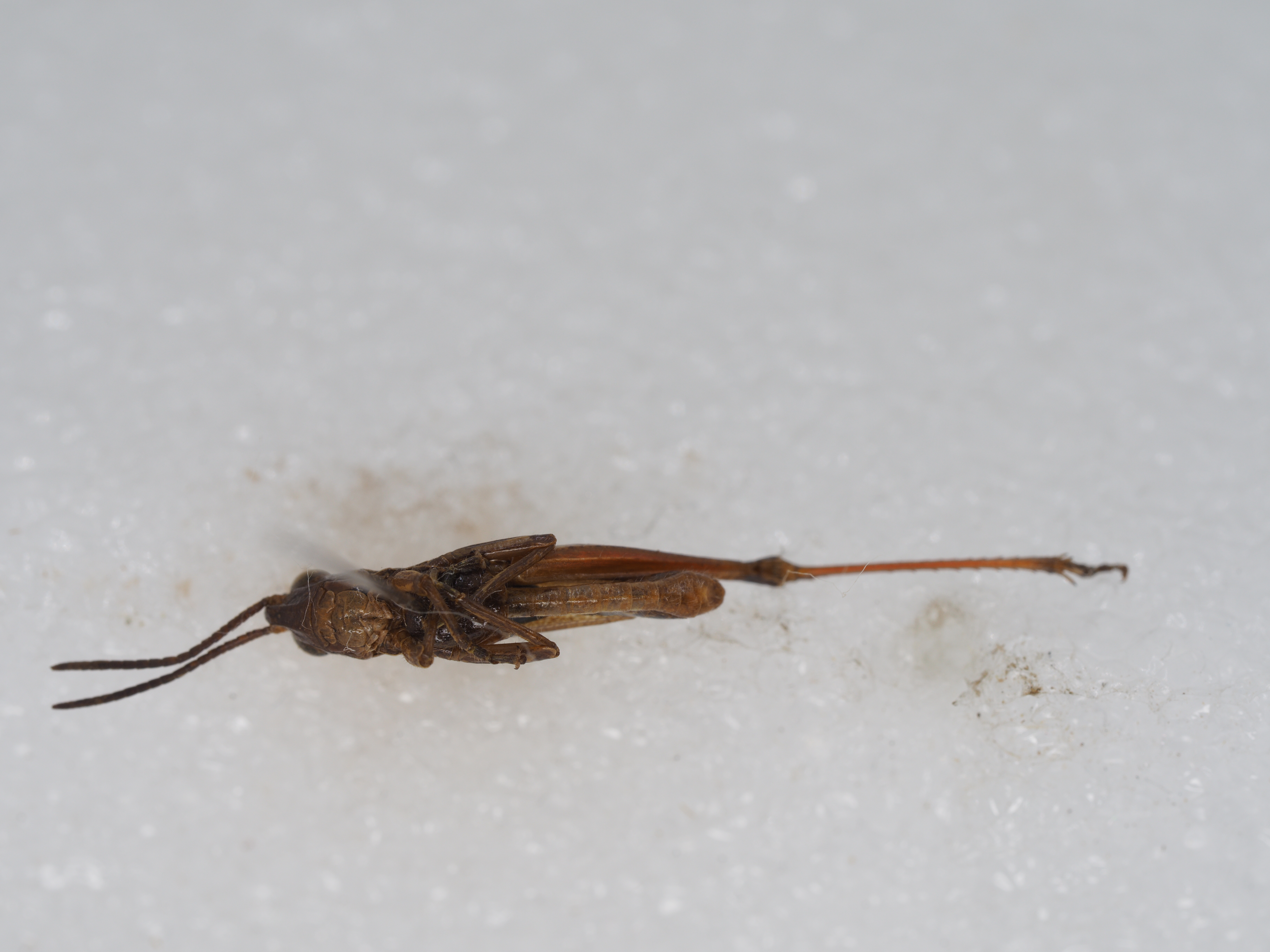 雌性 体较雄粗壮。触角到达或略超过前胸背板后缘。头侧窝长为宽的3.8倍。颜面隆起平坦,缺纵沟。复眼较小,略长于眼下沟。头顶前缘呈钝角形。前翅甚短,到达或略不到达第3腹节背板后缘;两前翅在基部背面稍分离;前翅长为宽的2倍;缘前脉域较宽,具闰脉,前缘脉域、中脉域及肘脉域也具闰脉。下生殖板后缘中央三角形突出。产卵瓣粗短,端部呈钩状。