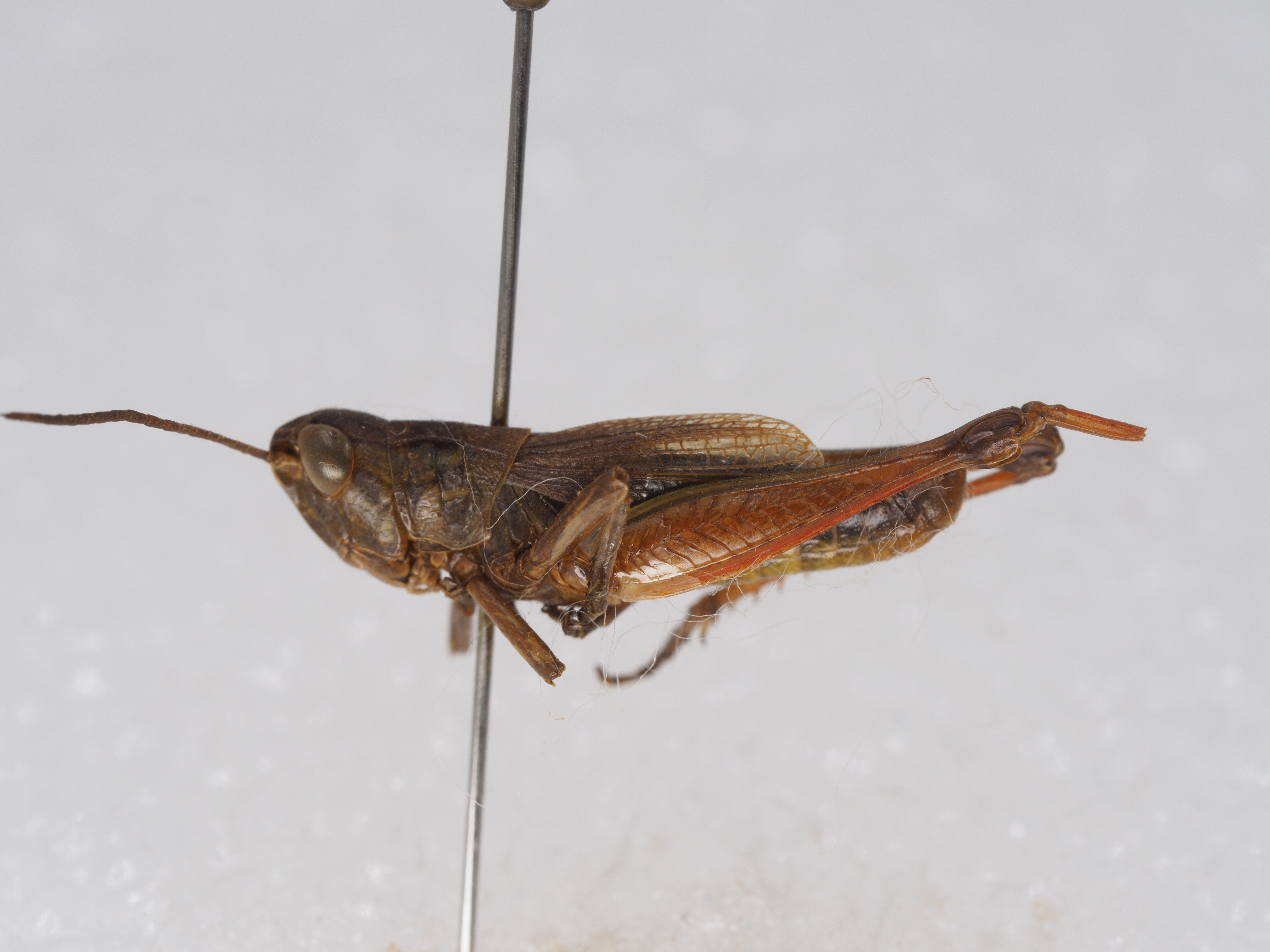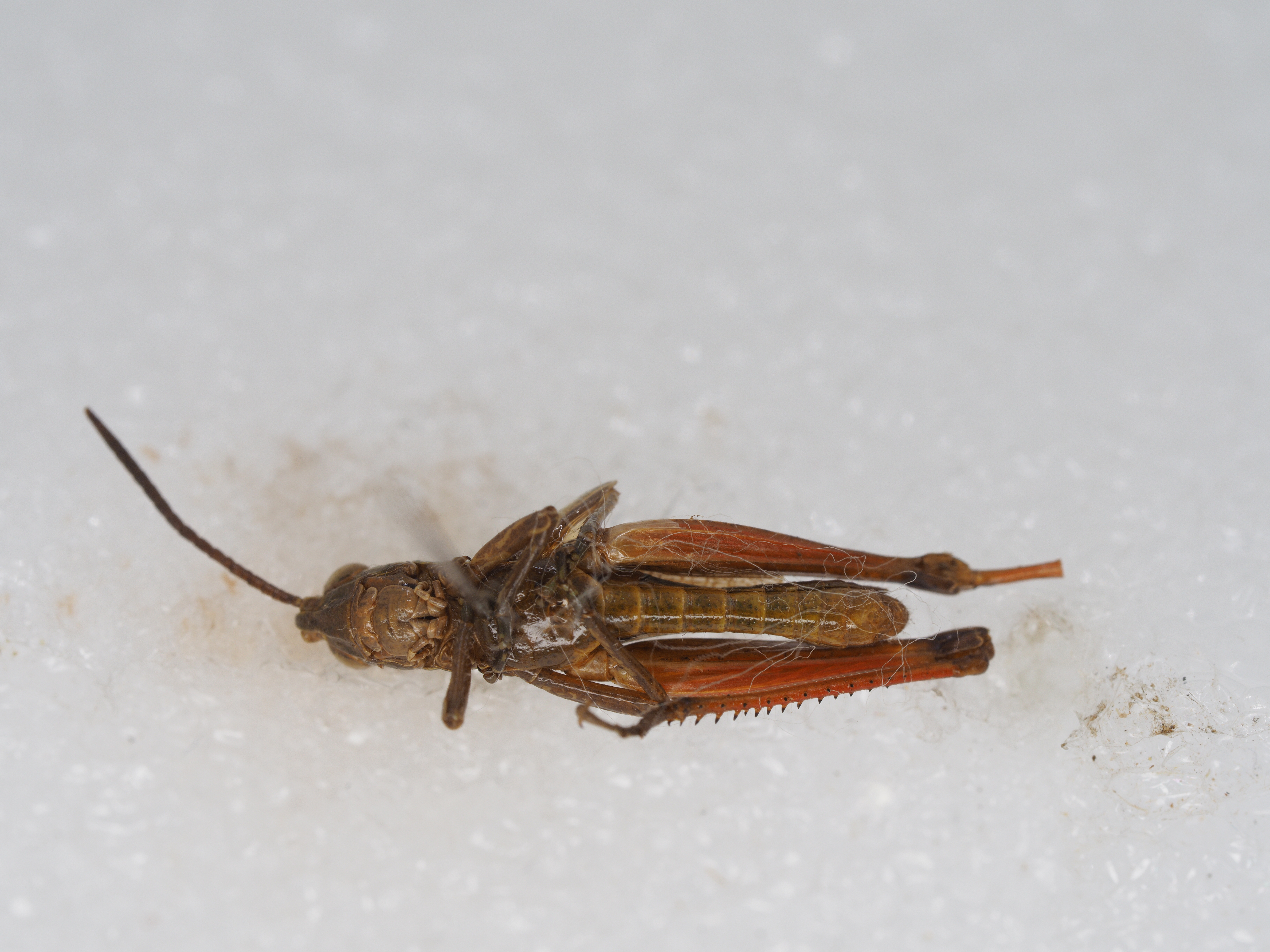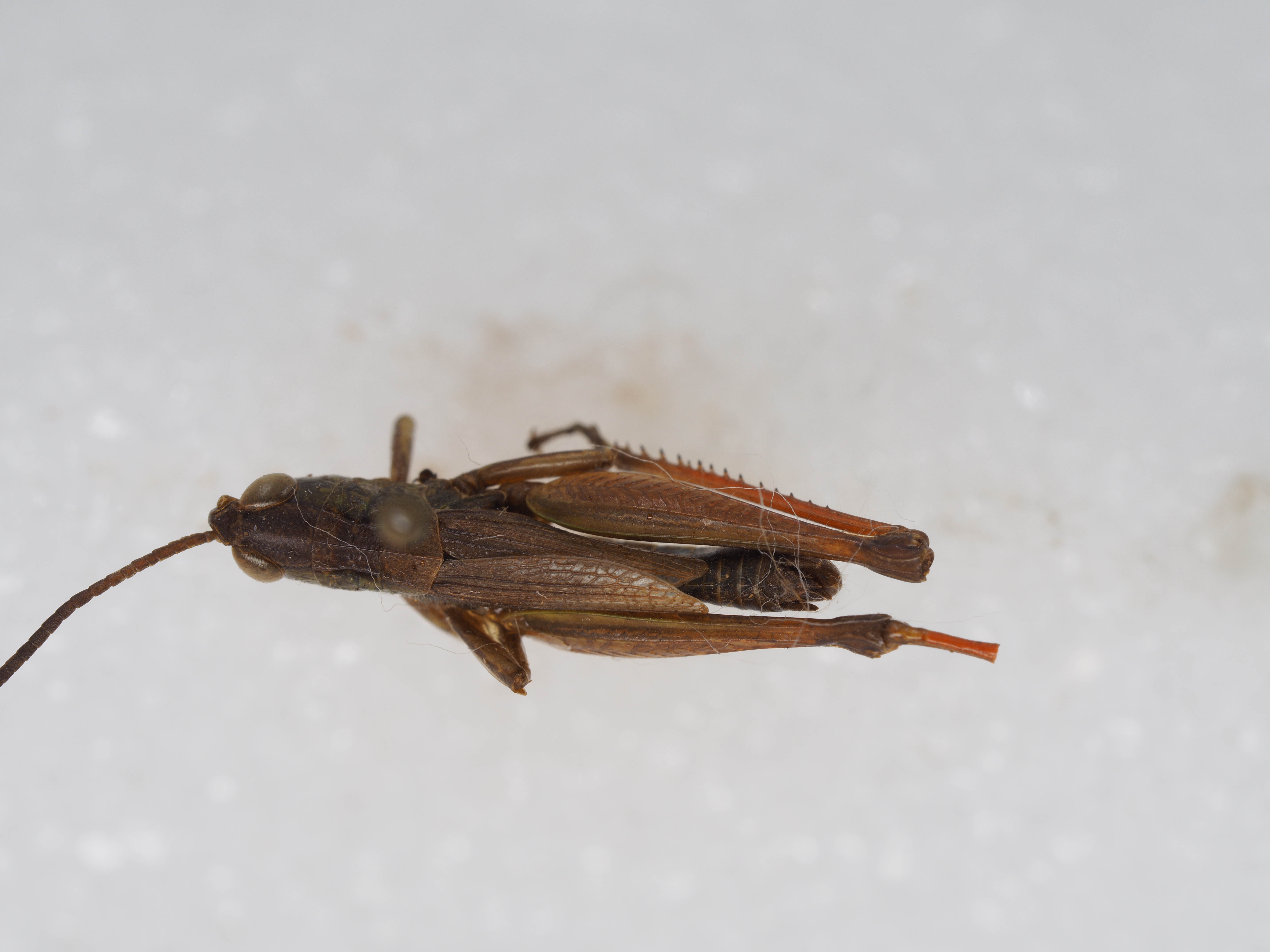 体色 棕褐色、绿褐色。前胸背板侧隆线两侧深褐色,眼后带不明显。后股节内、外侧土黄色,下侧橘红色,端部浅褐色。后足胫节和跗节橘红色。雄性下生殖板浅橘红色。