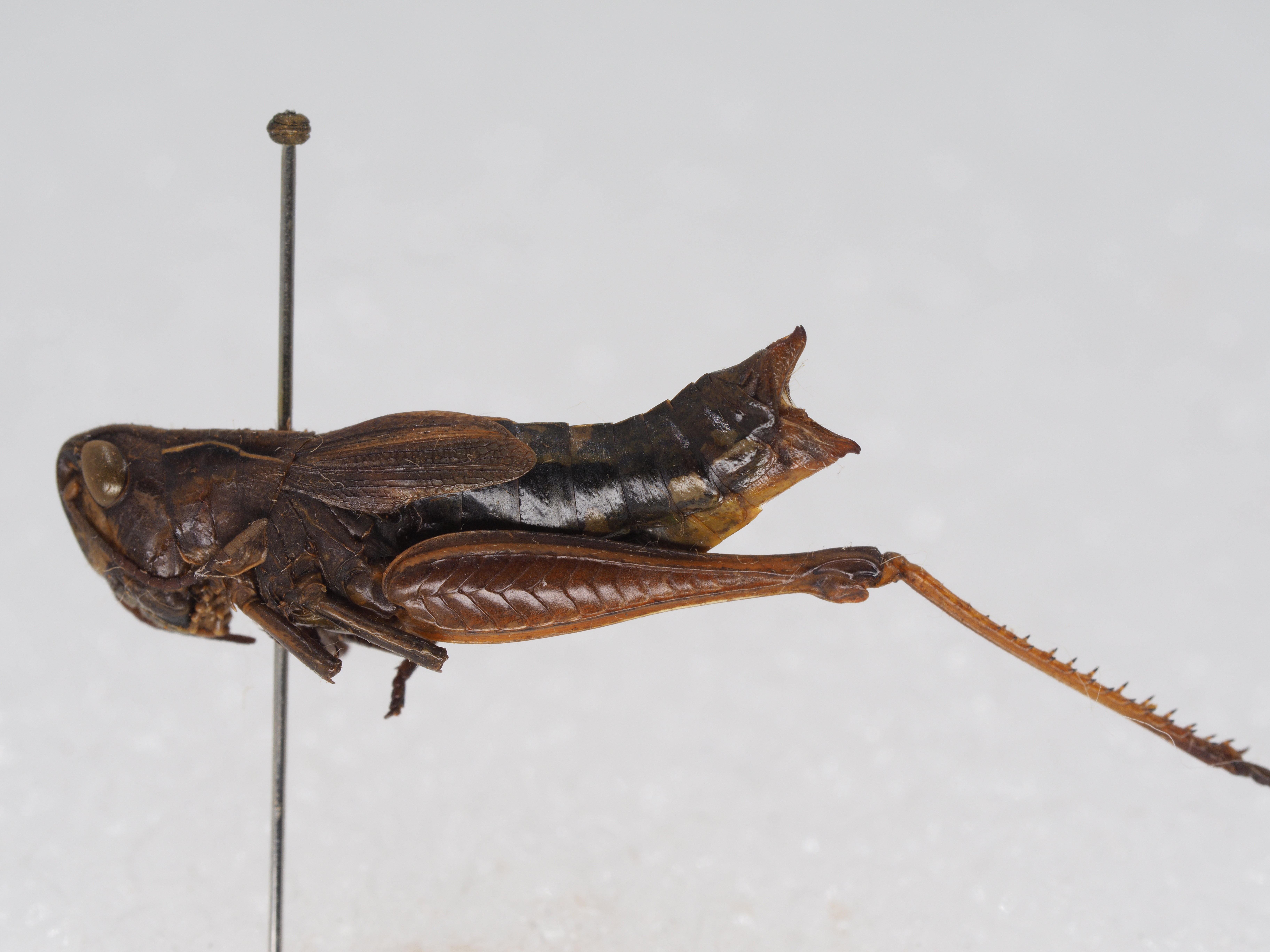 体色 棕褐色、绿褐色。前胸背板侧隆线两侧深褐色,眼后带不明显。后股节内、外侧土黄色,下侧橘红色,端部浅褐色。后足胫节和跗节橘红色。雄性下生殖板浅橘红色。