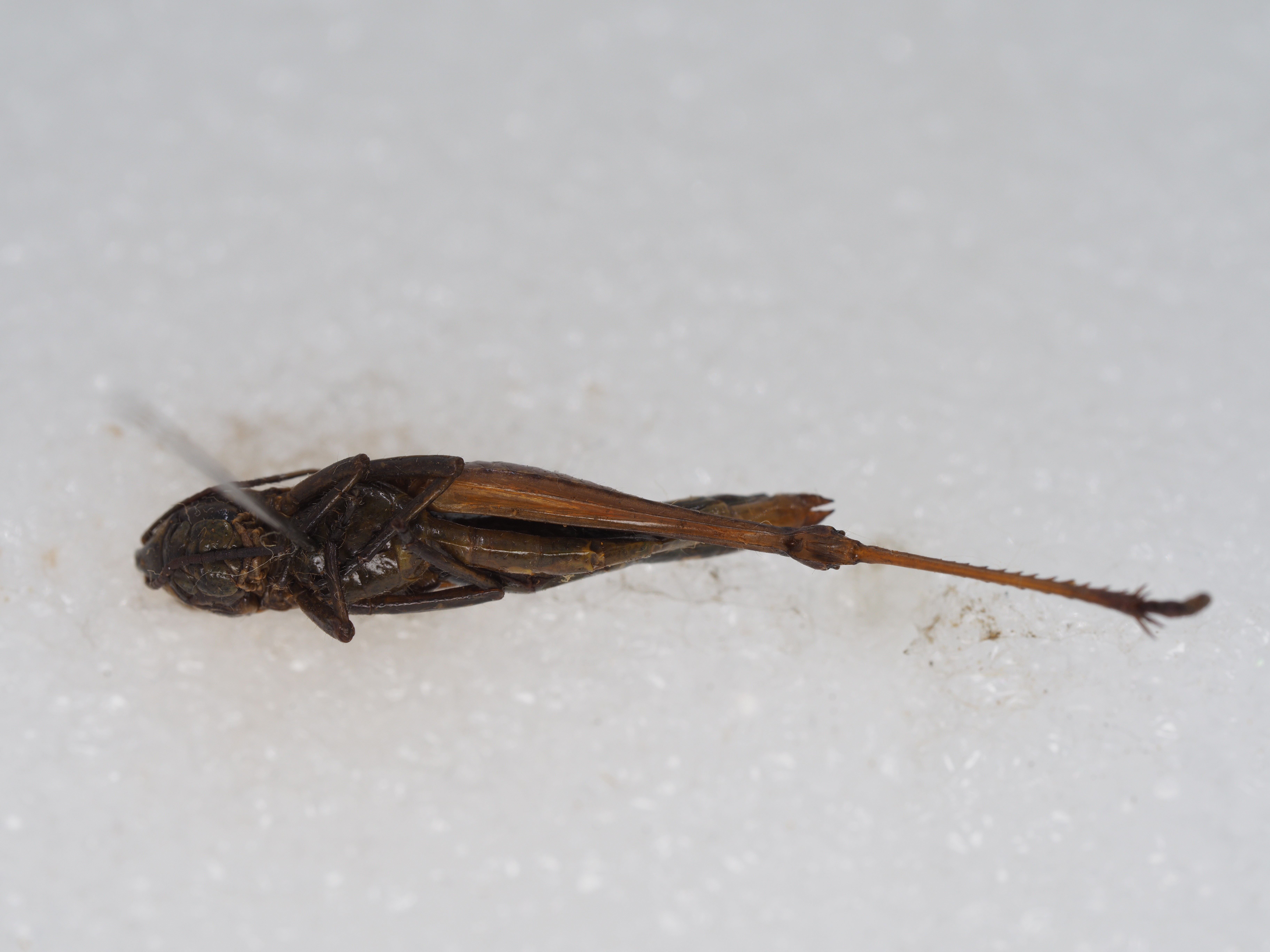 雌性 体较雄粗壮。触角到达或略超过前胸背板后缘。头侧窝长为宽的3.8倍。颜面隆起平坦,缺纵沟。复眼较小,略长于眼下沟。头顶前缘呈钝角形。前翅甚短,到达或略不到达第3腹节背板后缘;两前翅在基部背面稍分离;前翅长为宽的2倍;缘前脉域较宽,具闰脉,前缘脉域、中脉域及肘脉域也具闰脉。下生殖板后缘中央三角形突出。产卵瓣粗短,端部呈钩状。