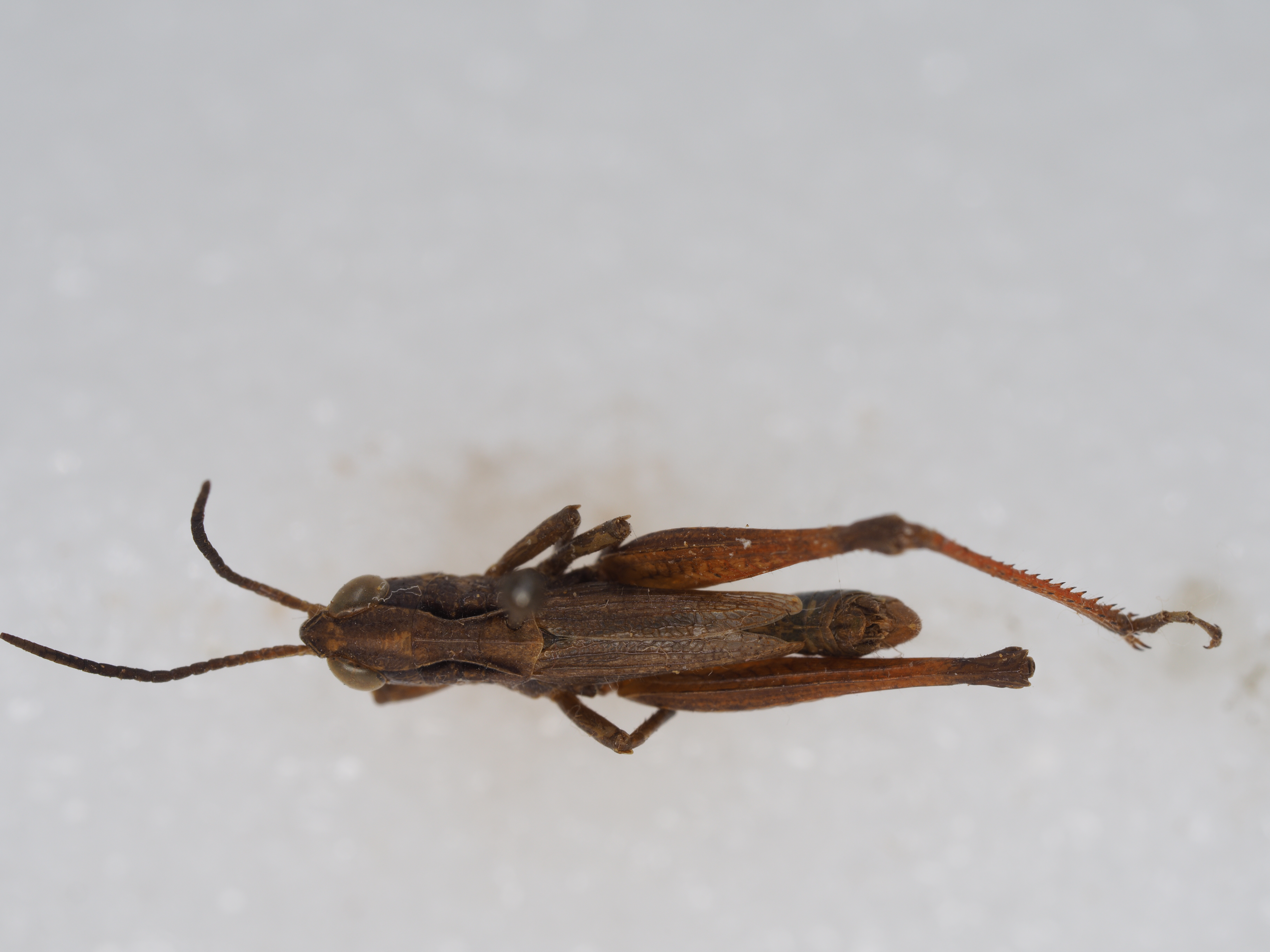 体色 棕褐色、绿褐色。前胸背板侧隆线两侧深褐色,眼后带不明显。后股节内、外侧土黄色,下侧橘红色,端部浅褐色。后足胫节和跗节橘红色。雄性下生殖板浅橘红色。