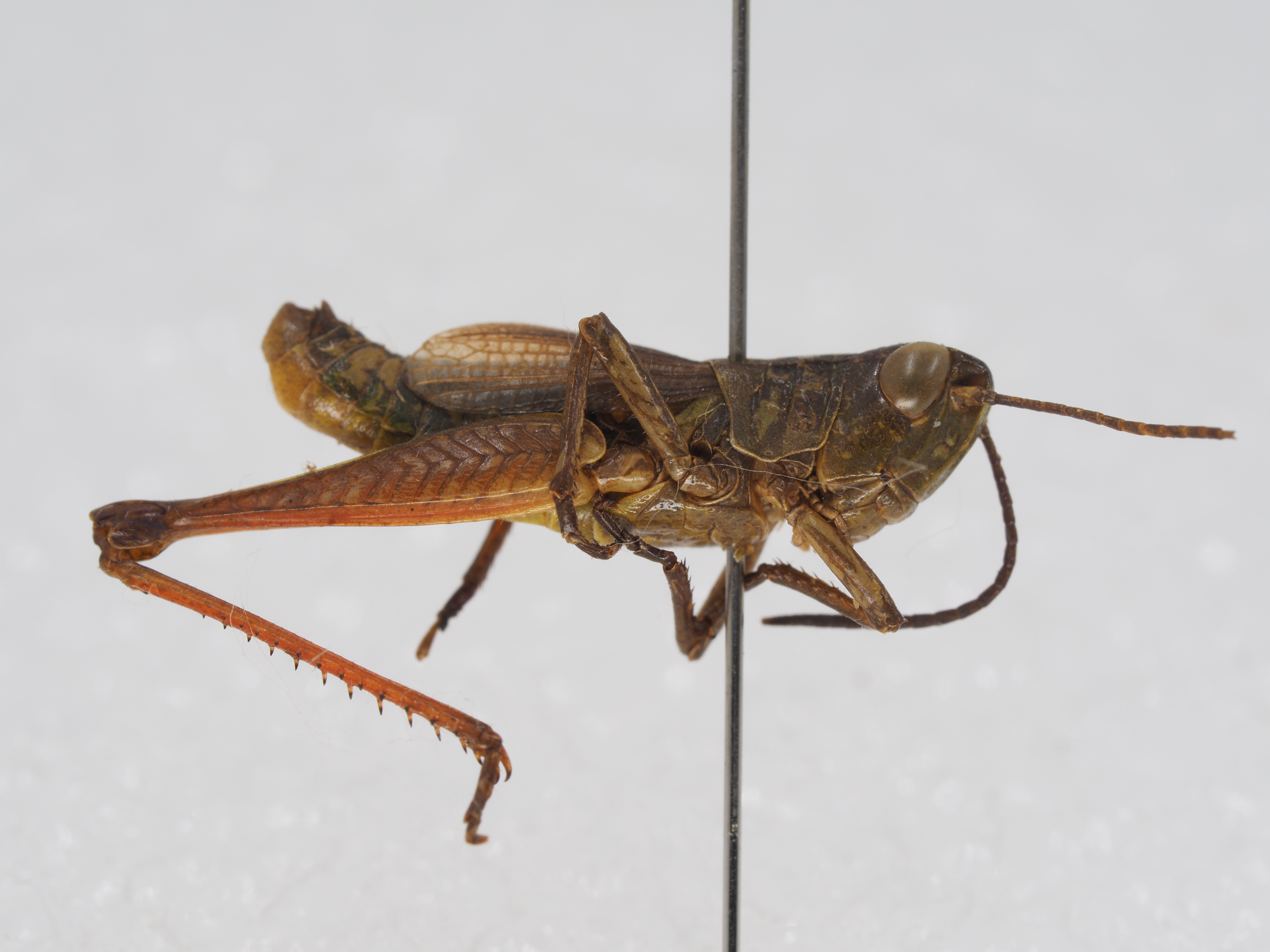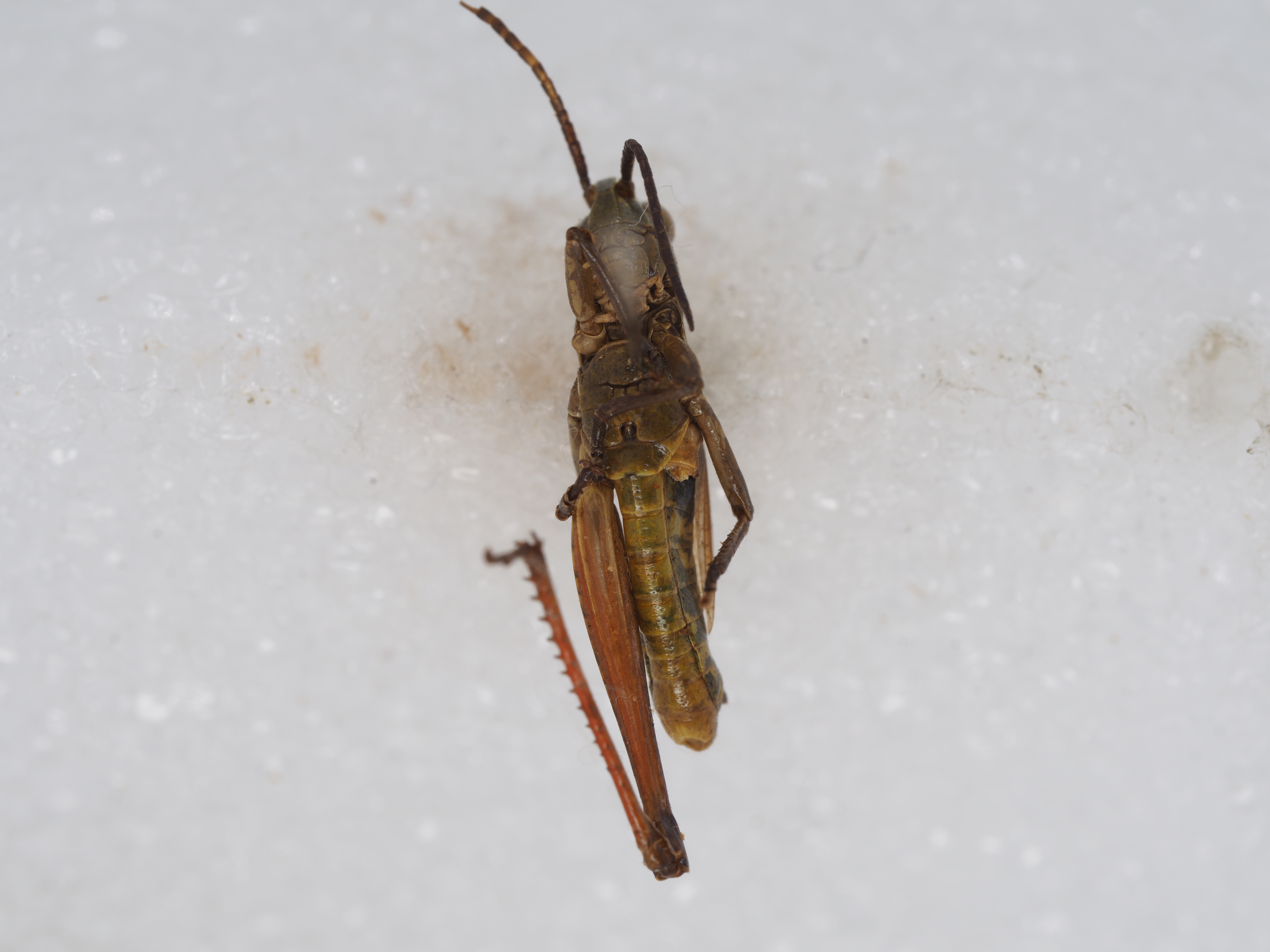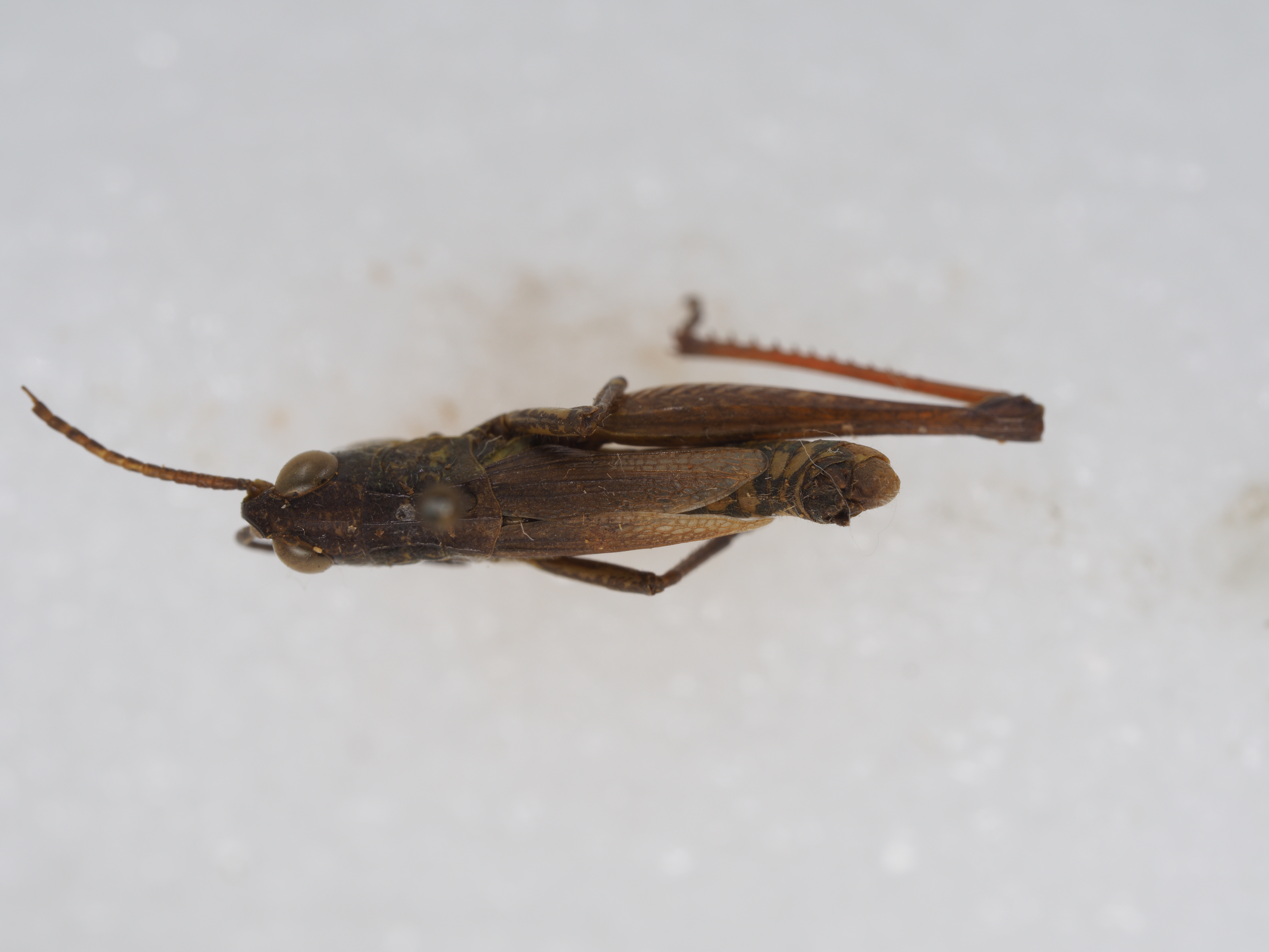 体色 棕褐色、绿褐色。前胸背板侧隆线两侧深褐色,眼后带不明显。后股节内、外侧土黄色,下侧橘红色,端部浅褐色。后足胫节和跗节橘红色。雄性下生殖板浅橘红色。