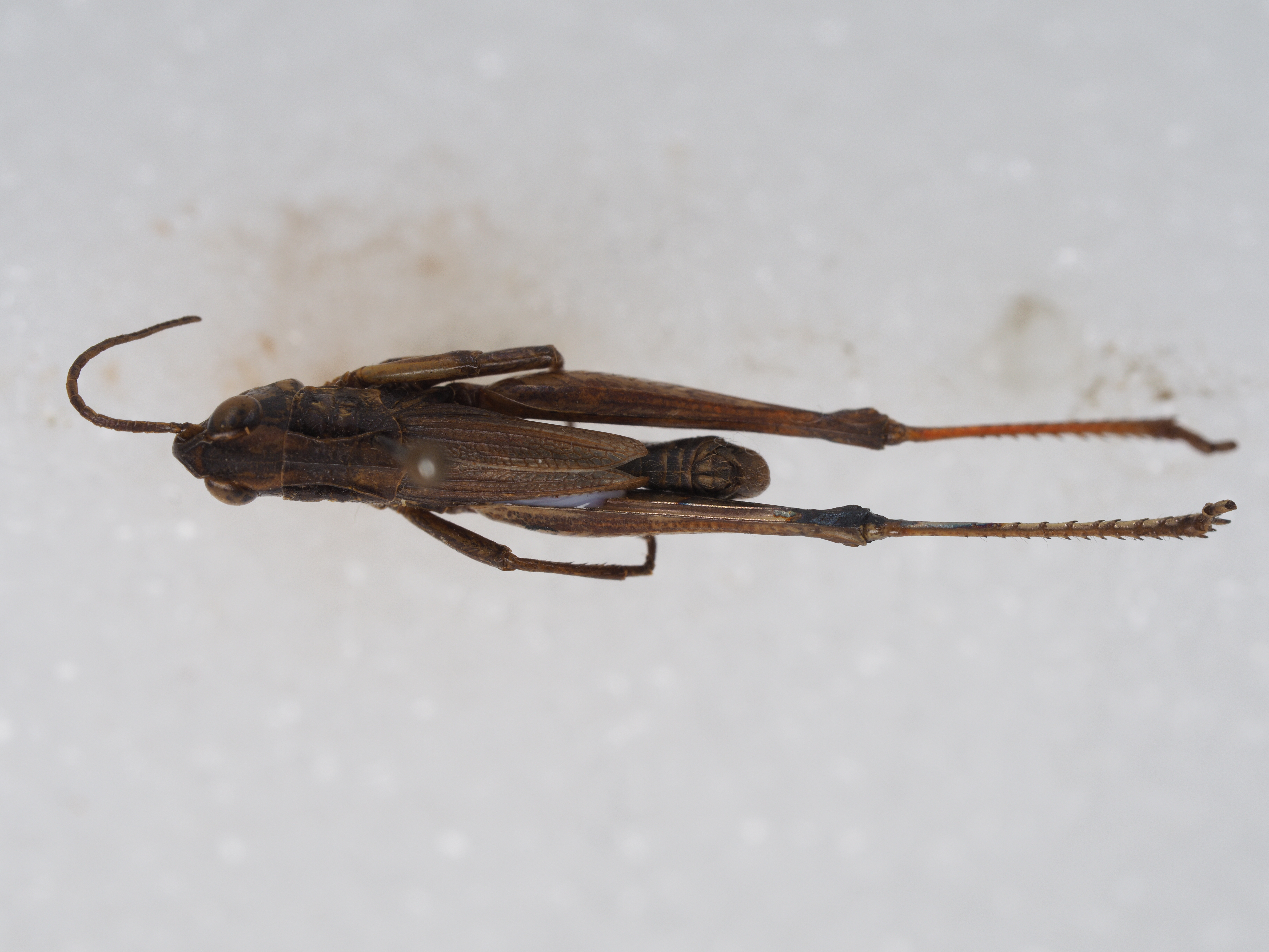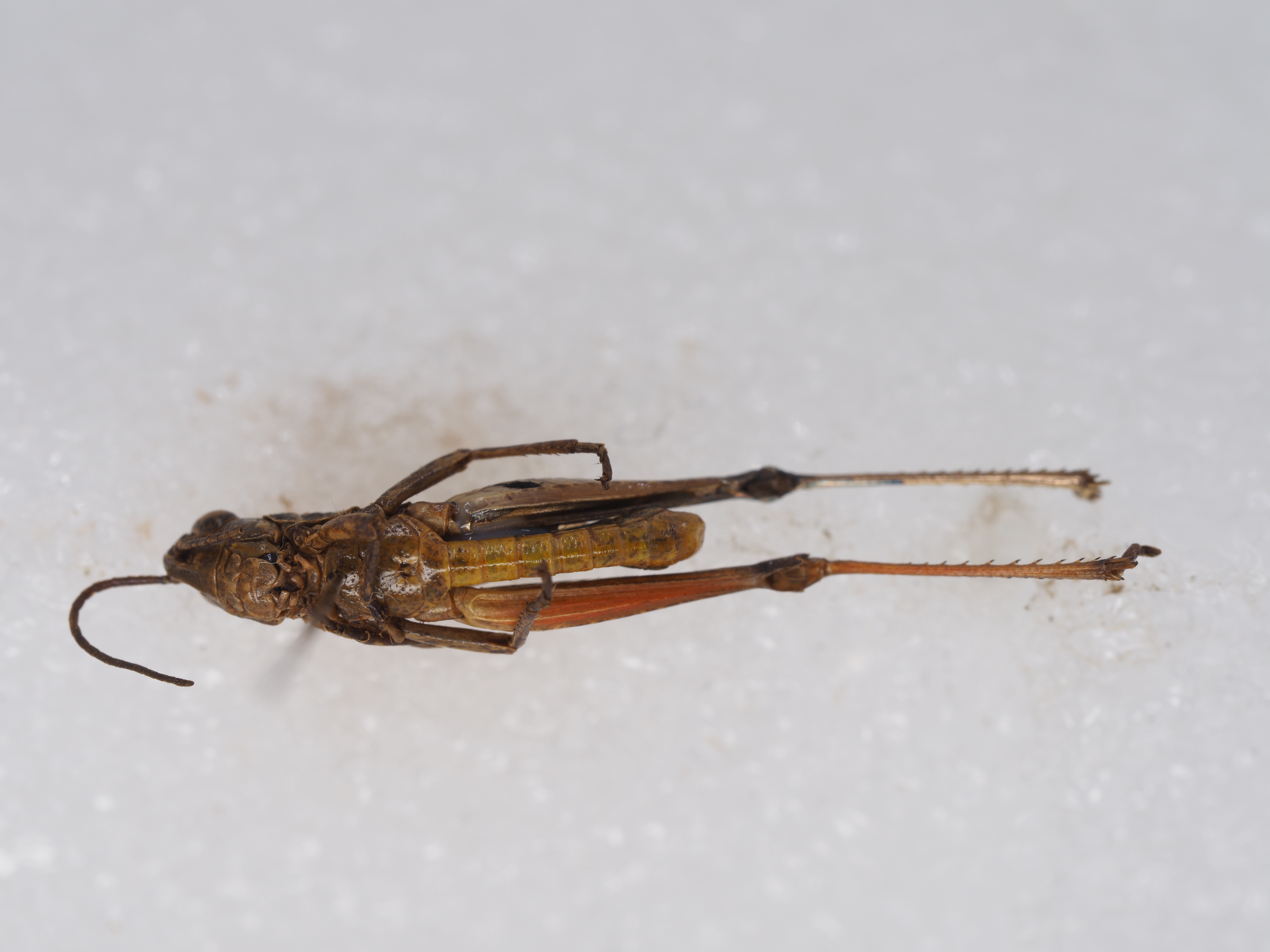 体色 棕褐色、绿褐色。前胸背板侧隆线两侧深褐色,眼后带不明显。后股节内、外侧土黄色,下侧橘红色,端部浅褐色。后足胫节和跗节橘红色。雄性下生殖板浅橘红色。