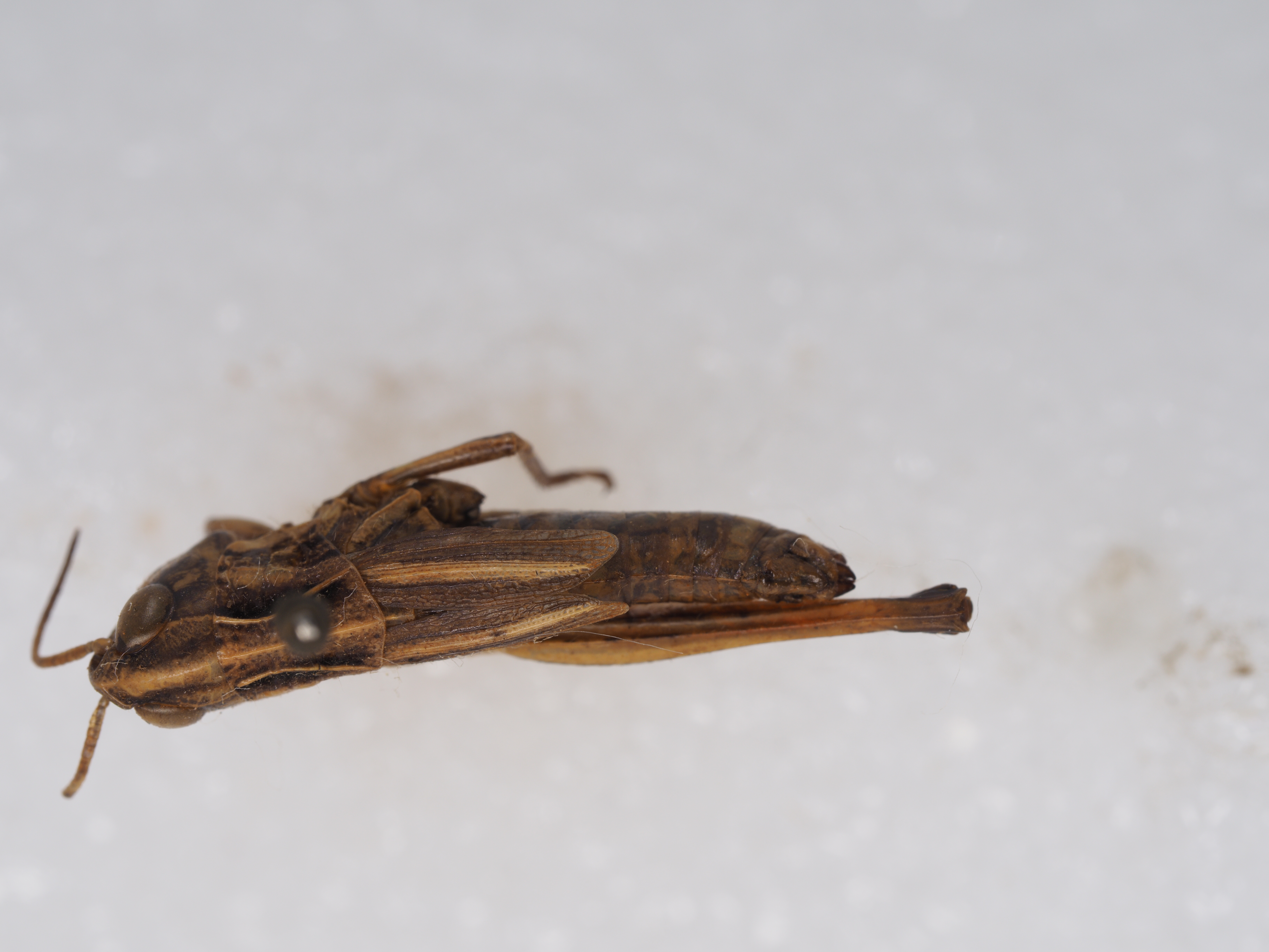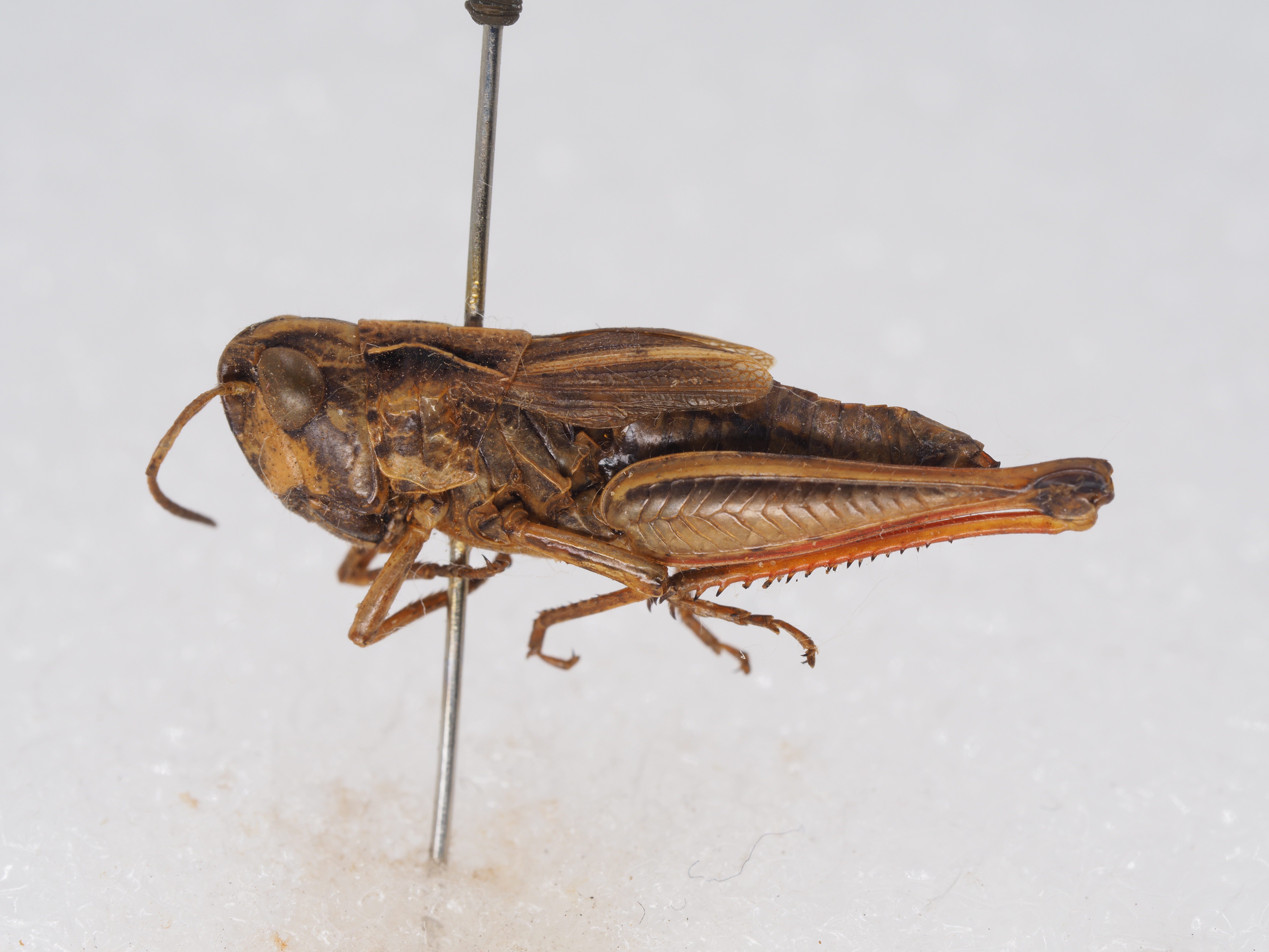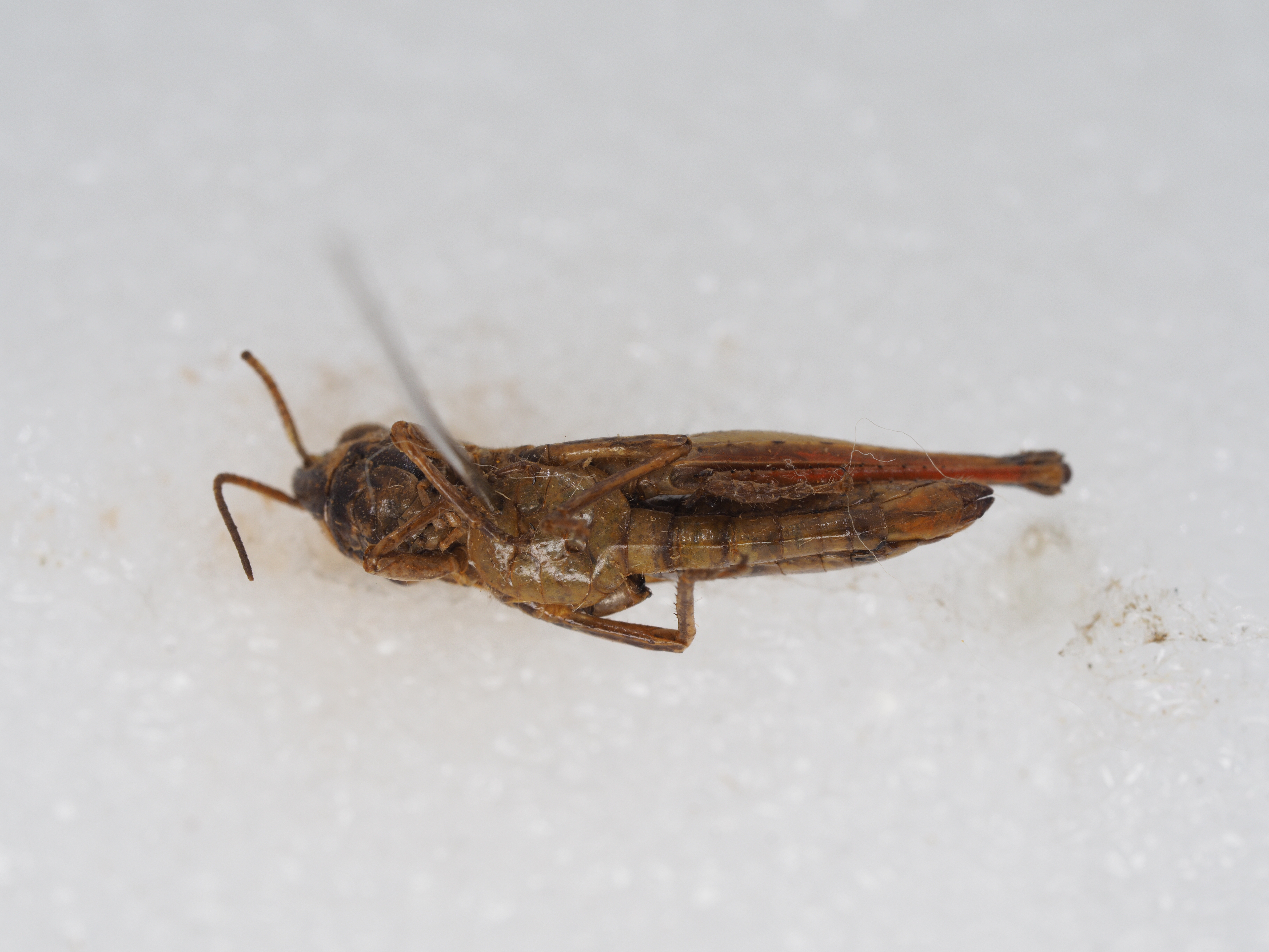 体色 棕褐色、绿褐色。前胸背板侧隆线两侧深褐色,眼后带不明显。后股节内、外侧土黄色,下侧橘红色,端部浅褐色。后足胫节和跗节橘红色。雄性下生殖板浅橘红色。