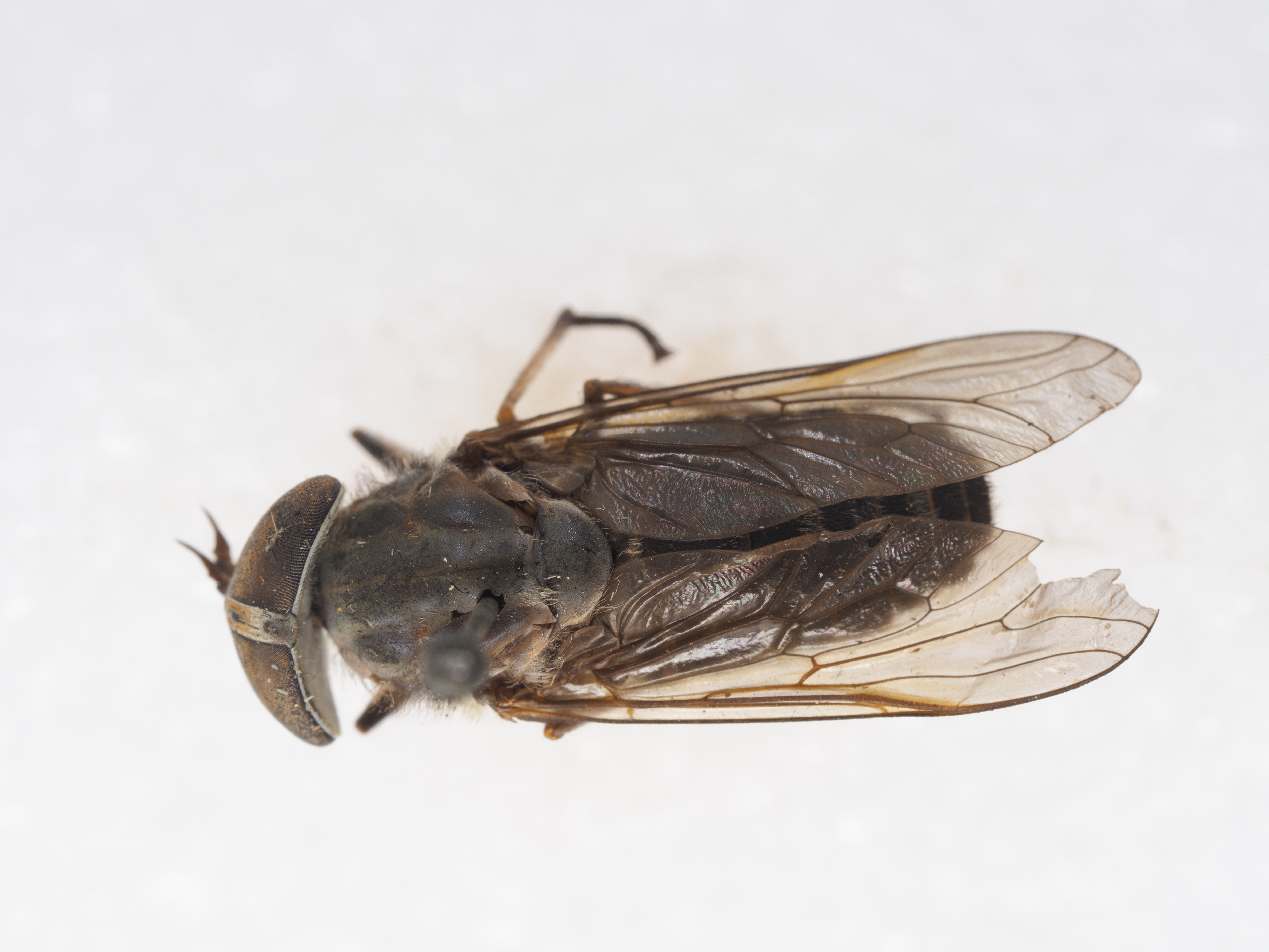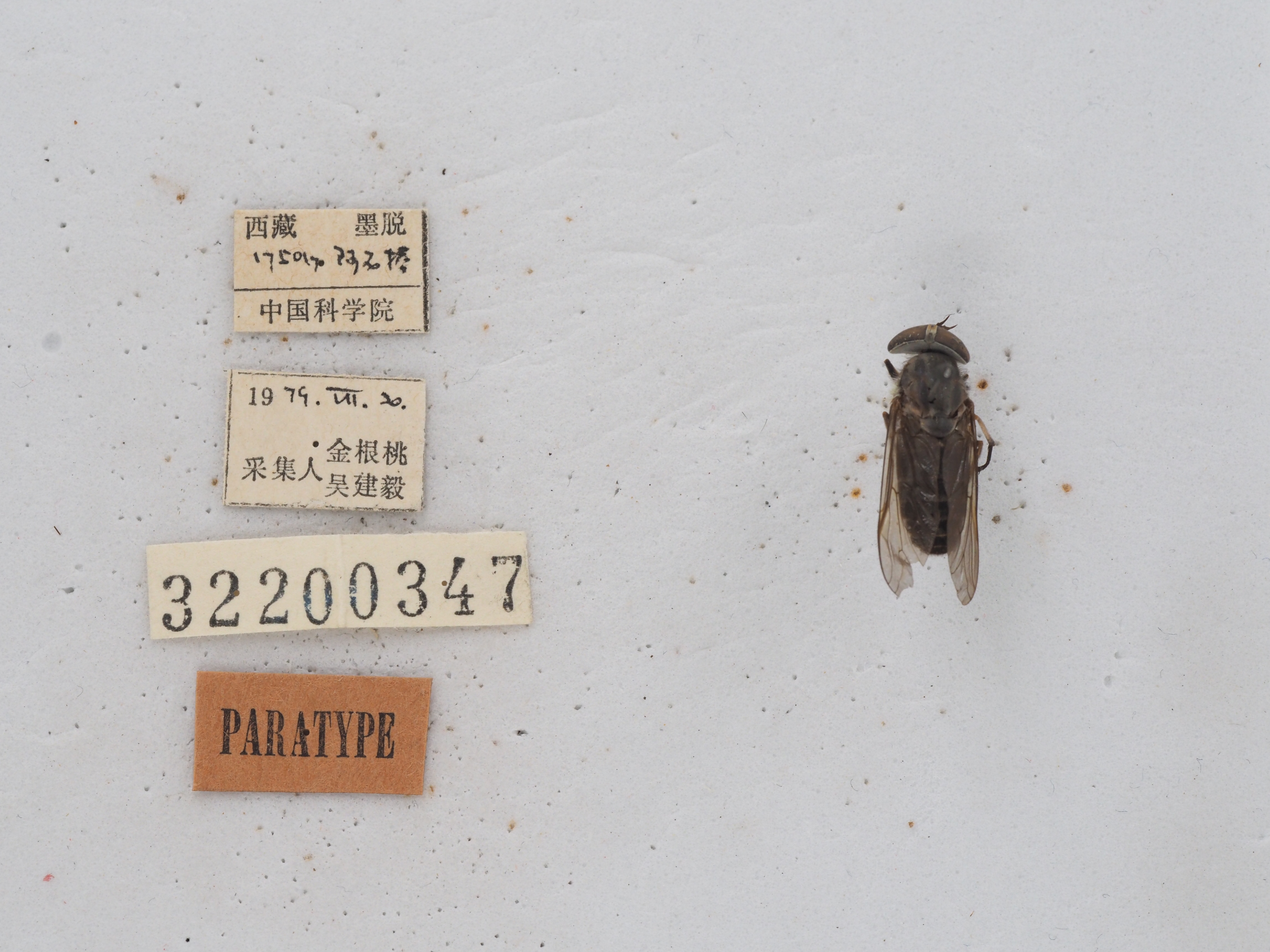 描述:雌虫体长15毫米黑色中型种。头部前额灰色,顶部灰黒色,顶端略宽于基部,高为基宽的5倍。基胛方形黑色具灿光,有6雌副模两侧上角突起,与亚胛接触,但不紧密,与眼分离。中胛棒形,与基胛有线形相连。颊沿眼边缘色同前额,但大部及脸灰白色,着生灰白毛及棕色毛。触角棕色,第1.2节色较深,着生黑毛,第3节第1环节长为宽的1.5倍,有直角突。下颚须第2节黄色,着生短黒毛,夹杂少量浅黄毛,长为最宽处宽度的3.5倍。