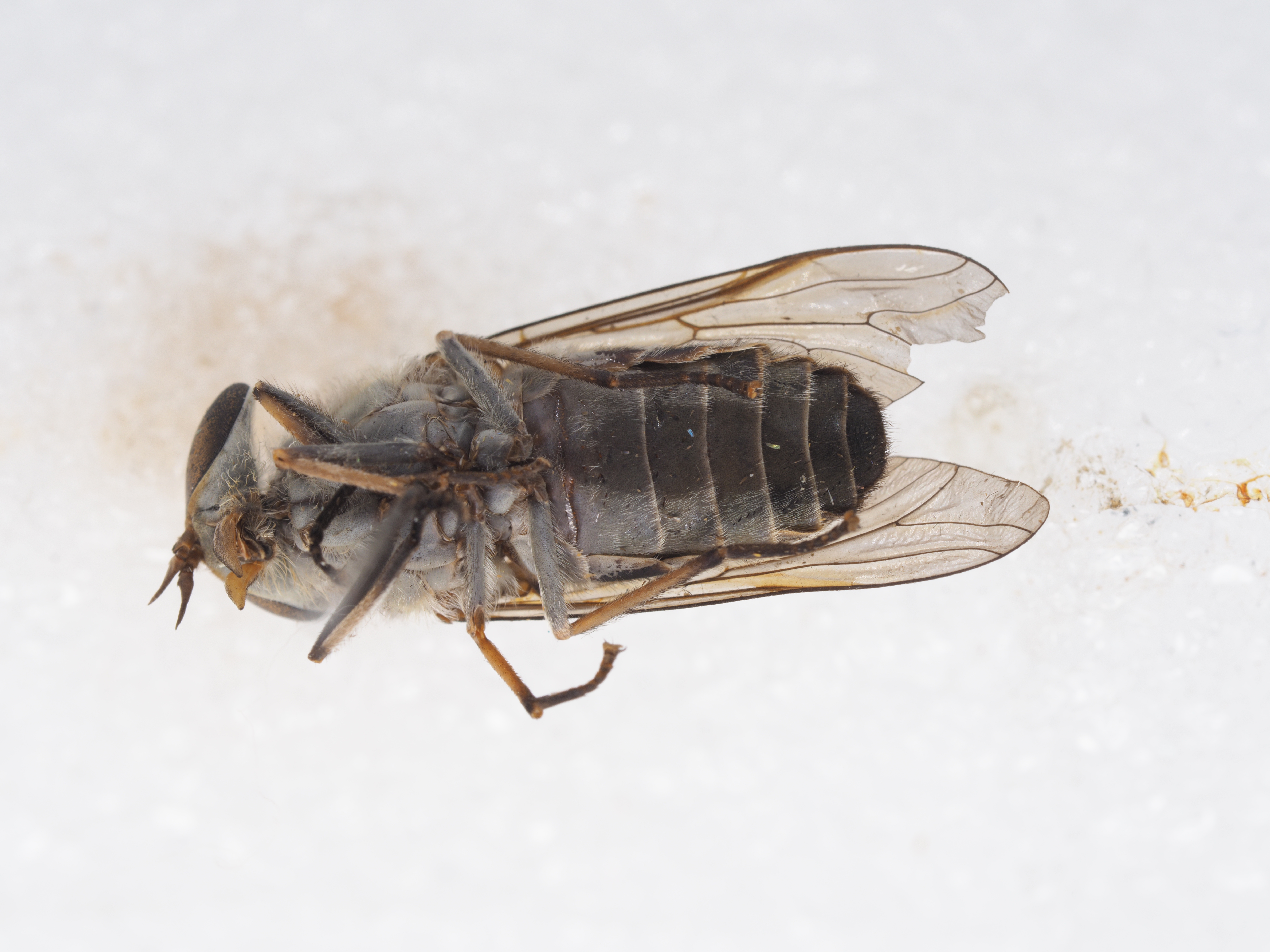 腹部背板黑色,2-5节中央具灰白色三角斑,与前节末端仅稍接触,2-4节两侧有灰白色斜斑,白斑处着生白毛,背板黑色部分着生黑毛。腹板黑色,覆灰粉被,两侧灰白色,中央灰黑色,形成深色纵条。