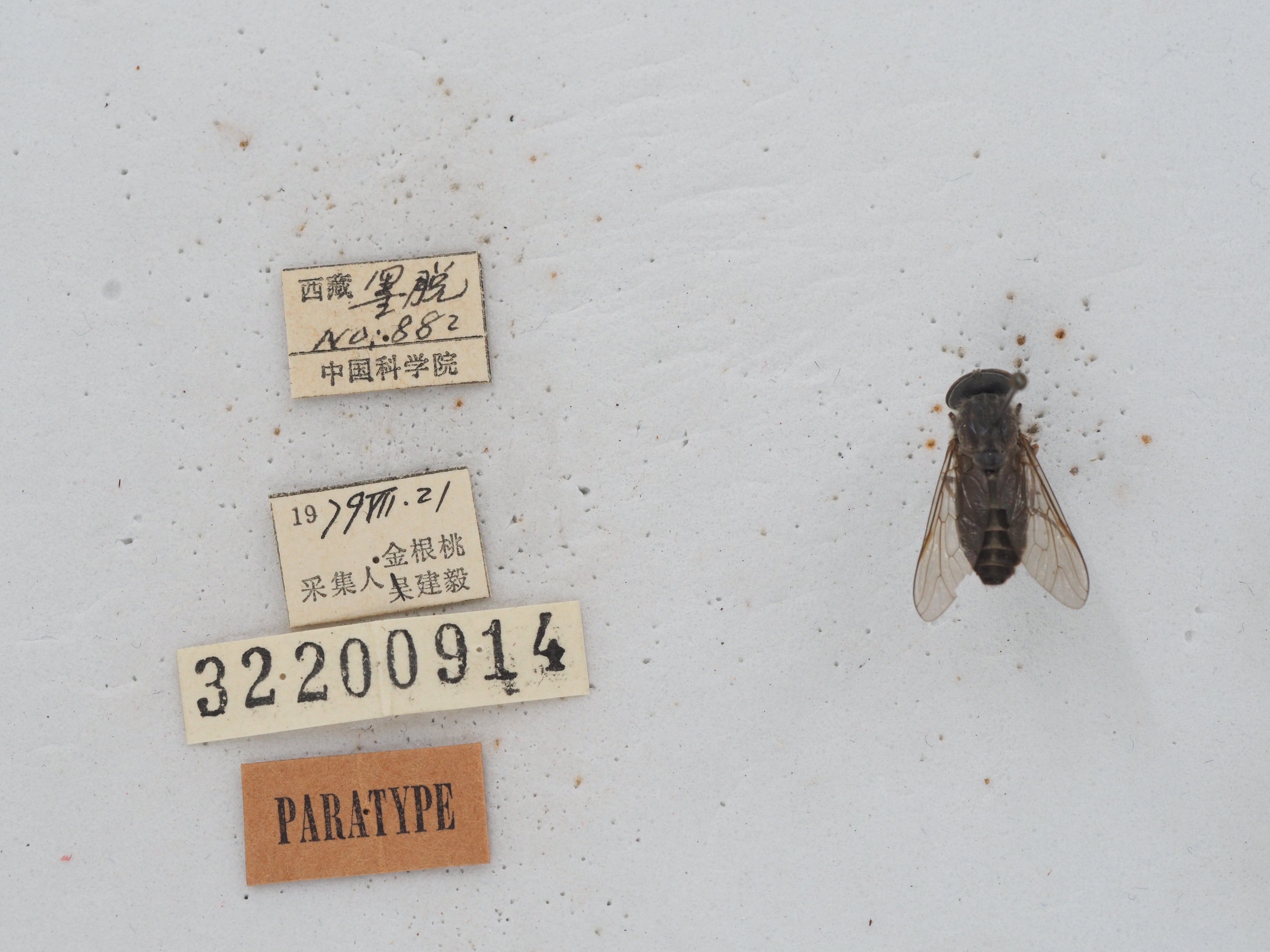 描述:雌虫体长15毫米黑色中型种。头部前额灰色,顶部灰黒色,顶端略宽于基部,高为基宽的5倍。基胛方形黑色具灿光,有6雌副模两侧上角突起,与亚胛接触,但不紧密,与眼分离。中胛棒形,与基胛有线形相连。颊沿眼边缘色同前额,但大部及脸灰白色,着生灰白毛及棕色毛。触角棕色,第1.2节色较深,着生黑毛,第3节第1环节长为宽的1.5倍,有直角突。下颚须第2节黄色,着生短黒毛,夹杂少量浅黄毛,长为最宽处宽度的3.5倍。